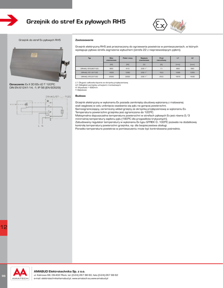 Grzejnik do stref Ex pyłowych RH5 Grzejnik do stref Ex pyłowych RH5 Zastosowanie Grzejnik elektryczny RH5 jest przeznaczony do ogrzewania powietrza w pomieszczeniach, w których występuje pyłowa strefa zagrożenia wybuchem (strefa 22 z nieprzewodzącym pyłem). Oznaczenie: Ex II 3D EEx tD T 120oC DIN EN 61241-14, -1; IP 56 (EN 60529) Typ Moc znamionowa Pobór mocy [W] [W] DRHA0/ST-0,85-T120 850 610 DRHA0/ST-1,6-T120 1600 1280 DRHA0/ST-2,5-T120 2500 2000 Napięcie znamionowe Prąd rozruchowy L1 L2 [V] [A] [mm] [mm] 230 1~ 7,1 800 560 230 1~ 16,0 1295 1055 230 1~ 25,0 1870 1630 L1: Długość całkowita łącznie ze skrzynką przyłączeniową L2: Odległość pomiędzy uchwytami montażowymi H: Wysokość = 690mm T: Głębokość Budowa Grzejnik elektryczny w wykonaniu Ex posiada zamkniętą obudową wykonaną z malowanej stali węglowej w celu uniknięcia osadzania się pyłu na gorącej powierzchni. Samoograniczający, ceramiczny wkład grzejny ze skrzynką przyłączeniową w wykonaniu Ex. Temperatura powierzchni grzejnika jest ograniczona do 120oC. Maksymalna dopuszczalna temperatura powierzchni w strefach pyłowych Ex jest równa 2/3 minimalnej temperatury zapłonu pyłu (180oC dla przypadków krytycznych). Zabudowany regulator temperatury w wykonaniu Ex typu QTREK 0...100oC pozwala na dodatkową kontrolę temperatury powierzchni grzejnika, np. dla bezpieczestwa obsługi. Ponadto temperatura powietrza w pomieszczeniu może być kontrolowana pośrednio. 12 AMABUD Elektrotechnika Sp. z o.o. 96 ul. Kalinowa 68, 09-402 Płock, tel. (0-24) 267 88 60, faks (0-24) 267 88 62 e-mail: [email protected], www.amatech.eu,www.amabud.pl