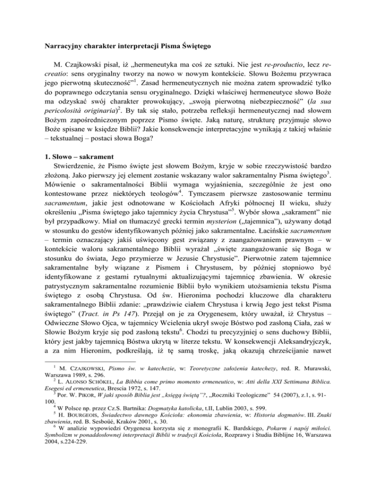 Narracyjny charakter interpretacji Pisma Świętego M. Czajkowski pisał, iż „hermeneutyka ma coś ze sztuki. Nie jest re-productio, lecz recreatio: sens oryginalny tworzy na nowo w nowym kontekście. Słowu Bożemu przywraca jego pierwotną skuteczność”1. Zasad hermeneutycznych nie można zatem sprowadzić tylko do poprawnego odczytania sensu oryginalnego. Dzięki właściwej hermeneutyce słowo Boże ma odzyskać swój charakter prowokujący, „swoją pierwotną niebezpieczność” (la sua pericolosità originaria)2. By tak się stało, potrzeba refleksji hermeneutycznej nad słowem Bożym zapośredniczonym poprzez Pismo święte. Jaką naturę, strukturę przyjmuje słowo Boże spisane w księdze Biblii? Jakie konsekwencje interpretacyjne wynikają z takiej właśnie – tekstualnej – postaci słowa Boga? 1. Słowo – sakrament Stwierdzenie, że Pismo święte jest słowem Bożym, kryje w sobie rzeczywistość bardzo złożoną. Jako pierwszy jej element zostanie wskazany walor sakramentalny Pisma świętego3. Mówienie o sakramentalności Biblii wymaga wyjaśnienia, szczególnie że jest ono kontestowane przez niektórych teologów4. Tymczasem pierwsze zastosowanie terminu sacramentum, jakie jest odnotowane w Kościołach Afryki północnej II wieku, służy określeniu „Pisma świętego jako tajemnicy życia Chrystusa”5. Wybór słowa „sakrament” nie był przypadkowy. Miał on tłumaczyć grecki termin mysterion („tajemnica”), używany dotąd w stosunku do gestów identyfikowanych później jako sakramentalne. Łacińskie sacramentum – termin oznaczający jakiś uświęcony gest związany z zaangażowaniem prawnym – w kontekście waloru sakramentalnego Biblii wyrażał „święte zaangażowanie się Boga w stosunku do świata, Jego przymierze w Jezusie Chrystusie”. Pierwotnie zatem tajemnice sakramentalne były wiązane z Pismem i Chrystusem, by później stopniowo być identyfikowane z gestami rytualnymi aktualizującymi tajemnicę zbawienia. W okresie patrystycznym sakramentalne rozumienie Biblii było wynikiem utożsamienia tekstu Pisma świętego z osobą Chrystusa. Od św. Hieronima pochodzi kluczowe dla charakteru sakramentalnego Biblii zdanie: „prawdziwie ciałem Chrystusa i krwią Jego jest tekst Pisma świętego” (Tract. in Ps 147). Przejął on je za Orygenesem, który uważał, iż Chrystus – Odwieczne Słowo Ojca, w tajemnicy Wcielenia ukrył swoje Bóstwo pod zasłoną Ciała, zaś w Słowie Bożym kryje się pod zasłoną tekstu6. Chodzi tu precyzyjniej o sens duchowy Biblii, który jest jakby tajemnicą Bóstwa ukrytą w literze tekstu. W konsekwencji Aleksandryjczyk, a za nim Hieronim, podkreślają, iż tę samą troskę, jaką okazują chrześcijanie nawet 1 M. CZAJKOWSKI, Pismo św. w katechezie, w: Teoretyczne założenia katechezy, red. R. Murawski, Warszawa 1989, s. 296. 2 L. ALONSO SCHÖKEL, La Bibbia come primo momento ermeneutico, w: Atti della XXI Settimana Biblica. Esegesi ed ermeneutica, Brescia 1972, s. 147. 3 Por. W. PIKOR, W jaki sposób Biblia jest „księgą świętą”?, „Roczniki Teologiczne” 54 (2007), z.1, s. 91100. 4 W Polsce np. przez Cz.S. Bartnika: Dogmatyka katolicka, t.II, Lublin 2003, s. 599. 5 H. BOURGEOIS, Świadectwo dawnego Kościoła: ekonomia zbawienia, w: Historia dogmatów. III. Znaki zbawienia, red. B. Sesboüé, Kraków 2001, s. 30. 6 W analizie wypowiedzi Orygenesa korzysta się z monografii K. Bardskiego, Pokarm i napój miłości. Symbolizm w ponaddosłownej interpretacji Biblii w tradycji Kościoła, Rozprawy i Studia Biblijne 16, Warszawa 2004, s.224-229. najmniejszym cząstkom postaci eucharystycznych, winni odnosić do słów Biblii. Jest to jedyny przypadek w historii egzegezy alegorystycznej, kiedy to nastąpiło odwrócenie konwencjonalnego mechanizmu symbolizmu ponaddosłownego: to nie Ciało i Krew symbolizują Słowo Boże, ale Słowo Boże symbolizuje Ciało i Krew Chrystusa. Zatem w przypadku Eucharystii i Pisma świętego chodziłoby o tę samą obecność Chrystusa, jakkolwiek pod różnymi znakami. W świetle pierwotnego zastosowania terminu „sakrament” wynika, iż odnoszenie go do Pisma świętego było związane z charakterem tego słowa, które nie tylko wyrażało tajemnicę (sacramentum) Chrystusa, ale było postrzegane jako symbol Jego Ciała, porównywany z Jego postaciami eucharystycznymi. Chrystologiczne spojrzeniu na Pismo święte w okresie patrystycznym znajduje najpełniejszy swój wyraz w wypowiedzi św. Hieronima: „Nieznajomość Pisma świętego jest nieznajomością Chrystusa” (Comm. in Is, prol.). Sakramentalny walor Pisma świętego przypomniał na nowo Sobór Watykański II, podkreślając wieloraką obecność Chrystusa w akcji liturgicznej Kościoła. W Konstytucji o liturgii świętej Sacrosanctum Concilium stwierdza, że „Chrystus jest obecny zawsze w swoim Kościele, zwłaszcza w czynnościach liturgicznych. [...] Jest obecny w swoim słowie, bo gdy w Kościele czyta się Pismo święte, On sam przemawia” (KL 7)7. Kwestię obecności Chrystusa w Piśmie świętym w kontekście liturgii podejmuje też Konstytucja dogmatyczna o Objawieniu Bożym Dei Verbum: „Kościół zawsze otaczał czcią Boże Pisma, podobnie jak i samo Ciało Pańskie. Zwłaszcza w liturgii świętej bierze ciągle chleb życia ze stołu Bożego słowa i Ciała Chrystusowego, i podaje wierzącym” (KO 21). Powyższe dokumenty Kościoła wydają się ograniczać charakter sakramentalny Pisma świętego tylko do czynności kultycznych Kościoła. Pismo święte przygotowuje bowiem sprawowanie sakramentu, zaś jego celebracja to słowo aktualizuje. Tę perspektywę chrystologiczno-liturgiczną należy jednak poszerzyć o wymiar pneumatologiczny, decydujący o skuteczności słowa Pisma: „Słowo Boże, stale głoszone w liturgii, jest żywe i skuteczne (Hbr 4,12) dzięki mocy Ducha Świętego”8. Zatem zbawcze, sakramentalne działanie Pisma świętego wynikało