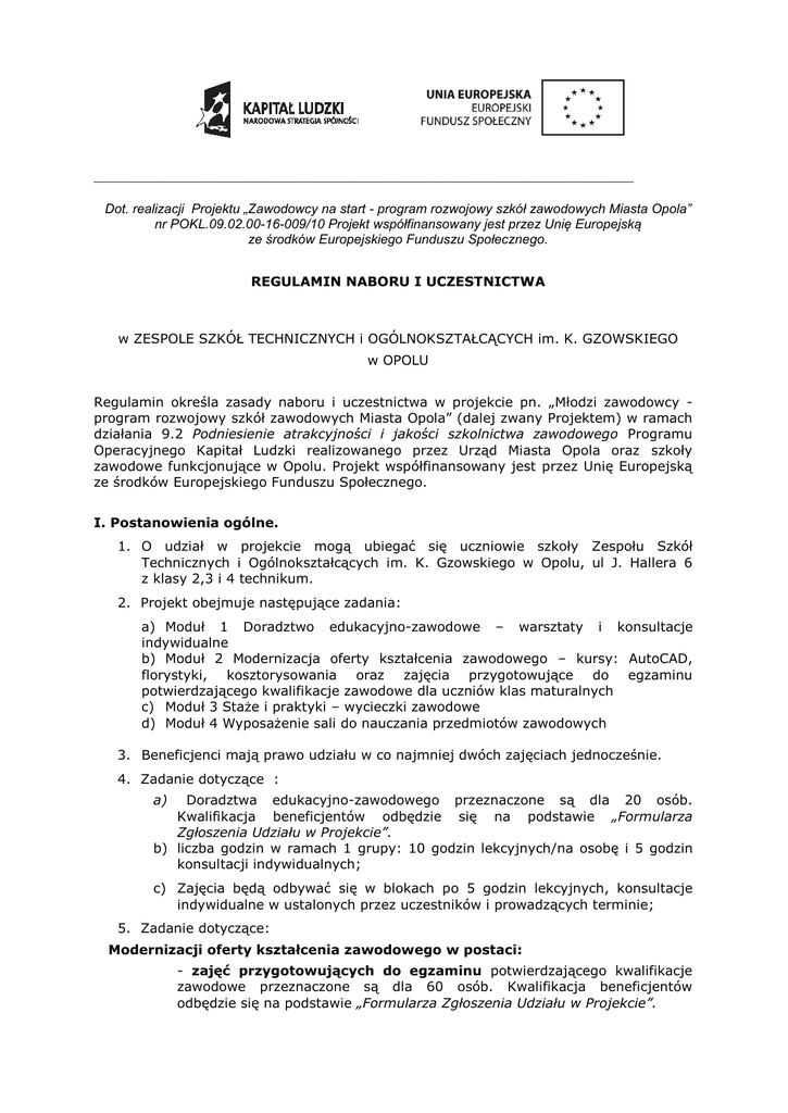 ____________________________________________________________________ Dot. realizacji Projektu „Zawodowcy na start - program rozwojowy szkół zawodowych Miasta Opola” nr POKL.09.02.00-16-009/10 Projekt współfinansowany jest przez Unię Europejską ze środków Europejskiego Funduszu Społecznego. REGULAMIN NABORU I UCZESTNICTWA w ZESPOLE SZKÓŁ TECHNICZNYCH i OGÓLNOKSZTAŁCĄCYCH im. K. GZOWSKIEGO w OPOLU Regulamin określa zasady naboru i uczestnictwa w projekcie pn. „Młodzi zawodowcy program rozwojowy szkół zawodowych Miasta Opola” (dalej zwany Projektem) w ramach działania 9.2 Podniesienie atrakcyjności i jakości szkolnictwa zawodowego Programu Operacyjnego Kapitał Ludzki realizowanego przez Urząd Miasta Opola oraz szkoły zawodowe funkcjonujące w Opolu. Projekt współfinansowany jest przez Unię Europejską ze środków Europejskiego Funduszu Społecznego. I. Postanowienia ogólne. 1. O udział w projekcie mogą ubiegać się uczniowie szkoły Zespołu Szkół Technicznych i Ogólnokształcących im. K. Gzowskiego w Opolu, ul J. Hallera 6 z klasy 2,3 i 4 technikum. 2. Projekt obejmuje następujące zadania: a) Moduł 1 Doradztwo edukacyjno-zawodowe – warsztaty i konsultacje indywidualne b) Moduł 2 Modernizacja oferty kształcenia zawodowego – kursy: AutoCAD, florystyki, kosztorysowania oraz zajęcia przygotowujące do egzaminu potwierdzającego kwalifikacje zawodowe dla uczniów klas maturalnych c) Moduł 3 Staże i praktyki – wycieczki zawodowe d) Moduł 4 Wyposażenie sali do nauczania przedmiotów zawodowych 3. Beneficjenci mają prawo udziału w co najmniej dwóch zajęciach jednocześnie. 4. Zadanie dotyczące : a) Doradztwa edukacyjno-zawodowego przeznaczone są dla 20 osób. Kwalifikacja beneficjentów odbędzie się na podstawie „Formularza Zgłoszenia Udziału w Projekcie”. b) liczba godzin w ramach 1 grupy: 10 godzin lekcyjnych/na osobę i 5 godzin konsultacji indywidualnych; c) Zajęcia będą odbywać się w blokach po 5 godzin lekcyjnych, konsultacje indywidualne w ustalonych przez uczestników i prowadzących terminie; 5. Zadanie dotyczące: Modernizacji oferty kształcenia zawodowego w postaci: - zajęć przygotowujących do egzaminu potwierdzającego kwalifikacje zawodowe przeznaczone są dla 60 osób. Kwalifikacja beneficjentów odbędzie się na podstawie „Formularza Zgłoszenia Udziału w Projekcie”. a) liczba godzin w ramach 1 grupy: 40 godzin lekcyjnych/ na osobę w klasie 4 budowlane, 30 godzin lekcyjnych w klasie 4 geodezyjnej, 30 godzin lekcyjnych w klasie 4 architektury krajobrazu, b) Zajęcia będą odbywać się w 6 godzinnych blokach; c) Beneficjentom zapewnione zostaną bezpłatnie materiały edukacyjne - kursów dających nowe kwalifikacje przeznaczone są dla 75 osób. Kwalifikacja beneficjentów odbędzie się na podstawie „Formularza Zgłoszenia Udziału w Projekcie” a) liczba godzin: 40 godzin lekcyjnych/ na osobę = kurs AutoCAD podstawowy – 2 grupy 15 osobowe; 30 godzin lekcyjnych = kurs AutoCAD kontynuacyjny – 1 grupa 15 osobowa 30 godzin lekcyjnych = kurs kosztorysowania – 1 grupa 15 osobowa 35 godzin lekcyjnych = kurs florystyki – 1 grupa 15 osobowa b) Zajęcia będą odbywać się w 7 i 8 godzinnych blokach; 6. Zadanie dotyczące : Staży i praktyk zawodowych przeznaczone są dla 50 osób w postaci dwóch 2dniowych wycieczek zawodowych do firm budowlanych gdzie uczniowie przejdą 15 godzinne szkolenie teoretyczno-praktyczne. Kwalifikacja beneficjentów odbędzie się na podstawie „Formularza Zgłoszenia Udziału w Projekcie”. a) liczba godzin w ramach 1 grupy:15 godzin lekcyjnych/ na osobę; 7. Zadanie dotyczące : – zakup nowoczesnego przedmiotów budowlanych sprzętu (laptop, rzutnik) wspierającego nauczanie II. Kryteria wyboru beneficjentów projektu oraz warunki ich uczestnictwa w projekcie. 1. Informacja o terminie rekrutacji zostanie ogłoszona na stronie internetowej projektu, stronie internetowej szkoły oraz tablicy informacyjnej szkoły. 2. Warunkiem ubiegania się o uczestnictwo w projekcie jest: złożenie wypełnionego i podpisanego przez ucznia i jego rodziców Zgłoszenia Udziału” stanowiącego Załącznik nr 1 do Regulaminu, „Formularza 3. Ostatecznej rekrutacji uczestników dokonuje Komisja Rekrutacyjna, powołana Zarządzeniem Dyrektora szkoły. 4. Komisja Rekrutacyjna dokonuje wyboru uczestników wśród uprawnionych beneficjentów, na podstawie złożonych przez uczniów „Formularzy Zgłoszeń”, których wzór stanowi Załącznik nr 1 do Regulaminu. 5. Zgłoszenia uczestnictwa po wyznaczonym terminie nie będą brane pod uwagę. Strona 2 z 4 6. Priorytetowo traktowane będą zgłoszenia osób spełniających poniższe kryteria: - na kurs florystyki uczniowie klas 4 na kurs AutoCAD uczniowie klas budowlanych architektury krajobrazu na kurs kosztorysowania uczniowie klas budowlanych - na zajęcia przygotowujące do egzaminu zawodowego – uczniowie klas maturalnych - na wycieczki zawodowe uczniowie klas budowlanych 7. W przypadku dużej liczby chętnych dodatkowo decydować będzie: - kryterium dochodu (priorytetowo będą traktowani uczniowie o najniższych dochodach, dochód obliczany wg ustawy z dnia 28 listopada 2003r. o świadczeniach rodzinnych (Dz. U. 2003 nr 228, poz. 2255 z późn. zm.) - zameldowanie na terenach wiejskich, - płeć uczestnika –w klasach budowlanych, geodezyjnych, drogowych kobiety, w klasach architektury krajobrazu mężcyźni - kolejność zgłoszeń. 8. Komisja Rekrutacyjna sporządza listę rezerwową osób, które nie zakwalifikowały się do udziału w projekcie. Lista ta będzie podstawą ponownej rekrutacji, w przypadku rezygnacji beneficjentów z udziału w projekcie z uwzględnieniem ust. 6. 9. Informacja o zakwalifikowaniu się do udziału w projekcie poszczególnych beneficjentów zostanie zamieszczona na tablicy informacyjnej w szkole. 10. Decyzja komisji jest ostateczna i nie podlega odwołaniu. 11. Zakwalifikowany do udz