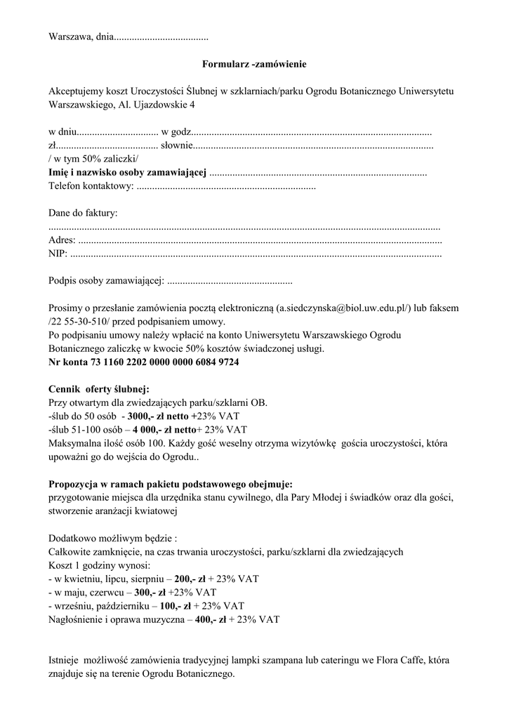 Warszawa, dnia..................................... Formularz -zamówienie Akceptujemy koszt Uroczystości Ślubnej w szklarniach/parku Ogrodu Botanicznego Uniwersytetu Warszawskiego, Al. Ujazdowskie 4 w dniu................................ w godz.............................................................................................. zł........................................ słownie.............................................................................................. / w tym 50% zaliczki/ Imię i nazwisko osoby zamawiającej ..................................................................................... Telefon kontaktowy: ...................................................................... Dane do faktury: ......................................................................................................................................................... Adres: .............................................................................................................................................. NIP: ................................................................................................................................................. Podpis osoby zamawiającej: ................................................. Prosimy o przesłanie zamówienia pocztą elektroniczną ([email protected]/) lub faksem /22 55-30-510/ przed podpisaniem umowy. Po podpisaniu umowy należy wpłacić na konto Uniwersytetu Warszawskiego Ogrodu Botanicznego zaliczkę w kwocie 50% kosztów świadczonej usługi. Nr konta 73 1160 2202 0000 0000 6084 9724 Cennik oferty ślubnej: Przy otwartym dla zwiedzających parku/szklarni OB. -ślub do 50 osób - 3000,- zł netto +23% VAT -ślub 51-100 osób – 4 000,- zł netto+ 23% VAT Maksymalna ilość osób 100. Każdy gość weselny otrzyma wizytówkę gościa uroczystości, która upoważni go do wejścia do Ogrodu.. Propozycja w ramach pakietu podstawowego obejmuje: przygotowanie miejsca dla urzędnika stanu cywilnego, dla Pary Młodej i świadków oraz dla gości, stworzenie aranżacji kwiatowej Dodatkowo możliwym będzie : Całkowite zamknięcie, na czas trwania uroczystości, parku/szklarni dla zwiedzających Koszt 1 godziny wynosi: - w kwietniu, lipcu, sierpniu – 200,- zł + 23% VAT - w maju, czerwcu – 300,- zł +23% VAT - wrześniu, październiku – 100,- zł + 23% VAT Nagłośnienie i oprawa muzyczna – 400,- zł + 23% VAT Istnieje możliwość zamówienia tradycyjnej lampki szampana lub cateringu we Flora Caffe, która znajduje się na terenie Ogrodu Botanicznego.
