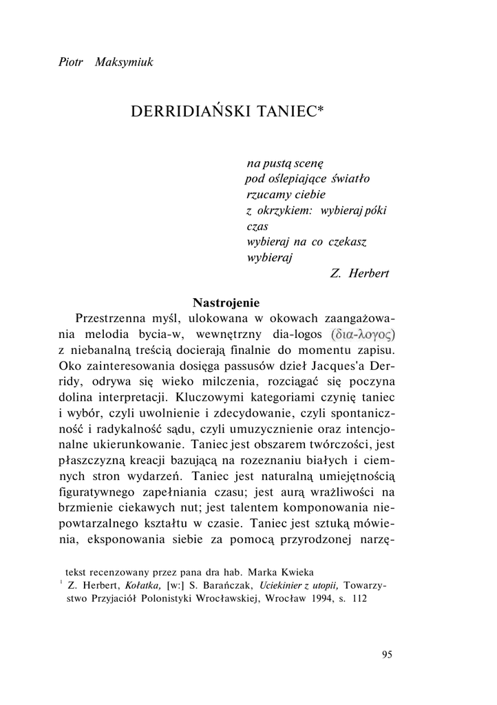 Piotr Maksymiuk DERRIDIAŃSKI TANIEC* na pustą scenę pod oślepiające światło rzucamy ciebie z okrzykiem: wybieraj póki czas wybieraj na co czekasz wybieraj Z. Herbert Nastrojenie Przestrzenna myśl, ulokowana w okowach zaangażowa nia melodia bycia-w, wewnętrzny dia-logos z niebanalną treścią docierają finalnie do momentu zapisu. Oko zainteresowania dosięga passusów dzieł Jacques'a Der ridy, odrywa się wieko milczenia, rozciągać się poczyna dolina interpretacji. Kluczowymi kategoriami czynię taniec i wybór, czyli uwolnienie i zdecydowanie, czyli spontanicz ność i radykalność sądu, czyli umuzycznienie oraz intencjo nalne ukierunkowanie. Taniec jest obszarem twórczości, jest płaszczyzną kreacji bazującą na rozeznaniu białych i ciem nych stron wydarzeń. Taniec jest naturalną umiejętnością figuratywnego zapełniania czasu; jest aurą wrażliwości na brzmienie ciekawych nut; jest talentem komponowania nie powtarzalnego kształtu w czasie. Taniec jest sztuką mówie nia, eksponowania siebie za pomocą przyrodzonej narzę- 1 tekst recenzowany przez pana dra hab. Marka Kwieka Z. Herbert, Kołatka, [w:] S. Barańczak, Uciekinier z utopii, Towarzy stwo Przyjaciół Polonistyki Wrocławskiej, Wrocław 1994, s. 112 95 Piotr Maksymiuk dziowości. Wybór natomiast zaświadcza o asertywnym od niesieniu do zdarzeń; ulokowany jest pomiędzy sprzecznymi propozycjami bytu - jest klarownym wyjściem z wielości równouprawnionych światoodczuć. Decyzja jest opowie dzeniem się, zapowiedzią konsekwencji, projektem warun kującym przyszłość. Derrida tańczy i wybiera, zwalnia sło wo z uwięzi konotacji oraz kreśli szkic rozumowania, na znacza czas interpretacją. Derrida powstaje przez treść i technologie pisania, wyłania się znikąd i donikąd podąża. Można wejść w jego meandryczną rzekę, 'rozłożyć się' w świetle jego zagrywek. Nie można adekwatnie go opisać. Za Derrida nie można podążać, Derridy nie można rozwijać (...). Można go tylko naśladować powtarzając jego gesty i zwroty (...). Recepcja sprowadza się w rezultacie nie tyle do pisania o Derridzie, co do pisania Derridą2 Zestawienie Derridiańskie maszynerie eseistyczne są szeroko opisy wane (sic!) w ramach ogólnie rozumianego dyskursu na ukowego. Piramida omówień jego prezentacji słownych ciągle rozbudowuje się. Powstają semantyczne korowody artykułów i książek pretendujących do ukazania uprawo mocnionej interpretacji jego dzieł. Wielość ta roznieca ogni sko prezentacji odmiennych recepcji, wprowadza atmosferę nad wyraz aktywnych dyskusji oraz rozciąga perspektywę re-problematyzowania jakości Derridiańskich. Na platformie dyskursu spotykają się dwa - dość wyraź nie odróżniające się - nurty oglądu. Z jednej strony literaturoznawcy*, próbujący ogarnąć (wy)twórczość Derridy na 2 A. Bielik, Tylko w małych dawkach : o pożytkach i szkodach pharinakonu Derridy, „Res Publica Nowa" 1995, nr 9, s. 72 * Filolodzy i literaturoznawcy stanowią zasadniczy trzon zainteresowa nych fenomenem Derridy. Zaangażowanie widoczne jest w obszemości publikowanych artykułów i książek. Równocześnie proces ten zaświad- 96 Derridiański taniec sposób umetodycznienia, ustabilizowania, uobecniającego nazywania. Z drugiej strony filozofowie, ukierunkowani na zauważenie niepowtarzalności Derridiańskiej myśli, równo cześnie krzewiący rodzaj zdystansowania się do natychmia stowej, jednostronnej oceny. Pierwsi - mam wrażenie - zbyt pochopnie wyciągają wnioski, spychając kreacje Derridy w przepaść chaotyczności. Należy uznać Derridę za pełnego inwencji pisarza, który wy puszczając 'filozofemy na wolność' i oswobadzając je z insty tucjonalnych zobowiązań, rozproszył je w 'gąszczu tekstualności', 'labiryncie pisania', zakamarkach 'polifonicznego 3 stylu' Wypowiedź oceniająca tego typu ujawnia konstytucję na dmuchanej negatywności, co naturalnie oddala ją od pola naukowej ostrożności. Trudno w jej obliczu nie mieć wra żenia powierzchniowej li tylko eksploracji ocenianej treści. Naiwne napomknienie wkomponowane w brak wnikliwości. Obcujemy z grą zasłon, tkanin, milionów baletnic wirujących w piruetach nakładających się jedne na drugie, z bielą ko 4 smetyków nałożonych na twarz Pierrota Architektoniczne naznaczanie pisma emblematami błędu? cza o immanentnej prowokacyjnej naturze Derridiańskich pism, a do datkowo unaocznia szerszy trend „porywania się" filologów na filozofię. „Krytyka literacka porusza się ruchem wahadłowym między pragnie niem drobnych, dokładnych zdań, a kreśleniem szerokich wizji. Obecnie znajduje się na etapie „malowania wielkich obrazów", stąd jej gwał towne zainteresowanie filozofią" (R. Rorty, [w:] M. Kwiek, Rorty i Lyotard. W labiryntach postmoderny, Wydawnictwo Naukowe IF UAM, Poznań 1994, s. 51) " G. H. Hartman, [w:] M. P. Markowski, Efekt inskrypcji. Jacques Derrida i literatura, Studio () &, Wyd. homilii, Bydgoszcz 1997, s. 56 4 T. Rachwał T. Sławek, Maszyna do pisania. O dekonstruktywistycznej teorii literatury Jacques'a Derridy, Warszawa 1992, s. 177 97 Piotr Maksymiuk O Derridzie nie można pisać w tonie definitywnym, z zimnej odległości, zgodnie z klasyczną zasadą eksplikacji i prezentacji poglądów, która metodycznie zniekształcając chaotyczny obraz świata przechodzi z pewnością siebie od wniosku do wniosku. Skoro niemożliwy jest zdystansowany komentarz, konieczne jest otwarcie przestrzeni (de)skryptywności, dzięki czemu 'w kolistych korytarzach lektury' rwać się będą poszczególne wątki (narracji bądź ar gumentu), słowa zaczną znikać i pojawiać się w najmniej oczekiwanych miejscach, odsłaniając pułapkę dla każdego, kto chciałby 'wymknąć się tekstowi' i wyjść poza tekst, wy prostować, wygładzić fałdy tekstualnoścf Seria atrakcyjnych tworów nie-do-słowności? Istnieje rzeczywiście pewna Derridiańska jałowość, kt