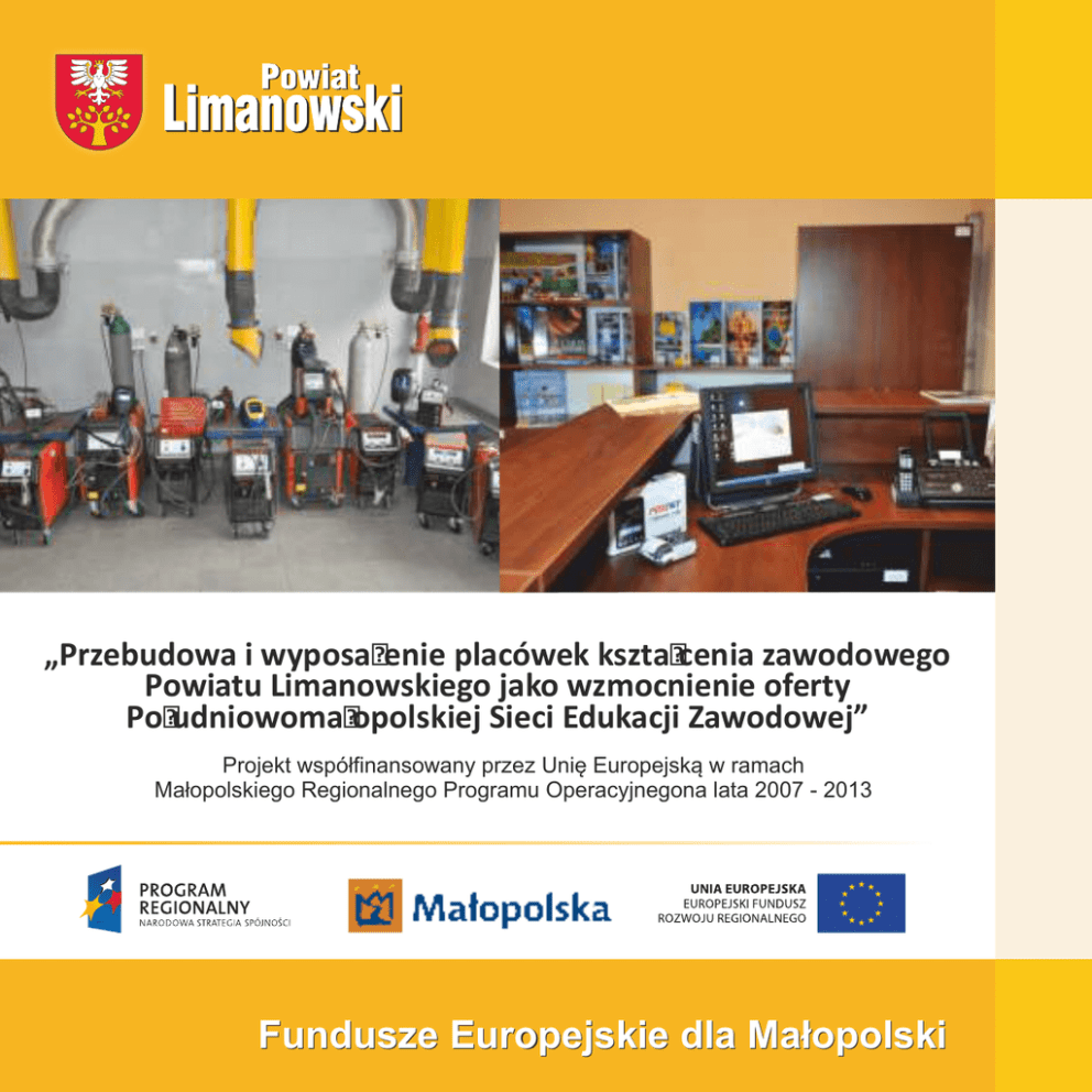 „Przebudowa i wyposażenie placówek kształcenia zawodowego Powiatu Limanowskiego jako wzmocnienie oferty Południowomałopolskiej Sieci Edukacji Zawodowej” Projekt współfinansowany przez Unię Europejską w ramach Małopolskiego Regionalnego Programu Operacyjnegona lata 2007 - 2013 Fundusze Europejskie dla Małopolski Wstęp Szanowni Państwo Mając na uwadze zwiększony popyt na szkolnictwo zawodowe oraz niedostatki obecnego systemu nauki zawodu, Powiat Limanowski w latach 2010 – 2011 zrealizował projekt pn. „Przebudowa i wyposażenie placówek kształcenia zawodowego Powiatu Limanowskiego jako wzmocnienie oferty Południowomałopolskiej Sieci Edukacji Zawodowej”. Celem projektu współfinansowanego z Małopolskiego Regionalnego Programu operacyjnego na lata 2007-2013 było utworzenie nowych oraz modernizacja istniejących już pracowni zawodowych, a także wyposażenie ich w nowoczesny sprzęty techniczno – dydaktyczny. Kształcenie zawodowe wymaga znacznych nakładów inwestycyjnych, zwłaszcza jeśli chodzi o tworzenie i unowocześnianie bazy techniczno-dydaktycznej. Aby zapewnić uczniom i słuchaczom odpowiedni poziom kształcenia praktycznego oraz zdawania egzaminu potwierdzającego kwalifikacje zawodowe, Powiat Limanowski podjął działania mające na celu modernizację bazy dydaktycznej. Dzięki nim zapewniono uczniom wyposażenie dydaktyczne, sprzęt i urządzenia, zgodne z wymaganiami określonymi w podstawach programowych kształcenia w poszczególnych zawodach. Niezwykle ważnym zadaniem jest dostosowanie kształcenia zawodowego do potrzeb lokalnego rynku pracy, który poprzez dynamiczny rozwój, wymaga od absolwentów umiejętności posługiwania się nowoczesnymi urządzeniami i technologiami. W związku z powyższym inwestycje w nowoczesną bazę dydaktyczną na potrzeby kształcenia ustawicznego oraz kształcenia zawodowego, okazują się być szczególnie pilną potrzebą. Zakup wysokiej jakości urządzeń, do istniejących, a także nowo otwartych pracowni zawodowych pozwolił na poszerzenie kierunków kształcenia zawodowego oraz organizowanie kursów kończących się egzaminem państwowym. Dzięki temu uczniowie naszych szkół mają możliwość uzyskania dodatkowych uprawnień, a co za tym idzie większych kompetencji na rynku pracy. Można więc śmiało powiedzieć, że dzięki realizacji niniejszego projektu, została podniesiona jakość i poziom kształcenia zawodowego w Powiecie Limanowskim, oraz zapewniono pracodawcom wysoko wykwalifikowaną kadrę. Bez wątpienia, osoby, które skorzystają z tak udoskonalonej bazy dydaktycznej, znacznie zwiększą swoje szanse na lokalnym i regionalnym rynku pracy. Dlatego też zachęcam do skorzystania z oferty dydaktycznej placówek kształcenia zawodowego Powiatu Limanowskiego, nie tylko uczniów szkół zawodowych, ale także wszystkie osoby, które są zainteresowane uzupełnieniem wykształcenia lub podniesieniem kwalifikacji zawodowych. Jan Puchała, Starosta Limanowski Szkoły objęte projektem Zespół Szkół Nr 1 w Limanowej Zespół Szkół Techniczno - Informatycznych w Mszanie Dolnej www.zsnr1.limanowa.pl www.zsti.edu.pl Dyrektor: mgr Eugeniusz Bogacz Dyrektor: mgr inż. Andrzej Dębski 34-600 Limanowa ul. J Piłsudskiego 81 34-730 Mszana Dolna ul. Starowiejska 4 tel. (018) 33 71 760 tel. (018) 33 19 040 Zespół Szkół Ponadgimnazjalnych im. Inż. Józefa Marka w Mszanie Dolnej Zespół Szkół Technicznych i Ogólnokształcących im. Jana Pawła II w Limanowej www.zspmszana.iap.pl www.zstio.edu.pl Dyrektor: mgr Halina Bubiłek Dyrektor: mgr Grażyna Szumilas 34-730 Mszana Dolna ul. Józefa Marka 2 34-600 Limanowa ul. Z. Augusta 8 tel. (018) 3310135 tel. (018) 33 72 602 Zespół Szkół Nr 1 w Limanowej Uczniowie posiądą umiejętności sprawnego łączenia wiedzy teoretycznej z praktyczną, poprzez wykorzystywanie nowoczesnych technik multimedialnych i specjalistycznego programu komputerowego związanych z zawodem. Mają również możliwość zapoznania się z funkcjonowaniem hotelu i świadczonymi przez hotel usługami. Szkoleniowe filmy edukacyjne i plansze dydaktyczne pozwalają młodzieży zdobyć umiejętności zarządzania personelem hotelu, jego usługami i własnym czasem. Stały dostęp do internetu umożliwia poznanie i analizę ofert obiektów hotelarskich, ocenę ich konkurencyjności, stosowane przez nie form promocji, oraz nowości i trendy hotelarskie występujące na rynku. W ramach projektu zakupiono wyposażenie do pracowni hotelarskiej, które obejmuje: Laptop wraz z oprogramowaniem, Zestawy komputerowe z programem szkoleniowym do rezerwacji miejsc hotelowych i zarządzania hotelem, Drukarka HP laserjet, System odpowiedzi na testy w czasie rzeczywistym PRS RF/32 piloty, Tablet interaktywny - InterWrite Pad, Projektor, Tablica interaktywna, Recepcja wraz z wyposażeniem (telefon, fax, klucze magnetyczne), Pomoce edukacyjne (filmy, plansze, atlasy i mapy). Zespół Szkół Technicznych i Ogólnokształcących w Limanowej W Zespole Szkół Technicznych i Ogólnokształcących w Limanowej projekt obejmował realizację robót remontowych - adaptacyjnych pracowni oraz wyposażenie ich w urządzenia do nauki zawodu. Remontem objęte zostały pomieszczenia przeznaczone na pracownie: Samochodowa- zajęcia teoretyczne, Obrabiarek numerycznych CNC, Elektromechaniki pojazdów samochodowych, Mechaniczna, Spawalnicza. Wyposażenie zakupiono do pracowni: Pracownia samochodowa – zajęcia teoretyczne Aktoryka systemów pojazdowych Sentoryka systemów pojazdowych Podstawy elektroniki i elektrotechniki pojazdowej Zespół napędowy silnika ZI sekwencyjny wielopunktowy Zespół napędowy silnika typu Comon Rail System regulacji siły hamowania ABS/ASR Systemy zapłonowe Pracownia samochodowa - zajęcia praktyczne blacharstwa pojazdowego, obsługi i naprawy pojazdów samochodowych Podnośnik do podnoszenia całego pojazdu Montażownica do kół samochodowych Wyważarka do kół Urzą