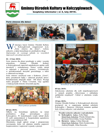 Gminny Ośrodek Kultury w Kołczygłowach bezpłatny informator | nr 2, luty 2015r. Ferie zimowe dla dzieci miesiącu lutym Gminny Ośrodek Kultury w Kołczygłowach zorganizował m.in. „Ferie zimowe dla dzieci”, wybory sołtysów, a także konsultacje nt. przebudowy drogi. Zapraszamy do czynnego udziału we wszystkich imprezach i przedsięwzięciach! W 02 - 13 luty 2015r. Ferie zimowe dla dzieci przebiegły w miłej i wesołej atmosferze. Gminny Ośrodek Kultury w Kołczygłowach zapewnił najmłodszym opiekę osób dorosłych i wolontariuszy. Dzieci wzięły udział w zajęciach z pierwszej pomocy. Uczestniczyły w poszukiwaniach skrzynek geocachingu, a także w zabawach na śniegu. Ferie zimowe uwieńczył teatr z Krakowa „Urwis”, który przedstawił bajkę i zabawiał przybyłe dzieci. Przedstawienie obejrzało około 100 dzieci. Występ teatru przypadł w Tłusty Czwartek, więc zgodnie z tradycją każde dziecko otrzymało pączka. Konsultacje społeczne nt. przebudowy drogi 05 luty 2015r. Zakończono szkolenie dla osób niepełnosprawnych w ramach projektu „Aktywizacja z zakładania spółdzielni socjalnych”. Udział w szkoleniu wzięło 6 osób. 19 luty 2015r. Gminny Ośrodek Kultury w Kołczygłowach aktywnie przyłączył się w organizację spotkań sołeckich Kołczygłów i Barnowa. Głównym tematem spotkań były wybory sołtysów i rad sołeckich. Dzieci podczas spektaklu 05 luty 2015r. Odbyły się konsultacje społeczne na temat przebudowy drogi prowadzącej przez Kołczygłowy. W konsultacjach wzięło udział około 85 osób zamieszkałych w bezpośrednim sąsiedztwie drogi wojewódzkiej nr 209. Mieszkańcy mogli zgłosić uwagi i proponowane rozwiązania, które ich zdaniem miałyby poprawić bezpieczeństwo i usprawnić wyjazdy z posesji. Wyniki wyborów sołtysów i rad sołeckich: 1) Kołczygłowy Sołtys: Zofia Majer Skład Rady Sołeckiej: Wanda Zdrojewska, Krystyna Grzywińska, Iwona Podolska 2) Barnowo Sołtys: Celina Marczak Skład Rady Sołeckiej: Daria Synakowska, Andrzej Knopik, Alina Horoszko 1 Nowa szata graficzna strony GOKu! Zmieniono wygląd strony internetowej Gminnego Ośrodka Kultury w Kołczygłowach. Nowa strona jest w pełni kompatybilna z urządzeniami mobilnymi. Dodano również kilka nowych artykułów. www.gok.kolczyglowy.pl 21 luty 2015r. Odbyło się walne zebranie sprawozdawcze w jednostce OSP Kołczygłowy. W trakcie zebrania przedstawiano sprawozdania z działalności OSP za 2014r. sprawozdania finansowe, sprawozdania komisji rewizyjnych oraz projekty planów działalności i planów finansowych na 2015r. Ponadto przyjęto w poczet członków 10 nowych druhów, którzy złożyli ślubowanie na sztandar. Zdjęcia z walnego zebrania OSP Kołczygłowy 25 luty 2015r. Po raz kolejny odbyło się szkolenie dla rolników z naszej gminy. Rolnicy zapoznali się z zasadami płatności bezpośrednich i wypełniania wniosków. Szkolenie prowadzili pracownicy i trenerzy Ośrodka Doradztwa Rolniczego Oddział w Bytowie. Przedsięwzięcia w miesiącu marcu Spotkanie stowarzyszenia 5 marzec 2015r. godz. 13:00 Partnerstwo Dorzecze Słupi 5 marzec 2015r. godz. 18:00 Dzień Kobiet Remont poddasza Gminnego Ośrodka Kultury w Kołczygłowach Środki na remont zostały pozyskane z Urzędu Marszałkowskiego w ramach PO Ryby. Dofinansowanie wynosi 85 %. Poddasze GOKu zostanie zaadaptowane na nową salę, w której będzie działać świetlica wsparcia dziennego. Zakupione zostanie wyposażenie w postaci komputera, tablicy interaktywnej, aparatu fotograficznego i mebli. Powstaną także kolejne koła zainteresowań. Rozliczenie projektu „Kultura czterech smaków”- złożenie wniosku o płatność ostateczną Obchody Dnia Sołtysa Warsztaty Wielkanocne Zajęcia taneczne z Zumby wtorki i czwartki godz. 17:00 Drodzy mieszkańcy gminy Kołczygłowy! Przypominamy, iż kontynuujemy zbiórkę starych zdjęć i dokumentów. Łącznie otrzymaliśmy około 90 zdjęć, najwięcej przekazali nam mieszkańcy Gałąźni Małej i Gałąźni Wielkiej – około 50 zdjęć! Prosimy o dostarczanie zdjęć i pocztówek przedstawiających głównie krajobrazy, zabytki, stare domy i budynki gminy Kołczygłowy, a także mieszkańców. Wszystkie zdjęcia zostaną zeskanowane i opisane, po czym zwrócimy je właścicielom. Zdjęcia można dostarczyć do zeskanowania osobiście do Gminnego Ośrodka Kultury w Kołczygłowach (ul. Szkolna 1) lub zeskanowane przesłać mailowo na adres: [email protected] Zdjęcie otrzymane w ramach zbiórki zdjęć: Koło Gospodyń Wiejskich Gałąźnia Wielka. Wycieczka do Świętej Lipki (1978-79) zdjęcie dostarczyła pani Jadwiga Czarnecka Gminny Ośrodek Kultury w Kołczygłowach | ul. Szkolna 1, 77-140 Kołczygłowy tel. 59 821 35 23 [email protected] www.gok.kolczyglowy.pl 2