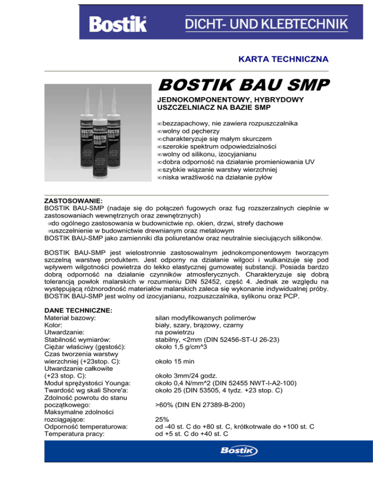 KARTA TECHNICZNA BOSTIK BAU SMP JEDNOKOMPONENTOWY, HYBRYDOWY USZCZELNIACZ NA BAZIE SMP • • • • • • • • bezzapachowy, nie zawiera rozpuszczalnika wolny od pęcherzy charakteryzuje się małym skurczem szerokie spektrum odpowiedzialności wolny od silikonu, izocyjanianu dobra odporność na działanie promieniowania UV szybkie wiązanie warstwy wierzchniej niska wrażliwość na działanie pyłów ZASTOSOWANIE: BOSTIK BAU-SMP (nadaje się do połączeń fugowych oraz fug rozszerzalnych cieplnie w zastosowaniach wewnętrznych oraz zewnętrznych) • do ogólnego zastosowania w budownictwie np. okien, drzwi, strefy dachowe • uszczelnienie w budownictwie drewnianym oraz metalowym BOSTIK BAU-SMP jako zamienniki dla poliuretanów oraz neutralnie sieciujących silikonów. BOSTIK BAU-SMP jest wielostronnie zastosowalnym jednokomponentowym tworzącym szczelną warstwę produktem. Jest odporny na działanie wilgoci i wulkanizuje się pod wpływem wilgotności powietrza do lekko elastycznej gumowatej substancji. Posiada bardzo dobrą odporność na działanie czynników atmosferycznych. Charakteryzuje się dobrą tolerancją powłok malarskich w rozumieniu DIN 52452, część 4. Jednak ze względu na występującą różnorodność materiałów malarskich zaleca się wykonanie indywidualnej próby. BOSTIK BAU-SMP jest wolny od izocyjanianu, rozpuszczalnika, sylikonu oraz PCP. DANE TECHNICZNE: Materiał bazowy: Kolor: Utwardzanie: Stabilność wymiarów: Ciężar właściwy (gęstość): Czas tworzenia warstwy wierzchniej (+23stop. C): Utwardzanie całkowite (+23 stop. C): Moduł sprężystości Younga: Twardość wg skali Shore'a: Zdolność powrotu do stanu początkowego: Maksymalne zdolności rozciągające: Odporność temperaturowa: Temperatura pracy: silan modyfikowanych polimerów biały, szary, brązowy, czarny na powietrzu stabilny, <2mm (DIN 52456-ST-U 26-23) około 1,5 g/cm^3 około 15 min około 3mm/24 godz. około 0,4 N/mm^2 (DIN 52455 NWT-I-A2-100) około 25 (DIN 53505, 4 tydz. +23 stop. C) >60% (DIN EN 27389-B-200) 25% od -40 st. C do +80 st. C, krótkotrwale do +100 st. C od +5 st. C do +40 st. C Warunki magazynowania: 9 miesięcy w nieotwartym opakowaniu, suchym miejscu, warunkach temperaturowych od +5 st. C do +25 st. C PRZYGOTOWANIE PODŁOŻA: BOSTIK 5075-grunt do betonu, cementu, gipsu oraz innych chłonnych porowatych materiałów budowlanych, tak jak dla niektórych metali oraz tworzyw sztucznych. Dla kamienia naturalnego wymagane są badania wstępne, ewentualnie zastosować BOSTIK 5005 ST. Przy bardzo chłonnych powierzchniach konieczne może okazać się nałożenie drugiej warstwy gruntu. Bez gruntowania może być nakładany na powierzchnie szklane, anodowane aluminium, ocynkowane blachy stalowe, twarde PCV, polistyren i makrolon. Powierzchnie boczne fugi oraz powierzchnie przyczepne muszą być twarde, mocne, czyste, suche, odtłuszczone, bez kurzu. Wszystkie materiały podkładowe muszą zachować wzajemną tolerancje z BOSTIK BAU-SMP w rozumieniu DIN 52452, część 1. Nie mogą zawierać bitumu ani smoły. Odpowiedzialność i zdolności obciążeniowe w połączeniu z tworzywami sztucznymi powinny być badane w zależności od obiektu. Stosując na powierzchnie wcześniej powlekane konieczne jest sprawdzenie zdolności tolerancji materiałów np. przy powłokach akrylowych może wystąpić utrata przyczepności w związku z przemieszczaniem się plastyfikatorów. SPOSÓB UŻYCIA: BOSTIK BAU-SMP równomiernie wycisnąć pod ciśnieniem na boki fugi. Fuga musi być w całej przestrzeni wypełniona, bez pęcherzy powietrza. Pojemnik napoczęty zużyć możliwie szybko. Górną powierzchnię nałożonej fugi od raz przetrzeć zwilżoną łopatką, gładkim drewnem, kielnią do spoin, wilgotnym palcem. Taśmę klejącą natychmiast usunąć. Jako środek gładzący należy stosować znajdujące się w handlu środki powierzchniowo czynne (nie koncentraty środków myjących). Nie nanosić zbyt dużych ilości, aby uniknąć przebarwień masy uszczelniającej oraz sąsiadujących materiałów budowlanych. CZYSZCZENIE: Zanieczyszczenia w stanie świeżym mogą być usuwane produktami BOSTIK SOLVENT 250 lub BOSTIK SOLVENT 270. Produkty te mogą być również stosowane do odtłuszczania powierzchni bazowych. Zanieczyszczenia z BOSTIK BAU-SMP w stanie związanym usuwać tylko w sposób mechaniczny. ZUŻYCIE: Przy fudze o przekroju 10x10 mm^2 kartusz o pojemności 290 ml wystarczy na ok. 3 mb fugi. Przybliżone zapotrzebowanie na materiał można również wyliczyć: szerokość fugi (mm) x głębokość fugi (mm), wynik daje ilość mililitrów na metr bieżący fugi. Aby uzyskać więcej informacji, proszę zapoznać się z kartami charakterystyki.