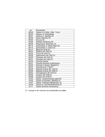 zw 08:46 08:49 08:51 08:59 09:04 09:06 09:09 09:12 09:14 09:17 09:20 09:23 09:26 09:29 09:31 09:35 09:37 09:40 09:43 09:48 09:50 09:53 09:56 09:58 10:03 10:05 10:07 10:09 10:11 Przystanek Olesno D.a Stan. Odpr. Turys. Olesno ul. Krasickiego Olesno ul. Opolska 21 Nowy Wachów 04 Kocury 06 Warłów/ Malichów 08 Rzędowice, Bzionków 10 Dobrodzień ul. Edyty Stein 02 Dobrodzień ul. Solna 02 Błachów Wieś 04 Myślina 46-1302-01 Turza 46-1291-01 Dąbrownica 46-1267-01 Grodziec 46-1237-01 Grodziec 46-1223-01 Ozimek Szpital Ozimek Dworzec Autobusowy Ozimek ul Powst. Śląskich 9 Schodnia 46-1159-01 Dębska Kuźnia 46-1105-01 Dębska Kuźnia 46-1099-01 Chrząstowice 46-1074-01 Lędziny 46-1048-01 Ledziny 46-1039-01 Opole Czestochowska pętla 09 Opole ul Ozimska / Malinka 23 Opole Ozimska/ Małopolska 15 Opole ul. Ozimska/Katowicka 07 Opole Dworzec Autobusowy D – kursuje w dni robocze od poniedziałku do piątku