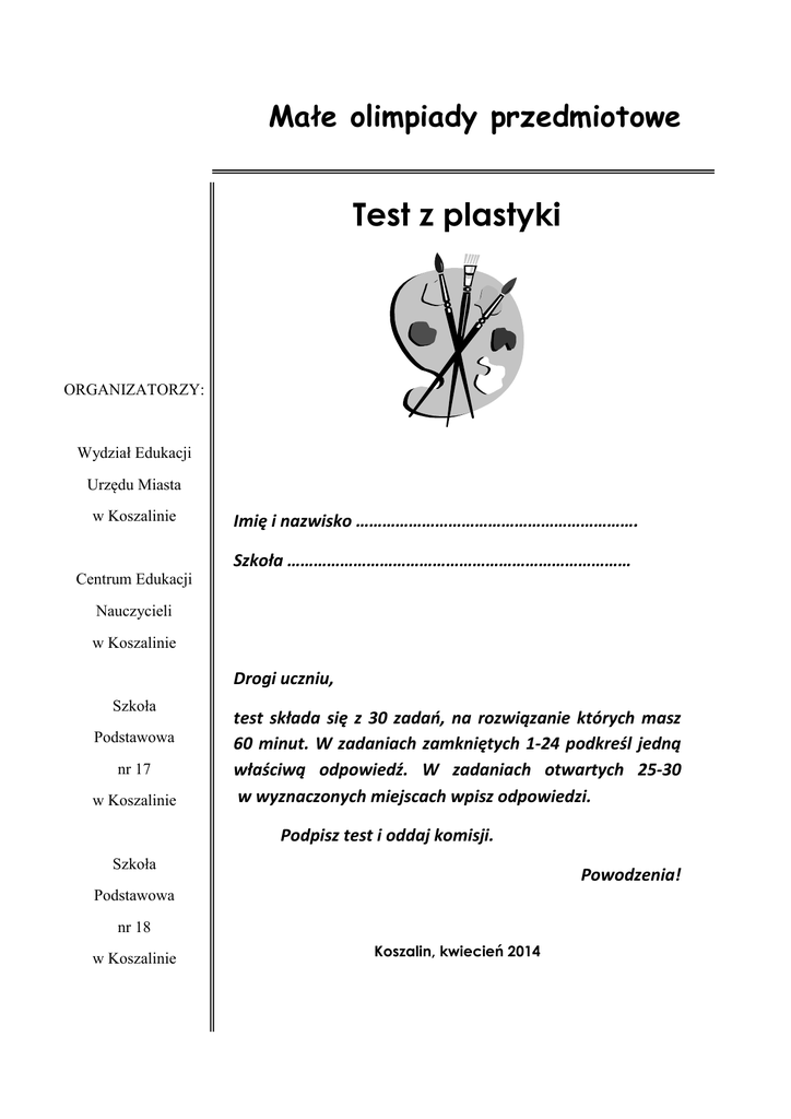 Małe olimpiady przedmiotowe Test z plastyki ORGANIZATORZY: Wydział Edukacji Urzędu Miasta w Koszalinie Imię i nazwisko ………………………………………………………. Szkoła …………………………………………………………………… Centrum Edukacji Nauczycieli w Koszalinie Drogi uczniu, Szkoła Podstawowa nr 17 w Koszalinie test składa się z 30 zadań, na rozwiązanie których masz 60 minut. W zadaniach zamkniętych 1-24 podkreśl jedną właściwą odpowiedź. W zadaniach otwartych 25-30 w wyznaczonych miejscach wpisz odpowiedzi. Podpisz test i oddaj komisji. Szkoła Powodzenia! Podstawowa nr 18 w Koszalinie Koszalin, kwiecień 2014 1. Autorem „Sądu ostatecznego” z Kaplicy Sykstyńskiej jest a) Donatello. b) Michał Anioł. c) Leonardo da Vinci. d) Rafael Santi. 2. Co to jest fresk? a) Element konstrukcyjny budowli. b) Malowidło ścienne. c) Technika malowania na desce. d) Forma rzeźbiarska. 3. Litografia to technika a) malarska. b) architektoniczna. c) rysunkowa. d) graficzna. 4. Liście akantu są elementem charakterystycznym dla porządku a) doryckiego. b) korynckiego. c) jońskiego. d) etruskiego. 5. Sztuka Odrodzenia wzorowana była na sztuce a) bizantyjskiej. b) gotyckiej. c) antycznej. d) sumeryjskiej. 6. „Impresja, wschód słońca”, to dzieło a) romantyzmu. b) realizmu. c) impresjonizmu. d) klasycyzmu. 7. Jak nazywamy linię określającą kształt przedmiotu? a) Łamana. b) Krzywa. c) Konturowa. d) Prosta. 8. Jaki materiał był spoiwem łączącym kolorowe szkła w gotyckich witrażach? 2 a) b) c) d) Ołów. Żelazo. Miedź. Gips. 9. Które motywy dekoracyjne były ulubionymi elementami w sztuce secesji? a) Figury geometryczne. b) Czarno-białe pionowe i poziome pasy. c) Pędy winorośli, kwiaty irysa, pawie. d) Nieokreślone plamy barwne. 10. Słynny zbiór arrasów w Polsce znajduje się a) w Zamku w Łańcucie. b) w Katedrze Gnieźnieńskiej. c) na Wawelu w Krakowie. d) w Zamku Królewskim w Warszawie. 11. Dla jakiego stylu w architekturze było charakterystyczne sklepienie kolebkowe? a) Barokowego. b) Gotyckiego. c) Renesansowego. d) Romańskiego. 12. Co to jest maswerk? a) Przeźroczysty obraz wykonany z kawałków przeźroczystego szkła. b) Malowidło ścienne. c) Struktura rzeźby. d) Dekoracja rzeźbiarska przypominająca koronkę. 13. Co to jest blejtram? a) Dłuto rzeźbiarskie. b) Podłoże malarskie. c) Element dekoracyjny w architekturze. d) Stopień nasycenia jasności barwy. 14. „En face” to określenie portretu, na którym postać przedstawiona jest a) na wprost. b) od góry. c) z ukosa. d) do połowy. 15. Dziedzina sztuki polegająca na projektowaniu przedmiotów użytkowych, to a) impast. 3 b) rzemiosło artystyczne. c) performance. d) design. 16. Sztuka kształtowania przestrzeni sceny za pomocą różnych środków, to a) charakteryzacja. b) kostiumologia. c) scenografia. d) frotaż. 17. Kompozycja, która charakteryzuje się bezruchem i uporządkowaniem, to kompozycja a) dynamiczna. b) statyczna. c) otwarta. d) zamknięta. 18. Wosku używa się do zdobienia a) kraszanek opolskich. b) pisanek wykonanych techniką batikową. c) pisanek oklejanych wycinankami. d) pisanek kurpiowskich oklejanych sitowiem i włóczką. 19. Rodzaj akcji artystycznej, której nie można powtórzyć, to a) happening. b) sztuka użytkowa. c) studium. d) fotomontaż. 20. Plan, kompozycja wstępna pracy plastycznej, to a) monument. b) płaskorzeźba. c) szkic. d) plakat. 21. Fiksatywą nazywamy: a) specjalny płyn do utrwalania rysunków wykonanych węglem. b) zewnętrzną warstwę przedmiotów. c) technikę malarską. d) przeciwieństwo kierunków w obrazie. 22. W Katedrze Notre Dame możemy podziwiać a) sklepienia kolebkowe. b) dach kryty ozdobnym gontem. 4 c) witraże. d) dekoracje z drewna w kształcie lilii i tulipana. 23. Snycerstwo, to sztuka a) zdobienia wnętrz wycinankami ludowymi. b) rzeźbienia w marmurze. c) rzeźbienia w drewnie. d) przedstawiania światła i cienia w obrazie. 24. Kwadratowa lub prostokątna, mała kostka z kamienia lub kolorowego szkła, to: a) tesser. b) kolaż. c) frotaż. d) kontrapost. 25. Napisz, kto wyrzeźbił „Doryforosa”? ……………………………………………………………………. 26. Wymień barwy wchodzące w skład koła barw. ……………………………… …………………………………….. ……………………………… ……………………………………… ……………………………… ……………………………………… 27. Wymień barwy neutralne. ………………….…. ………………….… .……………………… 28. Wpisz nazwy świątecznych strojów ludowych we właściwe miejsce ………………….…. ………………….… .……………………… 29. Narysuj i podpisz 4 znaki plastyczne spotykane w codziennym życiu. 5 30. Wpisz w diagram krzyżówki prawidłowe nazwy. 1. 2. 3. 4. 5. 6. 1. Linia, która obrysowuje kształty postaci lub przedmiotów, obrys plamy barwnej. 2. Artysta, który tworzy rysunki. 3. Nazwa podstawowego narzędzia, które służy do rysowania. 4. Plan lub projekt rysunkowy. 5. Powierzchnia przedstawianego na rysunku przedmiotu, może być gładka lub chropowata. 6. Układ światła i cienia na powierzchni przedstawianego na rysunku przedmiotu sprawiający, ze przedmioty wydają się rzeczywiste. 6 Klucz odpowiedzi 2014 Pyt 1 2 3 4 5 6 7 8 9 10 11 12 13 14 15 16 17 18 19 Odp B A B A C D D C B B C D B C C A B D B Pyt 20 21 22 23 24 25 26 27 28 29 30 31 32 33 34 Odp B B B C C C D B B A C A C D C Kryteria oceniania pytań otwartych Pytanie 35 2 punkty Uczeń wymienia narzędzia w postaci programów, wtyczek do przeglądarki internetowej lub serwisów www, pozwalające pobrać z serwisu YouTube wybrane materiały. Wymienia programy umożliwiające opracowanie filmu przy pomocy komputera. 1 punkt Uczeń udziela częściowej odpowiedzi na pytanie 0 punktó