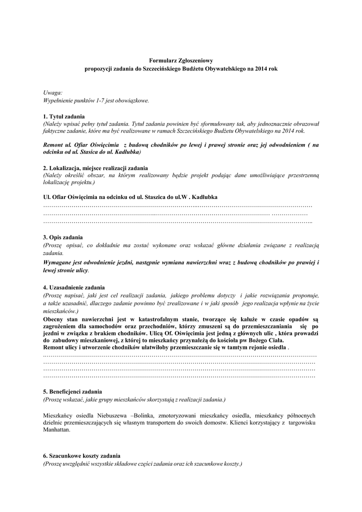 Formularz Zgłoszeniowy propozycji zadania do Szczecińskiego Budżetu Obywatelskiego na 2014 rok Uwaga: Wypełnienie punktów 1-7 jest obowiązkowe. 1. Tytuł zadania (Należy wpisać pełny tytuł zadania. Tytuł zadania powinien być sformułowany tak, aby jednoznacznie obrazował faktyczne zadanie, które ma być realizowane w ramach Szczecińskiego Budżetu Obywatelskiego na 2014 rok. Remont ul. Ofiar Oświęcimia z budową chodników po lewej i prawej stronie oraz jej odwodnieniem ( na odcinku od ul. Stasica do ul. Kadłubka) 2. Lokalizacja, miejsce realizacji zadania (Należy określić obszar, na którym realizowany będzie projekt podając dane umożliwiające przestrzenną lokalizację projektu.) Ul. Ofiar Oświęcimia na odcinku od ul. Staszica do ul.W . Kadłubka …………………………………………………………………..………………………………………………… ………………………………………………..………………………………………………… ……………… …………………………………………………………………………………………………………………….. 3. Opis zadania (Proszę opisać, co dokładnie ma zostać wykonane oraz wskazać główne działania związane z realizacją zadania. Wymagane jest odwodnienie jezdni, następnie wymiana nawierzchni wraz z budową chodników po prawiej i lewej stronie ulicy. 4. Uzasadnienie zadania (Proszę napisać, jaki jest cel realizacji zadania, jakiego problemu dotyczy i jakie rozwiązania proponuje, a także uzasadnić, dlaczego zadanie powinno być zrealizowane i w jaki sposób jego realizacja wpłynie na życie mieszkańców.) Obecny stan nawierzchni jest w katastrofalnym stanie, tworzące się kałuże w czasie opadów są zagrożeniem dla samochodów oraz przechodniów, którzy zmuszeni są do przemieszczaniania się po jezdni w związku z brakiem chodników. Ulicą Of. Oświęcimia jest jedną z głównych ulic , która prowadzi do zabudowy mieszkaniowej, z której to mieszkańcy przynależą do kościoła pw Bożego Ciała. Remont ulicy i utworzenie chodników ułatwiłoby przemieszczanie się w tamtym rejonie osiedla . .……………………………………………………………………………………………………………………… ……………………………………………………………………………………………………………………… ……………………………………………………………………………………………………………………… ……………………………………………………………………………………………………………………… 5. Beneficjenci zadania (Proszę wskazać, jakie grupy mieszkańców skorzystają z realizacji zadania.) Mieszkańcy osiedla Niebuszewa –Bolinka, zmotoryzowani mieszkańcy osiedla, mieszkańcy północnych dzielnic przemieszczających się własnym transportem do swoich domostw. Klienci korzystający z targowisku Manhattan. 6. Szacunkowe koszty zadania (Proszę uwzględnić wszystkie składowe części zadania oraz ich szacunkowe koszty.) Składowe części zadania Koszt 1. Odwodnienie , remont nawierzchni, budowa chodników lewa i prawa strona 1 000 000 zł. 2. 3. 4. 5. Łącznie: 1000 000………… zł 7. Kontakt do autorów propozycji zadania Imię i nazwisko, adres zamieszkania Kontakt (e-mail, telefon) 8. Dodatkowe załączniki (nieobowiązkowe): a) zdjęcie/a dotyczące zgłaszanego zadania; b) mapa z zaznaczeniem lokalizacji zgłaszanego zadania; c) inne, istotne dla zgłaszanego zadania, jakie? (proszę wymienić) ……………………………………………………………………………………………… ………………………………………………………………………………………………. Dane osobowe zbierane i przetwarzane są na podstawie art. 23. ust. 1 pkt 4) ustawy z dnia 29 sierpnia 1997 r. o ochronie danych osobowych (tj. Dz. U. 2002 Nr 101, poz. 926) w celu: Przeprowadzenia konsultacji społecznych w ramach Szczecińskiego Budżetu Obywatelskiego, w tym zamieszczanie przesłanego formularza na stronie www.konsultuj.szczecin.pl Badań opinii i oczekiwań społecznych realizowanych przez Urząd Miasta Szczecin Dane będą przetwarzane w zbiorze roboczym i zostaną usunięte po zakończeniu konsultacji społecznych dotyczących Szczecińskiego Budżetu Obywatelskiego na 2014 rok.