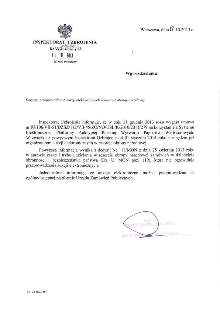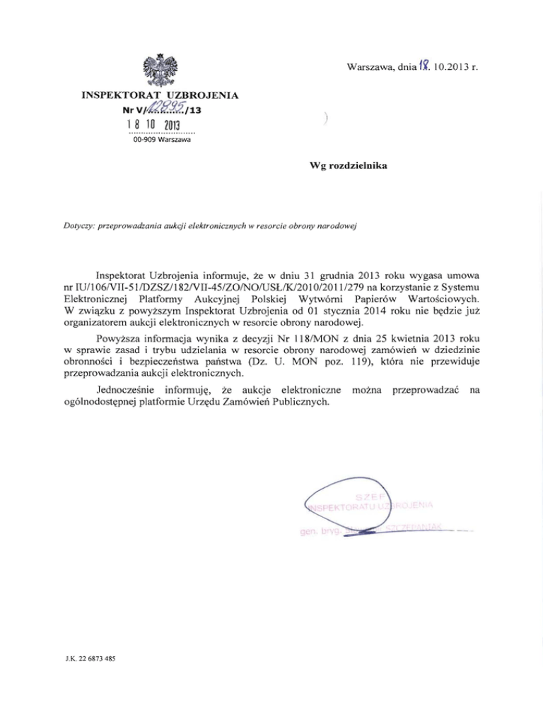 Warszawa, dnia 1~. 10.2013 r. INSPEKTORAT UZBROJENIA Nr v,1l.f1..:1.2./13 1 8 10 2013 ) 00-909 Warszawa Wg rozdzielnika Dotyczy: przeprowadzania aukcji elektronicznych w resorcie obrony narodowej Inspektorat Uzbrojenia informuje, ze w dniu 31 grudnia 2013 roku wygasa umowa nr IU/106NII-51IDZSZI182NII-45/Z0INOIUSLIKJ201 0/2011/279 na korzystanie z Systemu Elektronicznej Platformy Aukcyjnej Polskiej Wytw6rni Papier6w Wartosciowych. W zwiqzku z powyzszym Inspektorat Uzbrojenia od 01 stycznia 2014 roku nie b~dzie juz organizatorem aukcji elektronicznych w resorcie obrony narodowej. Powyzsza informacja wynika z decyzji Nr 118IMON z dnia 25 kwietnia 2013 roku w sprawie zasad i trybu udzielania w resorcie obrony narodowej zam6wien w dziedzinie obronnosci i bezpieczenstwa panstwa (Dz. U. MON poz. 119), kt6ra nie przewiduje przeprowadzania aukcji elektronicznych. lednoczeSnie informuj~, ze aukcje elektroniczne og6lnodost~pnej platformie Urz~du Zam6wien Publicznych. J.K. 22 6873 485 mozna przeprowadzac na