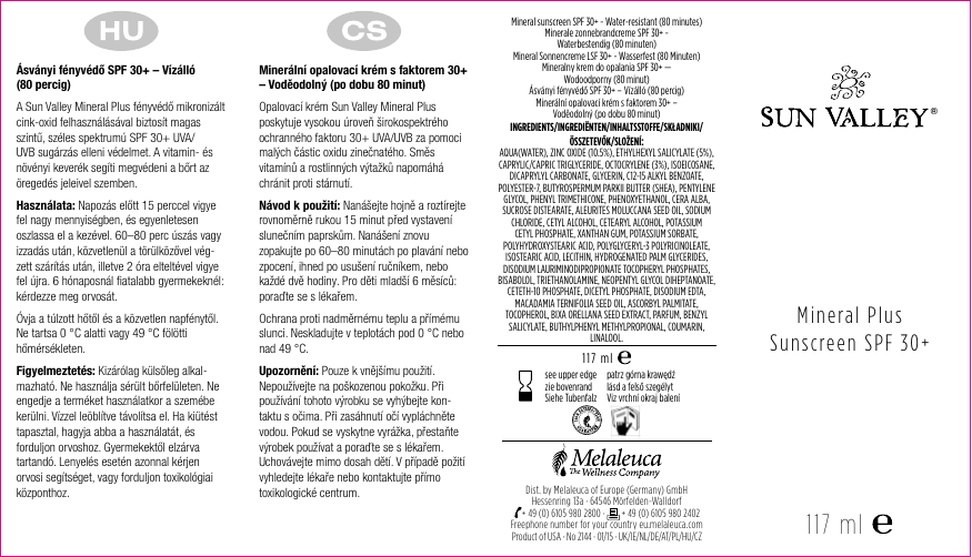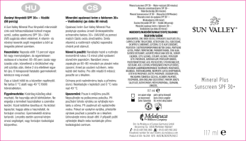 Ásványi fényvédő SPF 30+ – Vízálló (80 percig) Minerální opalovací krém s faktorem 30+ – Voděodolný (po dobu 80 minut) A Sun Valley Mineral Plus fényvédő mikronizált cink-oxid felhasználásával biztosít magas szintű, széles spektrumú SPF 30+ UVA/ UVB sugárzás elleni védelmet. A vitamin- és növényi keverék segíti megvédeni a bőrt az öregedés jeleivel szemben. Opalovací krém Sun Valley Mineral Plus poskytuje vysokou úroveň širokospektrého ochranného faktoru 30+ UVA/UVB za pomoci malých částic oxidu zinečnatého. Směs vitamínů a rostlinných výtažků napomáhá chránit proti stárnutí. Használata: Napozás előtt 15 perccel vigye fel nagy mennyiségben, és egyenletesen oszlassa el a kezével. 60–80 perc úszás vagy izzadás után, közvetlenül a törülközővel végzett szárítás után, illetve 2 óra elteltével vigye fel újra. 6 hónaposnál fiatalabb gyermekeknél: kérdezze meg orvosát. Návod k použití: Nanášejte hojně a roztírejte rovnoměrně rukou 15 minut před vystavení slunečním paprskům. Nanášení znovu zopakujte po 60–80 minutách po plavání nebo zpocení, ihned po usušení ručníkem, nebo každé dvě hodiny. Pro děti mladší 6 měsíců: poraďte se s lékařem. Óvja a túlzott hőtől és a közvetlen napfénytől. Ne tartsa 0 °C alatti vagy 49 °C fölötti hőmérsékleten. Ochrana proti nadměrnému teplu a přímému slunci. Neskladujte v teplotách pod 0 °C nebo nad 49 °C. Figyelmeztetés: Kizárólag külsőleg alkalmazható. Ne használja sérült bőrfelületen. Ne engedje a terméket használatkor a szemébe kerülni. Vízzel leöblítve távolítsa el. Ha kiütést tapasztal, hagyja abba a használatát, és forduljon orvoshoz. Gyermekektől elzárva tartandó. Lenyelés esetén azonnal kérjen orvosi segítséget, vagy forduljon toxikológiai központhoz. Upozornění: Pouze k vnějšímu použití. Nepoužívejte na poškozenou pokožku. Při používání tohoto výrobku se vyhýbejte kontaktu s očima. Při zasáhnutí očí vypláchněte vodou. Pokud se vyskytne vyrážka, přestaňte výrobek používat a poraďte se s lékařem. Uchovávejte mimo dosah dětí. V případě požití vyhledejte lékaře nebo kontaktujte přímo toxikologické centrum. Mineral sunscreen SPF 30+ - Water-resistant (80 minutes) Minerale zonnebrandcreme SPF 30+ Waterbestendig (80 minuten) Mineral Sonnencreme LSF 30+ - Wasserfest (80 Minuten) Mineralny krem do opalania SPF 30+ — Wodoodporny (80 minut) Ásványi fényvédő SPF 30+ – Vízálló (80 percig) Minerální opalovací krém s faktorem 30+ – Voděodolný (po dobu 80 minut) INGREDIENTS/INGREDIËNTEN/INHALTSSTOFFE/SKŁADNIKI/ ÖSSZETEVŐK/SLOŽENÍ: AQUA(WATER), ZINC OXIDE (10.5%), ETHYLHEXYL SALICYLATE (5%), CAPRYLIC/CAPRIC TRIGLYCERIDE, OCTOCRYLENE (3%), ISOEICOSANE, DICAPRYLYL CARBONATE, GLYCERIN, C12-15 ALKYL BENZOATE, POLYESTER-7, BUTYROSPERMUM PARKII BUTTER (SHEA), PENTYLENE GLYCOL, PHENYL TRIMETHICONE, PHENOXYETHANOL, CERA ALBA, SUCROSE DISTEARATE, ALEURITES MOLUCCANA SEED OIL, SODIUM CHLORIDE, CETYL ALCOHOL, CETEARYL ALCOHOL, POTASSIUM CETYL PHOSPHATE, XANTHAN GUM, POTASSIUM SORBATE, POLYHYDROXYSTEARIC ACID, POLYGLYCERYL-3 POLYRICINOLEATE, ISOSTEARIC ACID, LECITHIN, HYDROGENATED PALM GLYCERIDES, DISODIUM LAURIMINODIPROPIONATE TOCOPHERYL PHOSPHATES, BISABOLOL, TRIETHANOLAMINE, NEOPENTYL GLYCOL DIHEPTANOATE, CETETH-10 PHOSPHATE, DICETYL PHOSPHATE, DISODIUM EDTA, MACADAMIA TERNIFOLIA SEED OIL, ASCORBYL PALMITATE, TOCOPHEROL, BIXA ORELLANA SEED EXTRACT, PARFUM, BENZYL SALICYLATE, BUTHYLPHENYL METHYLPROPIONAL, COUMARIN, LINALOOL. 117 m l ® Mineral Plus Sunscreen SPF 30+ see upper edge patrz górna krawędź zie bovenrand lásd a felső szegélyt Siehe Tubenfalz Viz vrchní okraj balení Dist. by Melaleuca of Europe (Germany) GmbH Hessenring 13a · 64546 Mörfelden-Walldorf + 49 (0) 6105 980 2800 · + 49 (0) 6105 980 2402 Freephone number for your country eu.melaleuca.com Product of USA · No 2144 · 01/15 · UK/IE/NL/DE/AT/PL/HU/CZ 117 m l Mineral sunscreen SPF 30+ - Waterresistant (80 minutes) Minerale zonnebrandcreme SPF 30+ Waterbestendig (80 minuten) Mineral Sonnencreme LSF 30+ Wasserfest (80 Minuten) Mineralny krem do opalania SPF 30+ — Wodoodporny (80 minut) Sun Valley Mineral Plus Sunscreen uses micronised zinc oxide to provide a high level of broad-spectrum SPF 30+ UVA/UVB protection. The vitamin & botanical blend helps protect against signs of ageing. Sun Valley Mineral Plus Zonnebrandcreme maakt gebruik van gemicroniseerde zinkoxide om een hoog niveau breedspectrum SPF 30+ UVA/UVB bescherming te bieden. De vitamine & botanische mix helpt beschermen tegen tekenen van veroudering. Sun Valley Mineral Plus Sonnencreme enthält mikronisiertes Zinkoxid für einen hohen Breitspektrum-UVA-/UVB-Schutz. Die Vitaminund Pflanzenmischung hilft außerdem vor den Zeichen der Hautalterung zu schützen. Directions: Apply liberally and spread even by hand 15 minutes before sun exposure. Reapply after 60-80 minutes of swimming or sweating, immediately after towel drying, or after 2 hours. For children under 6 months of age: ask a physician. Toepassing: 15 minuten vóór blootstelling aan de zon rijkelijk aanbrengen en met de hand uitsmeren. Opnieuw aanbrengen na 60-80 minuten zwemmen of transpireren, onmiddellijk na gebruik van een handdoek of gewoon na 2 uur. Voor gebruik bij kinderen onder de 6 maanden: vraag advies aan een arts. Anwendung: 15 Minuten vor dem Sonnenbad großzügig auftragen und verteilen. Bei Schwitzen oder Wasserkontakt nach 60-80 Minuten gleich nach dem Abtrocknen wiederholen, sonst nach 2 Stunden. Vor der Anwendung bei Kindern unter 6 Monaten fragen Sie bitte Ihren Arzt. Krem do opalania Sun Valley Mineral Plus zawiera zmikronizowany tlenek cynku, dzięki czemu zapewnia wysoki poziom ochrony SPF 30+ przed promieniowaniem UVA/UVB o szerokim spektrum działania. Połączenie witamin i substancji pochodzenia roś