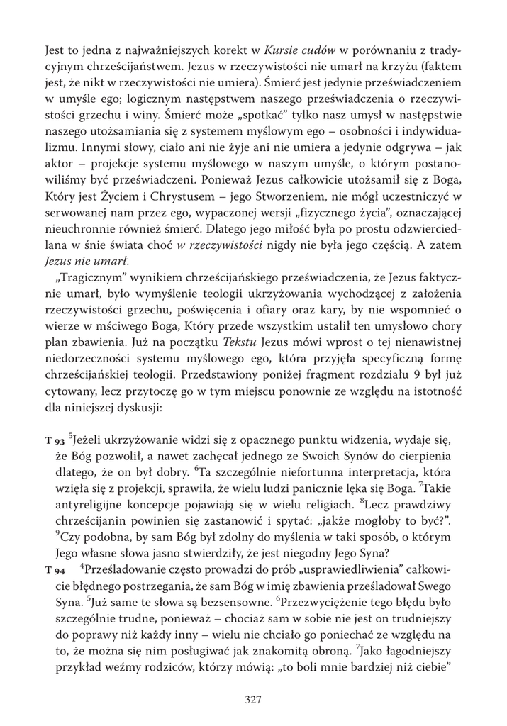 Jest to jedna z najważniejszych korekt w Kursie cudów w porównaniu z tradycyjnym chrześcijaństwem. Jezus w rzeczywistości nie umarł na krzyżu (faktem jest, że nikt w rzeczywistości nie umiera). Śmierć jest jedynie przeświadczeniem w umyśle ego; logicznym następstwem naszego przeświadczenia o rzeczywistości grzechu i winy. Śmierć może „spotkać” tylko nasz umysł w następstwie naszego utożsamiania się z systemem myślowym ego – osobności i indywidualizmu. Innymi słowy, ciało ani nie żyje ani nie umiera a jedynie odgrywa – jak aktor – projekcje systemu myślowego w naszym umyśle, o którym postanowiliśmy być przeświadczeni. Ponieważ Jezus całkowicie utożsamił się z Boga, Który jest Życiem i Chrystusem – jego Stworzeniem, nie mógł uczestniczyć w serwowanej nam przez ego, wypaczonej wersji „fizycznego życia”, oznaczającej nieuchronnie również śmierć. Dlatego jego miłość była po prostu odzwierciedlana w śnie świata choć w rzeczywistości nigdy nie była jego częścią. A zatem Jezus nie umarł. „Tragicznym” wynikiem chrześcijańskiego przeświadczenia, że Jezus faktycznie umarł, było wymyślenie teologii ukrzyżowania wychodzącej z założenia rzeczywistości grzechu, poświęcenia i ofiary oraz kary, by nie wspomnieć o wierze w mściwego Boga, Który przede wszystkim ustalił ten umysłowo chory plan zbawienia. Już na początku Tekstu Jezus mówi wprost o tej nienawistnej niedorzeczności systemu myślowego ego, która przyjęła specyficzną formę chrześcijańskiej teologii. Przedstawiony poniżej fragment rozdziału 9 był już cytowany, lecz przytoczę go w tym miejscu ponownie ze względu na istotność dla niniejszej dyskusji: 5 Jeżeli ukrzyżowanie widzi się z opacznego punktu widzenia, wydaje się, że Bóg pozwolił, a nawet zachęcał jednego ze Swoich Synów do cierpienia dlatego, że on był dobry. 6Ta szczególnie niefortunna interpretacja, która wzięła się z projekcji, sprawiła, że wielu ludzi panicznie lęka się Boga. 7Takie antyreligijne koncepcje pojawiają się w wielu religiach. 8Lecz prawdziwy chrześcijanin powinien się zastanowić i spytać: „jakże mogłoby to być?”. 9 Czy podobna, by sam Bóg był zdolny do myślenia w taki sposób, o którym Jego własne słowa jasno stwierdziły, że jest niegodny Jego Syna? 4 T 94 Prześladowanie często prowadzi do prób „usprawiedliwienia” całkowicie błędnego postrzegania, że sam Bóg w imię zbawienia prześladował Swego Syna. 5Już same te słowa są bezsensowne. 6Przezwyciężenie tego błędu było szczególnie trudne, ponieważ – chociaż sam w sobie nie jest on trudniejszy do poprawy niż każdy inny – wielu nie chciało go poniechać ze względu na to, że można się nim posługiwać jak znakomitą obroną. 7Jako łagodniejszy przykład weźmy rodziców, którzy mówią: „to boli mnie bardziej niż ciebie” T 93 327 i czują się usprawiedliwieni, gdy biją dziecko. 8Czy naprawdę uważasz, że nasz Ojciec w ten sposób myśli? 9Jest kwestią o zasadniczym znaczeniu, by taki rodzaj myślenia został całkowicie rozwiany, gdyż musimy być pewni, iż nic zeń nie pozostaje w twoim umyśle. 10Nie zostałem „ukarany” za to, że ty byłeś zły. 11Na nic pełna życzliwości lekcja nauczana przez Przebłaganie, jeśli zostanie skażona jakąkolwiek formą tego rodzaju wypaczenia. A zatem taka wiara w mściwy gniew Boży, domagający się kary za grzech, jest całkowicie sprzeczna z jezusowym posłaniem prawdziwego przebaczenia – grzechów, które nigdy nie zostały popełnione i dlatego nie wymagają przebłagania a jedynie korekty. To tej lekcji nauczał w Palestynie i znów nas naucza w Kursie cudów. I to Jezus ma na myśli tutaj, namawiając nas do przypomnienia sobie o nim, gdy kusi nas wiara w system myślowy ego – śmierci – i błagając nas o traktowanie go jako „modelu podejmowania decyzji”: Mój umysł zawsze będzie taki jak twój, ponieważ zostaliśmy stworzeni jako równi. 2To tylko moja decyzja dała mi wszelką władzę w Niebie i na ziemi. 3 Moim jedynym darem dla ciebie jest pomóc ci podjąć taką samą decyzję. 4Decyzja ta jest wyborem, by ją podzielać, ponieważ jako taka jest decyzją o podzielaniu. 5Jest podejmowana przez dawanie i dlatego jest jedynym wyborem, który przypomina prawdziwe tworzenie. 6Ja jestem dla ciebie modelem decyzji. 7Decydując się na Boga, pokazałem ci, że można podjąć taką decyzję, i że ty również możesz ją podjąć. T 236 Twoim zmartwychwstaniem jest twoje przebudzenie. 2Jestem wzorem odrodzenia, lecz samo odrodzenie jest po prostu zaświtaniem w twoim umyśle tego, co w nim już jest. 6 294 Muszę posadowić Jego [Boga] kościół na tobie, ponieważ ci, którzy akceptują mnie jako wzór, są dosłownie moimi wyznawcami. 7Wyznawcy są naśladowcami, a jeśli wzór, który naśladują, postanowił oszczędzić im bólu pod każdym względem, nie byliby roztropni, gdyby za nim nie podążali. T 293 T Wróćmy do ostatniego akapitu Patrzenia w siebie: 2 Zdasz sobie sprawę, że to prawda, gdy popatrzysz w siebie i zobaczysz mnie. T 813 Nie znaczy to, że zobaczymy osobę Jezusa, ponieważ Chrystus nie jest osobą. Jezus mówi o widzeniu go, jak w Hamlecie – „oczyma duszy” (I, ii). Tego rodzaju 328 widzenie jest wizją biorącą się z nastawienia zrodzonego z zupełnego przebaczenia. Nie możemy spojrzeć w siebie i widzieć Jezusa – wielkiego symbolu miłości i przebaczenia w tym świecie – jeśli w naszym sercu kryje się nienawiść i osąd. W rzeczywistości i przede wszystkim nienawidzimy i osądzamy dlatego, że nie chcemy go widzieć. Czyste światło, które jest jego życiem przesłania dla nas ciemność winy niechybnie rodzonej przez nasze myśli ataku, skutkiem czego nigdy nie dowiedzielibyśmy się, że śmierci nie ma. Wina woła o śmierć; przebaczenie łagodnie wiedzie nas do wiecznego życia. Czytamy o tym mi