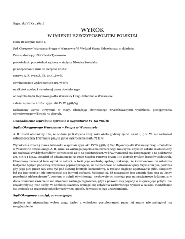 Sygn. akt VI Ka 718/16 WYROK W IMIENIU RZECZYPOSPOLITEJ POLSKIEJ Dnia 18 sierpnia 2016 r. Sąd Okręgowy Warszawa-Praga w Warszawie VI Wydział Karny Odwoławczy w składzie: Przewodniczący: SSO Beata Tymoszów protokolant: protokolant sądowy – stażysta Monika Suwalska po rozpoznaniu dnia 18 sierpnia 2016 r. sprawy A. R. syna Z. i B. ur. (...) w K. obwinionego o wykroczenie z art. 77 KW na skutek apelacji wniesionej przez obwinionego od wyroku Sądu Rejonowego dla Warszawy Pragi-Południe w Warszawie z dnia 24 marca 2016 r. sygn. akt IV W 3518/15 zaskarżony wyrok utrzymuje w mocy, obciążając obwinionego zryczałtowanymi wydatkami postępowania odwoławczego w kwocie 50 złotych. Uzasadnienie wyroku w sprawie o sygnaturze VI Ka 718/16 Sądu Okręgowego Warszawa – Praga w Warszawie A. R. został obwiniony o to, że w dniu 30 listopada 2015 roku około godziny 19:00 na ul. (...) w W. nie zachował ostrożności przy trzymaniu psa, to jest o wykroczenie z art. 77 k. w. Wyrokiem z dnia 24 marca 2016 roku w sprawie sygn. akt: IV W 3518/15 Sąd Rejonowy dla Warszawy Pragi – Południe w Warszawie obwinionego A. R. uznał za winnego popełnienia zarzucanego mu czynu, z tym że ustalił, iż obwiniony nie zachował zwykłych środków ostrożności i za to na podstawie art. 77 k.w. wymierzył mu karę nagany, a na podstawie art. 118 § 1 k.p.w. zasądził od obwinionego na rzecz Skarbu Państwa kwotę 100 złotych tytułem kosztów sądowych. Obwiniony zaskarżył tren wyrok w całości, a treść jego osobistej apelacji wskazuje, że kwestionował on ustalenia faktyczne będące podstawą orzeczenia poprzez przyjęcie, że nie zachował on ostrożności przy trzymaniu psa, podczas gdy jego pies przez cały czas był pod słowną kontrolą komendową, w trakcie ciągłego aportowanie piłki, skupiony był na jego osobie i nie interesował się innymi osobami. Wskazał też, iż niezasadne jest uznanie jego psa za ,,inny przedmiot niebezpieczny’’, bowiem w opinii obwinionego wychowuje on swojego psa na przyjaznego ludziom, a w dacie zdarzenia zwierzę to nie stwarzało żadnego zagrożenia, gdyż z powodu złej pogody w miejscu jego pobytu nie znajdowały się inne osoby. W konkluzji skarżący domagał się uchylenia zaskarżonego wyroku w całości, modyfikując ów wniosek na rozprawie odwoławczej w ten sposób, że wnosił o jego uniewinnienie. Sąd Okręgowy zważył, co następuje: Apelacja jest niezasadna wobec czego żaden z wniosków postulowanych przez jej autora nie zasługiwał na uwzględnienie. Wbrew twierdzeniom obwinionego Sąd Rejonowy poczynił trafne ustalenia faktyczne, znajdujące oparcie w zebranym materiale dowodowym, których nie podważyły dowody uzupełniające przeprowadzone przed sądem odwoławczym. Prawidłowo również Sąd zachowanie obwinionego zakwalifikował jako wykroczenie z art. 77 k.w. Na wstępie zatem warto przypomnieć, co oznacza termin ,,zachowanie zwykłych lub nakazanych środków ostrożności’’, jakim w omawianym przepisie posłużył się ustawodawca. Dobrem chronionym art. 77 k.w. jest szeroko pojęte bezpieczeństwo ludzi i mienia, które może być zagrożone poprzez nieostrożne trzymanie zwierzęcia lub brak jakiejkolwiek kontroli nad zwierzęciem. Nie można również tracić z pola widzenia bezpieczeństwa innych zwierząt, którym może zostać wyrządzona krzywda (vide: M. Mozgawa i in., Kodeks wykroczeń, komentarz, wyd. Lex Warszawa 2007, str. 267 ). Na gruncie tej normy prawnej pod pojęciem „bezpieczeństwo” nie można rozumieć zawężająco jedynie bezpieczeństwa dla zdrowia lub życia, ale także np. bezpieczny odpoczynek, zachowanie nietykalności cielesnej, bezpieczeństwo przed zniszczeniem mienia choćby poprzez jego ubrudzenie czy rozdarcie. Inaczej mówiąc, jeśli istnieje prawdopodobieństwo, że trzymane przez posiadacza zwierzę przestraszy przebiegające dziecko, oszczeka przechodnia czy też inne zwierzę, posiadacz powinien przedsięwziąć wszelkie środki, aby temu zapobiec. Nie ma racji autor apelacji, że jego postępowanie sprowadzające się do nadzoru komendą słowną było w realiach sprawy wystarczające dla osiągnięcia tych celów. Przebywał on ze swym psem w W., w pobliżu bloku mieszkalnego w rejonie ul. (...) około godziny 19 – ej. Zarówno pora jak miejsce były tego rodzaju, że wysoce prawdopodobnie spodziewać się należało wówczas innych uczestników życia w przestrzeni miejskiej. Z nagrania na płycie CD dołączonej przez obwinionego i jego własnego oświadczenia wynika, że w trakcie interwencji podjętej przez funkcjonariusza Policji nadeszła również nieustalona kobieta wyprowadzająca psa na spacer, która zapięła zwierzę na smycz. Sam obwiniony uczynił to w pewnym momencie w trakcie przeprowadzanej interwencji, a wcześniej zaangażował swego psa w zabawę, aby ten „nie podszedł do policjanta i nie przeszkadzał”. Przyznał on także, że pies należy do razy emocjonalnej i pobudliwej, nie odbył specjalistycznego szkolenia i nie zawsze natychmiast reaguje na kierowane do niego komendy. Oznacza to, że używanie wobec niego smyczy – szczególnie gdy wprost nakazał mu to funkcjonariusz Policji - było uzasadnione, by panować nad zwierzęciem w stopniu gwarantującym bezpieczeństwo innym ludziom. Gdyby bowiem, jak chce tego skarżący, jego słowne komendy były wystarczające dla całkowitego opanowania psa ( np. poprzez nakazanie pozostania mu na miejscu w pozycji leżącej), nie zachodziłaby potrzeba odwracania jego uwagi poprzez angażowanie w zabawę piłeczką czy w rezultacie zapięcie na smycz. Takie postępowanie obwinionego dowodzi, że w istocie miał on świadomość faktu, iż mimo treningów ( które powinny jednak być przeprowadzane w miejscu odosobnionym) , pies może nie zastosować się do wydanej komendy. Nie oznacza to, by pies w następstwie tego kogokolwiek pogryzł, ale biegnąc za piłeczką mógł na kogoś wpaść, 
