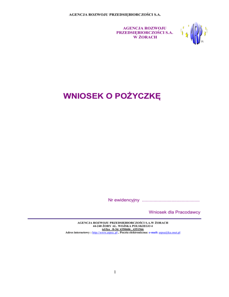 AGENCJA ROZWOJU PRZEDSIĘBIORCZOŚCI S.A. AGENCJA ROZWOJU PRZEDSIĘBIORCZOŚCI S.A. W ŻORACH WNIOSEK O POŻYCZKĘ Nr ewidencyjny ............................................. Wniosek dla Pracodawcy AGENCJA ROZWOJU PRZEDSIĘBIORCZOŚCI S.A.W ŻORACH 44-240 ŻORY AL. WOJSKA POLSKIEGO 4 tel/fax /0-36/ 4350606 , 4351566 Adres internetowy : http://www.arpsa..pl , Poczta elektroniczna: e-mail: [email protected] 1 AGENCJA ROZWOJU PRZEDSIĘBIORCZOŚCI S.A. ..................................................... pieczęć firmowa Wnioskującego ..................................................... miejscowość, data WNIOSEK O FINANSOWANIE I. WNIOSEK O UDZIELENIE POŻYCZKI 1. Proszę o udzielenie pożyczki w kwocie .................................................................................. zł /słownie.................................................................................................................................................../ na okres ........................... miesięcy, w tym karencja ............................................. miesięcy na sfinansowanie: ................................................................................................................................... ......................................................................................................................................................................... ........................................................................................................................................................... 2. Całkowity koszt inwestycji: ............................................. w tym: pożyczka ARP : .............................................................. inne pożyczki / kredyty: ................................................... środki własne: ................................................................... 3. Proponowane prawne zabezpieczenie pożyczki: ......................................................................................... ......................................................................................................................................................................... ........................................................................................................................................................... wartość Forma zabezpieczenia *dotyczy środków trwałych -2- podstawa* wyceny data wyceny* AGENCJA ROZWOJU PRZEDSIĘBIORCZOŚCI S.A. II. OPIS PRZEDSIĘBIORSTWA 1. Dane dotyczące przedsiębiorstwa: Nazwa: ......................................................................................................................................................... Adres ............................................................................................................................................................. Telefon :................................................................... Fax :............................................................................ Nr REGON ............................................................ Nr NIP .......................................................................... Forma prawna przedsiębiorstwa: .................................................................................................................... Organ rejestrowy: ................................................................................... Nr rejestru .................................... Rok założenia ..................................... Fundusze własne ....................................................... w PLN Główni udziałowcy / akcjonariusze: ................................................................................% ................................................................................% ................................................................................% ................................................................................% Forma rozliczeń z Urzędem Skarbowym: ....................................................................................................... Rachunek bankowy (nazwa banku i numer rachunku): ................................................................................... ....................................................................................................................................................................... Dane osobowe Prezesa Zarządu (lub Właściciela) imię i nazwisko: ...................................................... wiek: ........................... wykształcenie: .............................................................................................. Członkowie Zarządu lub współwłaściciele, wspólnicy spółek osobowych (wszyscy): imię i nazwisko: ............................................................................................. imię i nazwisko: ............................................................................................. imię i nazwisko: .............................................................................................. Osoba do kontaktowania się : imię i nazwisko: ............................................................... funkcja: ....................................................... telefon: ........................................................................... fax: .............................................................. -3- AGENCJA ROZWOJU PRZEDSIĘBIORCZOŚCI S.A. 2. Działalność: Podstawowa: ............................................................................................................................................................................... ............................................................................................................................................................................... Dodatkowa: ...............................................................................................................