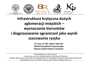 Infrastruktura krytyczna dużych aglomeracji miejskich – wyznaczanie kierunków i diagnozowanie ograniczeń jako wynik szacowania ryzyka mł. insp. dr hab. Agata Tyburska Zakład Zarządzania Kryzysowego Wyższa Szkoła Policji w Szczytnie Plan wystąpienia • Infrastruktura krytyczna państwa, a infrastruktura krytyczna dużych aglomeracji miejskich • Zagrożenia infrastruktury dużych aglomeracji miejskich • Powiązania infrastruktury wielkomiejskiej z systemami: elektroenergetycznym i informatycznym • Szacowanie ryzyka jako element kluczowy przy wyznaczaniu infrastruktury krytycznej • Wnioski i rekomendacje Literatura zalecana: • • • • • • Critical Infrastructure Protection III, red. Ch. Palmer, S. Shenoi, Springer, New York 2009. P. Czajkowski, Castellsa koncepcja miasta globalnego, (w:) Współczesna socjologia miasta. Wielość oglądów i kierunków badawczych dyscypliny, red. I. Borowik, K. Sztalta, Wydawnictwo Uniwersytetu Wrocławskiego, Wrocław 2007. J. Czapska’ Bezpieczeństwo obywateli. Studium z zakresu polityki prawa, Polpress, Kraków 2004. T. Kaczmarek, Zarządzanie ryzykiem. Ujęcie interdyscyplinarne, Difin, Warszawa 2010. W. Karnasiewicz Kuczyński R., Januszewska M., Ocena potencjalnych zagrożeń pracy Krajowego Systemu Elektroenergetycznego (w:) Ochrona infrastruktury krytycznej, red. A. Tyburska, Wydawnictwo Wyższej Szkoły Policji, Szczytno 2010. W. Marciszewski, Prawno-organizacyjne aspekty ochrony infrastruktury krytycznej w przedsiębiorstwie eksploatacji rurociągów naftowych „PRZYJAŹN” w Płocku (w:) Ochrona infrastruktury krytycznej, red. A. Tyburska, Wydawnictwo Wyższej Szkoły Policji, Szczytno 2010. Literatura zalecana: • A. Tyburska, Uodpornienie obiektów, obszarów i urządzeń wobec współczesnych zagrożeń bezpieczeństwa państwa, (w:) Bezpieczeństwo osób podlegających ustawowo ochronie wobec zagrożeń XXI wieku, red. P. Bogdalski, J. Cymerski, K. Jałoszyński, WSPol., Szczytno 2014 • A. Tyburska, Bezpieczeństwo dużych aglomeracji a problematyka ochrony infrastruktury krytycznej, (w:) Bezpieczeństwo dużych i średnich aglomeracji z perspektywy europejskiej, red. M. Lisiecki, B. Sitek, Wydawnictwo Wyższej Szkoły Gospodarki Euroregionalnej im. Alcide De Gasperi, Józefów 2011, • A. Tyburska, Ochrona infrastruktury krytycznej. Zarys problematyki, WSPol., Szczytno 2012 • A. Tyburska, Ochrona infrastruktury krytycznej w Polsce – wyzwania w tworzeniu bezpieczeństwa narodowego, „Zeszyty Naukowe AON” 2013. Dodatek Miejsce infrastruktury krytycznej w przestrzeni globalnej Człowiek IK Nowe technologie Otoczenie Zagrożeniami w obszarze infrastruktury krytycznej określać należy jakąkolwiek oznakę, okoliczność lub zdarzenie, które potencjalnie może spowodować utratę lub zniszczenie elementu kluczowego oraz każdą oznakę zbliżającego się nieuchronnie niebezpieczeństwa występującą w otoczeniu infrastruktury krytycznej Podstawowe czynniki sprowadzające zagrożenia infrastruktury krytycznej Otoczenie/środowisko człowieka Aktywność człowieka (zaniechanie działania) Siły natury Infrastruktura krytyczna Kategorie zagrożeń: • Kategoria I – katastrofy naturalne; • Kategoria II – zagrożenia przypadkowe; • Kategoria III – zagrożenia świadome (celowe). Model wzajemnych powiązań: awaria techniczna, katastrofa naturalna, infrastruktura krytyczna Awaria techniczna Katastrofa naturalna Infrastruktura Krytyczna KIERUNKI DZIAŁANIA: Przyjęta koncepcja uodpornienia IK powinna uwzględniać konieczność wyeliminowania sytuacji sprzyjających najczęściej występującym i najtrudniejszym do społecznego zaakceptowania niewydolnościom, ich diagnozowaniu i dokonywaniu szybkich napraw Ryzyko Zdarzenie o większym stopniu prawdopodobieństwa, w przypadku którego dostępna jest wystarczająca ilość informacji, aby oszacować zarówno prawdopodobieństwo, jak i konsekwencje Analiza ryzyka w ochronie infrastruktury krytycznej dużych aglomeracji miejskich Dzięki odpowiednio przyjętej metodyce, która ustala, co należy brać pod uwagę, aby zbadać określony rodzaj ryzyka możliwe jest aby zastosowana metodologia pozwoliła na zebranie argumentów dla uzasadnienia, dlaczego dane ryzyko powoduje takie a nie inne skutki. Zmierza (…) do ustalenia i objaśnienia kryteriów, w oparciu o które rozstrzyga się o identyfikacji i szczegółowych właściwościach różnego rodzaju ryzyka. T. T. Kaczmarek, Ryzyko i zarządzanie ryzykiem. Ujęcie interdyscyplinarne, Difin, Warszawa2006, s. 21. RYZYKO W przypadku badań prowadzonych w obszarze ryzyka infrastruktury krytycznej, obejmującej różne, niekiedy złożone systemy i podsystemy zapewniające sprawne funkcjonowanie państwa jako organizacji oraz bezpieczeństwo jego obywatelom – wciąż napotyka się ograniczenia, ponieważ „… Metodologia ryzyka nie została (…) dotychczas przedstawiona na poziomie meta (…). W teorii nauki nie zdołano dotąd opracować spójnego warsztatu badawczego odpowiedniego dla badań w tej nowej dyscyplinie. Stosowana w naukach przyrodniczych ogólna metodologia teorii nauki zakładająca, że istnieje ta sama wspólna metodologia badawcza, doprowadziła do licznych sporów oraz powstania wielu szkół”. T.T. Kaczmarek, Ryzyko i zarządzanie ryzykiem … KIERUNKI DZIAŁANIA: Każda infrastruktura krytyczna oceniana pod względem: - powiązań z systemem energoenergetycznym; - powiązań informatycznych; - zagrożeń terrorystycznych. Ochrona infrastruktury krytycznej –wnioski i rekomendacje Złożoność; Dostępność dla wielu użytkowników; Międzynarodowy charakter; Powiększanie rozmiarów i struktury; Wielość organizacji; Konieczność prowadzenia współpracy pomiędzy wieloma podmiotami; • Wzajemne powiązania pomiędzy różnymi podmiotami (instytucjami) wchodzącymi w skład IK; • • • • • • Ochrona infrastruktury krytycznej –wnioski i rekomendacje: •