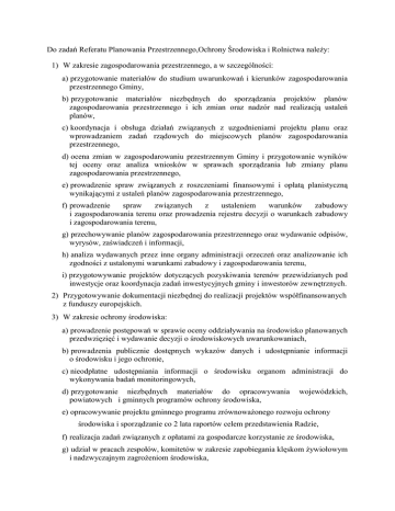 Do zadań Referatu Planowania Przestrzennego,Ochrony Środowiska i Rolnictwa należy: 1) W zakresie zagospodarowania przestrzennego, a w szczególności: a) przygotowanie materiałów do studium uwarunkowań i kierunków zagospodarowania przestrzennego Gminy, b) przygotowanie materiałów niezbędnych do sporządzania projektów planów zagospodarowania przestrzennego i ich zmian oraz nadzór nad realizacją ustaleń planów, c) koordynacja i obsługa działań związanych z uzgodnieniami projektu planu oraz wprowadzaniem zadań rządowych do miejscowych planów zagospodarowania przestrzennego, d) ocena zmian w zagospodarowaniu przestrzennym Gminy i przygotowanie wyników tej oceny oraz analiza wniosków w sprawach sporządzania lub zmiany planu zagospodarowania przestrzennego, e) prowadzenie spraw związanych z roszczeniami finansowymi i opłatą planistyczną wynikającymi z ustaleń planów zagospodarowania przestrzennego, f) prowadzenie spraw związanych z ustaleniem warunków zabudowy i zagospodarowania terenu oraz prowadzenia rejestru decyzji o warunkach zabudowy i zagospodarowania terenu, g) przechowywanie planów zagospodarowania przestrzennego oraz wydawanie odpisów, wyrysów, zaświadczeń i informacji, h) analiza wydawanych przez inne organy administracji orzeczeń oraz analizowanie ich zgodności z ustalonymi warunkami zabudowy i zagospodarowania terenu, i) przygotowywanie projektów dotyczących pozyskiwania terenów przewidzianych pod inwestycje oraz koordynacja zadań inwestycyjnych gminy i inwestorów zewnętrznych. 2) Przygotowywanie dokumentacji niezbędnej do realizacji projektów współfinansowanych z funduszy europejskich. 3) W zakresie ochrony środowiska: a) prowadzenie postępowań w sprawie oceny oddziaływania na środowisko planowanych przedwzięzięć i wydawanie decyzji o środowiskowych uwarunkowaniach, b) prowadzenia publicznie dostępnych wykazów danych i udostępnianie informacji o środowisku i jego ochronie, c) nieodpłatne udostępniania informacji o środowisku organom administracji do wykonywania badań monitoringowych, d) przygotowanie niezbędnych materiałów do opracowywania powiatowych i gminnych programów ochrony środowiska, wojewódzkich, e) opracowywanie projektu gminnego programu zrównoważonego rozwoju ochrony środowiska i sporządzanie co 2 lata raportów celem przedstawienia Radzie, f) realizacja zadań związanych z opłatami za gospodarcze korzystanie ze środowiska, g) udział w pracach zespołów, komitetów w zakresie zapobiegania klęskom żywiołowym i nadzwyczajnym zagrożeniom środowiska, h) współpraca z instytucjami kontrolnymi, i) udostępnianie informacji o środowisku organom administracji wykonującym badania monitoringowe, j) przygotowanie niezbędnych materiałów do opracowywania planów gospodarki odpadami, k) wydawanie pozwoleń na wytwarzanie odpadów, l) opiniowanie wniosków na prowadzenie działalności w zakresie odzysku lub unieszkodliwiania odpadów, m) opiniowanie wniosków w zakresie zbierania lub transportu odpadów, n) wykonywanie innych zadań z zakresu ochrony środowiska oraz ustawy o odpadach, o) prowadzenie spraw w zakresie postępowania z odpadami, współdziałanie w zakresie ochrony środowiska z organami administracji rządowej, samorządowej i jednostkami organizacyjnymi gminy oraz organizacjami społecznymi, p) prowadzenie spraw z zakresu postępowania o udzielenie dotacji (dofinansowania)na zadania z zakresu ochrony środowiska, w tym usuwania azbestu. 4) W zakresie ochrony przyrody: a) wydawanie zezwoleń na usuwanie drzew i krzewów, naliczanie opłat z tego tytułu, b) naliczanie i egzekucja kar za usuwanie drzew i krzewów bez zezwolenia, c) popularyzacja ochrony przyrody i nadzór nad pomnikami przyrody, d) prowadzenie ewidencji i dokumentacji parków wiejskich i pomników przyrody,współpraca z Wojewódzkim Konserwatorem Przyrody. 5) W zakresie prawa wodnego: a) wydawanie decyzji nakazującej przywrócenie stanu poprzedniego wody na gruncie lub wykonanie urządzeń zapobiegających szkodom, b) zatwierdzanie ugody w sprawie zmiany stanu wody, c) wydawanie decyzji na korzystania z części nieruchomości w celu wyznaczenia dostępu do powierzchniowych wód publicznych na potrzeby wykonywania robót związanych z utrzymywaniem wód, 6) Prowadzenie spraw z zakresu ochrony zabytków: a) prowadzenie gminnej ewidencji zabytków, b) sporządzanie gminnego programu opieki nad zabytkami, c) współpraca z Wojewódzkim Konserwatorem Zabytków. 7) W zakresie rolnictwa i leśnictwa: a) propagowanie wśród rolników informacji w zakresie upraw, hodowli i ochrony roślin, z uwzględnieniem współdziałania z terenowym oddziałem kwarantanny i ochrony roślin w zakresie sygnalizacji pojawienia się chwastów, szkodników i chorób na plantacjach rolnych oraz współdziałanie z Inspektoratem Inspekcji Nasiennej w zakresie realizacji zadań wynikających z ustawy o nasiennictwie, b) współdziałanie ze służbą weterynaryjną w zakresie zwalczania chorób zwierzęcych i organizacji profilaktyki weterynaryjnej, c) współdziałanie z ośrodkiem doradztwa rolniczego organizacyjnymi w zakresie szkoleń rolników, i innymi jednostkami d) prowadzenie spraw z zakresu leśnictwa i łowiectwa, z uwzględnieniem współpracy ze starostwem i nadleśnictwami w tym zakresie, e) udzielanie rolnikom informacji i pomocy w dostosowywaniu gospodarstw rolnych do standardów unijnych, uzyskiwania dopłat bezpośrednich i pozyskiwania środków unijnych – ścisła współpraca z Agencją Modernizacji i Restrukturyzacji Rolnictwa, f) przygotowywanie materiałów do wydawania oświadczeń i zaświadczeń o pracy w rolnictwie, g) udział w akcjach usuwania i szacowania szkód w rolnictwie powstałych w wyniku powodzi, suszy, gradobicia, mrozów, wiatrów itp. zjawisk klęskowych, h) przeprowadzanie kontroli spełniania przez rolników obowiązku ubezpieczenia OC i ubezpieczenia budynków rolniczych, i) prowadzenie