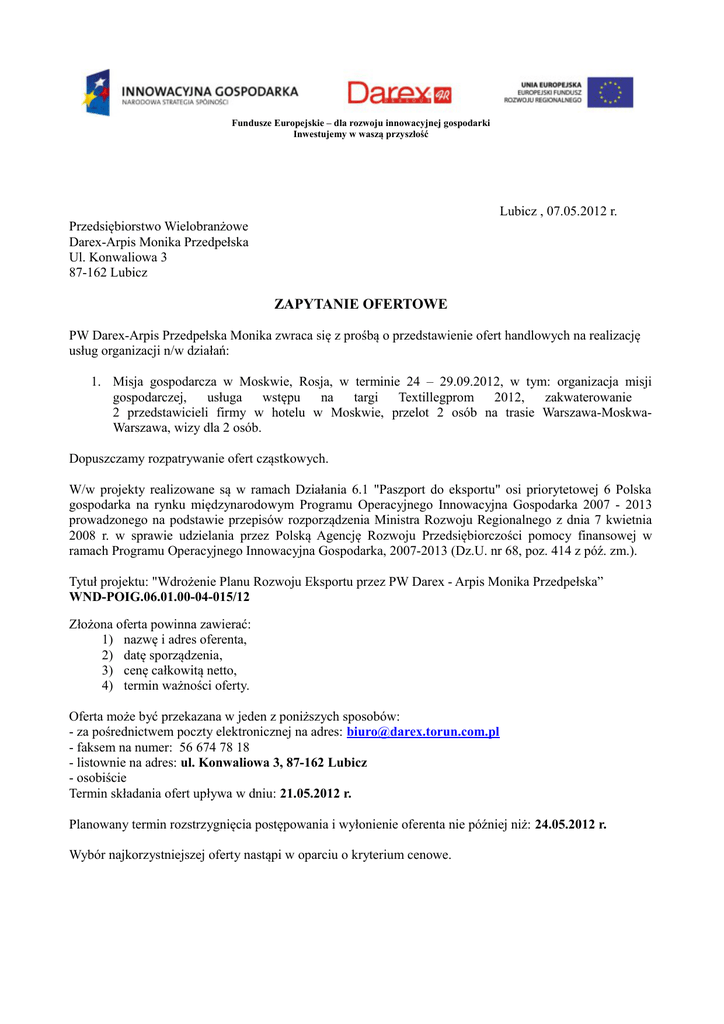 Fundusze Europejskie – dla rozwoju innowacyjnej gospodarki Inwestujemy w waszą przyszłość Lubicz , 07.05.2012 r. Przedsiębiorstwo Wielobranżowe Darex-Arpis Monika Przedpełska Ul. Konwaliowa 3 87-162 Lubicz ZAPYTANIE OFERTOWE PW Darex-Arpis Przedpełska Monika zwraca się z prośbą o przedstawienie ofert handlowych na realizację usług organizacji n/w działań: 1. Misja gospodarcza w Moskwie, Rosja, w terminie 24 – 29.09.2012, w tym: organizacja misji gospodarczej, usługa wstępu na targi Textillegprom 2012, zakwaterowanie 2 przedstawicieli firmy w hotelu w Moskwie, przelot 2 osób na trasie Warszawa-MoskwaWarszawa, wizy dla 2 osób. Dopuszczamy rozpatrywanie ofert cząstkowych. W/w projekty realizowane są w ramach Działania 6.1 "Paszport do eksportu" osi priorytetowej 6 Polska gospodarka na rynku międzynarodowym Programu Operacyjnego Innowacyjna Gospodarka 2007 - 2013 prowadzonego na podstawie przepisów rozporządzenia Ministra Rozwoju Regionalnego z dnia 7 kwietnia 2008 r. w sprawie udzielania przez Polską Agencję Rozwoju Przedsiębiorczości pomocy finansowej w ramach Programu Operacyjnego Innowacyjna Gospodarka, 2007-2013 (Dz.U. nr 68, poz. 414 z póź. zm.). Tytuł projektu: "Wdrożenie Planu Rozwoju Eksportu przez PW Darex - Arpis Monika Przedpełska” WND-POIG.06.01.00-04-015/12 Złożona oferta powinna zawierać: 1) nazwę i adres oferenta, 2) datę sporządzenia, 3) cenę całkowitą netto, 4) termin ważności oferty. Oferta może być przekazana w jeden z poniższych sposobów: - za pośrednictwem poczty elektronicznej na adres: [email protected] - faksem na numer: 56 674 78 18 - listownie na adres: ul. Konwaliowa 3, 87-162 Lubicz - osobiście Termin składania ofert upływa w dniu: 21.05.2012 r. Planowany termin rozstrzygnięcia postępowania i wyłonienie oferenta nie później niż: 24.05.2012 r. Wybór najkorzystniejszej oferty nastąpi w oparciu o kryterium cenowe.