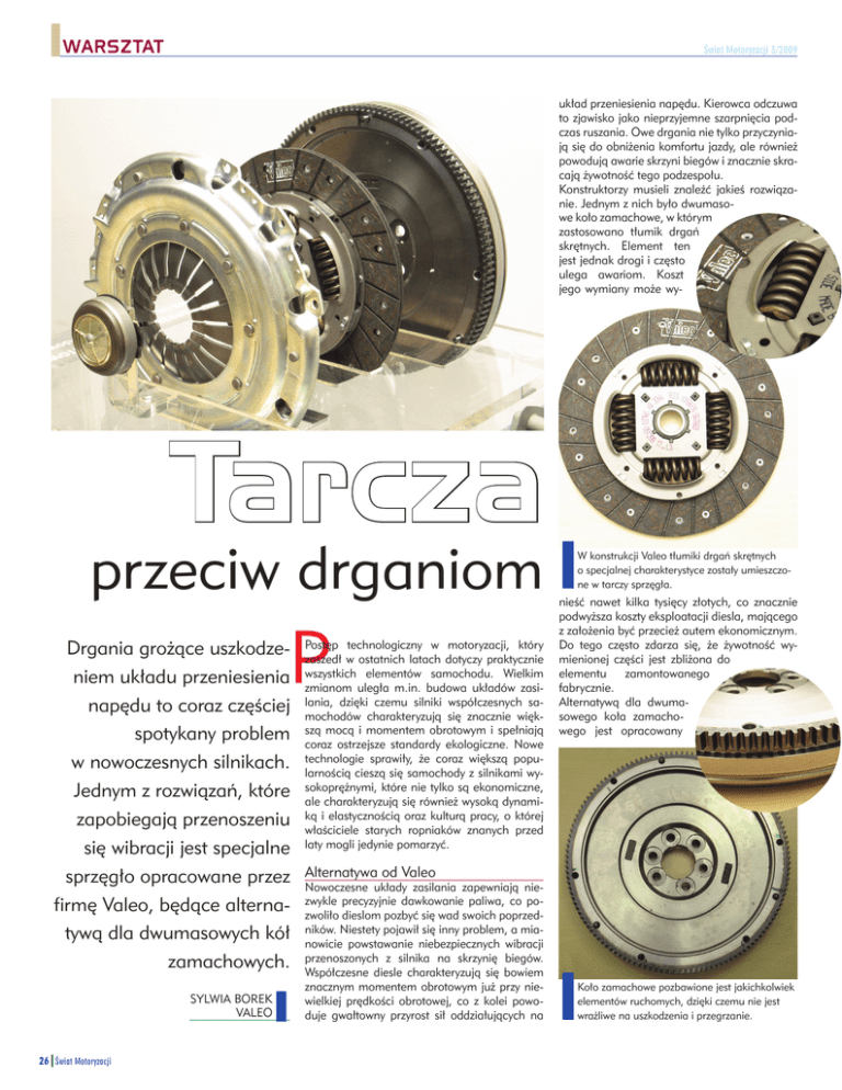 WARSZTAT Świat Motoryzacji 3/2009 układ przeniesienia napędu. Kierowca odczuwa to zjawisko jako nieprzyjemne szarpnięcia podczas ruszania. Owe drgania nie tylko przyczyniają się do obniżenia komfortu jazdy, ale również powodują awarie skrzyni biegów i znacznie skracają żywotność tego podzespołu. Konstruktorzy musieli znaleźć jakieś rozwiązanie. Jednym z nich było dwumasowe koło zamachowe, w którym zastosowano tłumik drgań skrętnych. Element ten jest jednak drogi i często ulega awariom. Koszt jego wymiany może wy- Tarcza przeciw drganiom P Drgania grożące uszkodzeniem układu przeniesienia napędu to coraz częściej spotykany problem w nowoczesnych silnikach. Jednym z rozwiązań, które zapobiegają przenoszeniu się wibracji jest specjalne sprzęgło opracowane przez firmę Valeo, będące alternatywą dla dwumasowych kół zamachowych. SYLWIA BOREK VALEO 26 Świat Motoryzacji Postęp technologiczny w motoryzacji, który zaszedł w ostatnich latach dotyczy praktycznie wszystkich elementów samochodu. Wielkim zmianom uległa m.in. budowa układów zasilania, dzięki czemu silniki współczesnych samochodów charakteryzują się znacznie większą mocą i momentem obrotowym i spełniają coraz ostrzejsze standardy ekologiczne. Nowe technologie sprawiły, że coraz większą popularnością cieszą się samochody z silnikami wysokoprężnymi, które nie tylko są ekonomiczne, ale charakteryzują się również wysoką dynamiką i elastycznością oraz kulturą pracy, o której właściciele starych ropniaków znanych przed laty mogli jedynie pomarzyć. W konstrukcji Valeo tłumiki drgań skrętnych o specjalnej charakterystyce zostały umieszczone w tarczy sprzęgła. nieść nawet kilka tysięcy złotych, co znacznie podwyższa koszty eksploatacji diesla, mającego z założenia być przecież autem ekonomicznym. Do tego często zdarza się, że żywotność wymienionej części jest zbliżona do elementu zamontowanego fabrycznie. Alternatywą dla dwumasowego koła zamachowego jest opracowany Alternatywa od Valeo Nowoczesne układy zasilania zapewniają niezwykle precyzyjnie dawkowanie paliwa, co pozwoliło dieslom pozbyć się wad swoich poprzedników. Niestety pojawił się inny problem, a mianowicie powstawanie niebezpiecznych wibracji przenoszonych z silnika na skrzynię biegów. Współczesne diesle charakteryzują się bowiem znacznym momentem obrotowym już przy niewielkiej prędkości obrotowej, co z kolei powoduje gwałtowny przyrost sił oddziałujących na Koło zamachowe pozbawione jest jakichkolwiek elementów ruchomych, dzięki czemu nie jest wrażliwe na uszkodzenia i przegrzanie. WARSZTAT Świat Motoryzacji 3/2009 przez firmę Valeo komplet sprzęgła, składający się ze sztywnego koła zamachowego, elastycznej tarczy o specjalnej konstrukcji, zespołu dociskowego oraz łożyska wyciskowego (do samochodów z łożyskiem hydraulicznym oferowane są komplety trzyelementowe: koło zamachowe, tarcza i docisk). Nie tylko trwałość Zestaw Valeo ma kilka istotnych cech, dla których warto wybrać właśnie to rozwiązanie. Przede wszystkim konstrukcja ta cechuje się niezawodnością spełniającą najwyższe wymagania. Sztywne koło zamachowe jest praktycznie bezawaryjne, ponieważ nie ma w nim żadnych ruchomych elementów. Za tłumienie drgań odpowiada tarcza w której umieszczono znacznie wydajniejsze (w porównaniu do tradycyjnych sprzęgieł) tłumiki drgań skrętnych, testom, które przeprowadzono w należącym do firmy ośrodku badawczo-rozwojowym w Amiens w północnej Francji. Ich wyniki jednoznacznie potwierdzają, że stopień tłumienia drgań, a także trwałość konstrukcji spełniają najwyższe standardy. Znajduje to również odzwierciedlenie w praktyce, o czym mogli się przekonać goście targów zorganizowanych przez Inter Cars, którzy mieli okazję sprawdzić funkcjonowanie sprzęgła Valeo w Peugeocie 307 podczas jazdy próbnej. Żaden z testujących nie stwierdził różnicy w działaniu pomiędzy konstrukcją Valeo, a zestawem z dwumasowym kołem zamachowym. Wszyscy warsztatowcy wysoko ocenili zarówno płynność przenoszenia momentu obrotowego, jak również komfort zmiany biegów. Warto przy okazji powiedzieć, że sprzęgło w prezentowanym Peugeocie (który był służbowym autem jednego z pracowników Valeo Service Eastern Europe) zostało wymienione z powodu awarii dwumasowego koła, do której doszło przy przebiegu około 40 tys. kilometrów. Po zastąpienia go zestawem Valeo, samochód przejechał bezawaryjnie kolejne 70 tys. kilometrów i nadal jest eksploatowany. Docenione przez rynek Komplety sprzęgieł Valeo odniosły sukces rynkowy. Od kilku lat produkty te znajdują nabywców zarówno w Europie, jak i na pozostałych kontynentach, a ich sprzedaż systematycznie rośnie. Sprzęgła te cieszą się znakomitą opinią warsztatowców, jak również użytkowków samochodów, w których elementy te zostały zastosowane. Potwierdza to, że firmaValeo, czołowy dostawca sprzęgieł na rynek OE, zaoferowała rozwiązanie przemyślane i dopracowane w najmniejszym szczególe. Oferta zestawów sprzę- Zespół dociskowy z zestawu Valeo nie różni się od tych, które stosowane są w konwencjonalnych sprzęgłach. gieł ze sztywnym kołem zamachowym obejmuje 23 referencje, które pokrywają zapotrzebowanie licznej grupy pojazdów, w tym aut wyposażonych w popularne silniki wysokoprężne, takie jak 1.9 TDI (VW), 2.0 HDI (PSA) i 1.8 TDCI (Ford). W najbliższym czasie do stale poszerzanego katalogu włączonych zostanie 5 t kolejnych referencji. Część kompletów wyposażona jest w łożysko wyciskowe. Do aut z łożyskiem hydraulicznym przeznaczone są zestawy trójelementowe. o charakterystyce odpowiednio dobranej do poszczególnych modeli samochodów. Zestaw Valeo zapewnia wysoki poziom filtracji drań i hałasów, dzięki czemu należycie chroni układ przeniesienia napędu oraz pozwala zachować wysoki kom