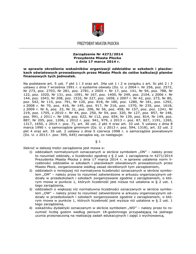 Zarządzenie Nr 4272/2014 Prezydenta Miasta Płocka z dnia 17 marca 2014 r. w sprawie określenia wskaźników organizacji oddziałów w szkołach i placówkach oświatowych prowadzonych przez Miasto Płock do celów kalkulacji planów finansowych tych jednostek. Na podstawie art. 5 ust. 7 pkt 1 i 3 oraz art. 34a ust 1 i 2 w związku z art. 5c pkt 2 i 3 ustawy z dnia 7 września 1991 r. o systemie oświaty (Dz. U. z 2004 r. Nr 256, poz. 2572, Nr 273, poz. 2703, Nr 281, poz. 2781, z 2005 r. Nr 17, poz. 141, Nr 94, poz. 788, Nr 122, poz. 1020, Nr 131, poz. 1091, Nr 167, poz. 1400, Nr 249, poz. 2104, z 2006 r. Nr 144, poz. 1043, Nr 208, poz. 1532, Nr 227, poz. 1658, z 2007 r. Nr 42, poz. 273, Nr 80, poz. 542, Nr 115, poz. 791, Nr 120, poz. 818, Nr 180, poz. 1280, Nr 181, poz. 1292, z 2008 r. Nr 70, poz. 416, Nr 145, poz. 917, Nr 216, poz. 1370, Nr 235, poz. 1618, z 2009 r. Nr 6, poz. 33, Nr 31, poz. 206, Nr 56, poz. 458, Nr 157, poz. poz. 1241, Nr 219, poz. 1705, z 2010 r. Nr 44, poz. 250, Nr 54, poz. 320, Nr 127, poz. 857, Nr 148, poz. 991, z 2011 r. Nr 106, poz. 622, Nr 112, poz. 654, Nr 139, poz. 814, Nr 149, poz. 887, Nr 205, poz. 1206, z 2012 r. poz. 941, 979, z 2013 r. poz. 87, 827, 1191, 1265, 1317, 1650, z 2014 r. poz. 7), art. 30 ust. 2 pkt 4 oraz art. 33 ust. 5 ustawy z dnia 8 marca 1990 r. o samorządzie gminnym (Dz. U. z 2013 r. poz. 594, 1318), art. 32 ust. 2 pkt 4 oraz art. 35 ust. 2 ustawy z dnia 5 czerwca 1998 r. o samorządzie powiatowym (Dz. U. z 2013 r. poz. 595, 645) zarządza się, co następuje: §1 Ilekroć w dalszej treści zarządzenia jest mowa o: 1) oddziałach normatywnych oznaczanych w skrócie symbolem „ON” – należy przez to rozumieć oddziały, o liczebności zgodnej z § 2 ust. 1 zarządzenia nr 4271/2014 Prezydenta Miasta Płocka z dnia 17 marca 2014 r. w sprawie ustalenia norm liczebności oddziałów w szkołach i placówkach oświatowych prowadzonych przez Miasto Płock, zorganizowane według zasad określonych tym zarządzeniem, 2) oddziałach o mniejszej niż normatywna liczebności oznaczanych w skrócie symbolem „OM” – należy przez to rozumieć zatwierdzone w arkuszu organizacyjnym oddziały w przedszkolach i szkołach zorganizowane zgodnie z zarządzeniem, o którym mowa w punkcie 1, których liczebność jest niższa niż ustalona w § 2 ust. 1 tego zarządzenia, 3) oddziałach o większej niż normatywna liczebności oznaczanych w skrócie symbolem „OW” – należy przez to rozumieć zatwierdzone w arkuszu organizacyjnym oddziały w przedszkolach i szkołach zorganizowane zgodnie z zarządzeniem, o którym mowa w punkcie 1, których liczebność jest wyższa niż ustalona w § 2 ust. 1 tego zarządzenia, 4) wskaźniku dydaktyki oznaczanym w skrócie symbolem „WD” – należy przez to rozumieć liczbę godzin według pensum 18-godzinnego przypadającą na jednego ucznia przeznaczoną na realizację zadań edukacyjnych i zajęć z wychowawcą. §2 1. Ustala się standardy zatrudnienia nauczycieli: 2. 3. 4. 5. 1) miejskich przedszkoli stanowiące załącznik nr 1 do zarządzenia, 2) szkół podstawowych stanowiące załącznik nr 2 do zarządzenia, 3) gimnazjów stanowiące załącznik nr 3 do zarządzenia, 4) liceów ogólnokształcących dla młodzieży stanowiące załącznik nr 4 do zarządzenia, 5) techników dla młodzieży stanowiące załącznik nr 5 do zarządzenia, 6) zasadniczych szkół zawodowych dla młodzieży stanowiące załącznik nr 6 do zarządzenia, 7) internatów i burs stanowiące załącznik nr 7 do zarządzenia, 8) świetlic szkolnych stanowiące załącznik nr 8 do zarządzenia, 9) do zadań z zakresu wsparcia psychologicznego, pedagogicznego, logopedycznego, doradztwa zawodowego oraz biblioteki stanowiące załącznik nr 9 do zarządzenia. Wymiar zatrudnienia nauczycieli ustala się biorąc pod uwagę liczbę godzin podaną w załącznikach 1-9 lub wyliczoną jako iloczyn liczby uczniów i wskaźników lub według wzorów, przy czym liczba godzin obliczona ze wskaźnika WD dla OW nie może być wyższa niż 105% liczby godzin odpowiadających najwyższej normatywnej liczebności oddziału. Wymiar zatrudnienia ustalony zgodnie z ust. 1 pkt 1-6 zwiększa się o 2 godziny na każdego ucznia niepełnosprawnego wymagającego zajęć rewalidacyjnych zgodnie z orzeczeniem o potrzebie kształcenia specjalnego wydanym przez publiczną poradnię psychologiczno-pedagogiczną. Wymiar zatrudnienia wyliczony zgodnie z zasadami określonymi w zarządzeniu jest podstawą do ustalania limitu środków w planach finansowych szkół i placówek oświatowo-wychowawczych. Faktyczne zatrudnienie w szkole lub placówce oświatowej ustala dyrektor biorąc pod uwagę potrzeby oraz środki ujęte w planie finansowym. §3 Wykonanie zarządzenia powierzam dyrektorom Wydziału Edukacji i Kultury Urzędu Miasta Płocka i Zarządu Jednostek Oświatowych – Jednostka Budżetowa w Płocku oraz dyrektorom szkół i placówek oświatowych wymienionych w § 2 ust. 1 – każdemu według właściwości. §4 Nadzór nad wykonaniem zarządzenia powierzam Zastępcy Prezydenta Miasta Płocka ds. Polityki Społecznej. §5 Traci moc zarządzenie Nr 2039/2012 Prezydenta Miasta Płocka z dnia 30 sierpnia 2012 r. w sprawie określenia wskaźników organizacji oddziałów w szkołach i placówkach oświatowych prowadzonych przez Miasto Płock do celów kalkulacji planów finansowych tych jednostek. §6 Zarządzenie wchodzi w życie z dniem podpisania. Prezydent Miasta Płocka /-/ Andrzej Nowakowski Załącznik nr 1 do zarządzenia nr 4272/2014 Prezydenta Miasta Płocka z dnia 17 marca 2014 r. Standardy zatrudnienia nauczycieli w miejskich przedszkolach według pensum 18-godzinnego (g18) wyrażone w godzinach dla liczebności do 24 włącznie lub w godzinach na ucznia (g18/u) dla liczebności 25 i OW: Lp Oddział wiekowy dzieci Rodzaj oddziału Liczba godzin dla oddziałów o liczebności do 24 włącznie WD dla oddziałów o liczebności 25 i OW g1