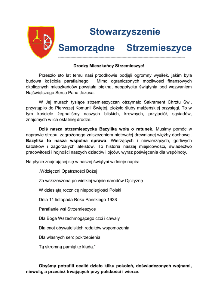 Stowarzyszenie Samorządne Strzemieszyce -------------------------------------------------------------------------------------------------------- Drodzy Mieszkańcy Strzemieszyc! Przeszło sto lat temu nasi przodkowie podjęli ogromny wysiłek, jakim była budowa kościoła parafialnego. Mimo ograniczonych możliwości finansowych okolicznych mieszkańców powstała piękna, neogotycka świątynia pod wezwaniem Najświętszego Serca Pana Jezusa. W Jej murach tysiące strzemieszyczan otrzymało Sakrament Chrztu Św., przystąpiło do Pierwszej Komunii Świętej, złożyło śluby małżeńskiej przysięgi. To w tym kościele żegnaliśmy naszych bliskich, krewnych, przyjaciół, sąsiadów, znajomych w ich ostatniej drodze. Dziś nasza strzemieszycka Bazylika woła o ratunek. Musimy pomóc w naprawie stropu, zagrożonego zniszczeniem nietrwałej drewnianej więźby dachowej. Bazylika to nasza wspólna sprawa. Wierzących i niewierzących, gorliwych katolików i zagorzałych ateistów. To historia naszej miejscowości, świadectwo pracowitości i hojności naszych dziadów i ojców, wyraz poświęcenia dla wspólnoty. Na płycie znajdującej się w naszej świątyni widnieje napis: „Wdzięczni Opatrzności Bożej Za wskrzeszona po wielkiej wojnie narodów Ojczyznę W dziesiątą rocznicę niepodległości Polski Dnia 11 listopada Roku Pańskiego 1928 Parafianie wsi Strzemieszyce Dla Boga Wszechmogącego czci i chwały Dla cnot obywatelskich rodaków wspomożenia Dla własnych serc pokrzepienia Tą skromną pamiątkę kładą.” Obyśmy potrafili ocalić dzieło kilku pokoleń, doświadczonych wojnami, niewolą, a przecież trwających przy polskości i wierze. Obyśmy podczas nadchodzącej Setnej Rocznicy Odzyskania Niepodległości mogli cieszyć się uratowaną świątynią, w której wszyscy, wierzący i nie, przebywamy w ważnych życiowych momentach. Obyśmy, jak nasi poprzednicy, w ten sposób wyrazili wdzięczność „za wskrzeszoną Ojczyznę” i pomogli w remoncie „dla własnych serc pokrzepienia”. Zwracamy się do wszystkich z apelem o poparcie dla inicjatywy przeznaczenia finansów z Dąbrowskiego Budżetu Partycypacyjnego na przyszły rok na ratowanie jedynego zabytku w naszej dzielnicy. Prosimy autorów zgłoszonych projektów o wielkoduszność i zgodę na przełożenie ich realizacji o kolejny rok. Apelujemy do Prezydenta Miasta i Radnych Rady Miejskiej o podjęcie działań prawnych w tym zakresie. Ważny jest bowiem czas, a kwota 514 tys. zł, przeznaczona dla Strzemieszyc, to istotne wsparcie dla tak koniecznego remontu.. Apelujemy o pomoc do zakładów pracy, do firm, do instytucji i do wszystkich ludzi dobrej woli. Dzisiaj Strzemieszyce potrzebują pomocy bardziej niż kiedykolwiek. Zarząd Stowarzyszenia Samorządne Strzemieszyce Tadeusz Bagiński Jerzy Reszke Alicja Wiatrowska-Cieplak Aleksandra Janik Halina Mucha Zbigniew Legarski Jacek Sobczyk Konto Parafii NSPJ w Strzemieszycach 90 1020 2498 0000 8902 0165 2213 Anna Zagrodnik Anna Żur
