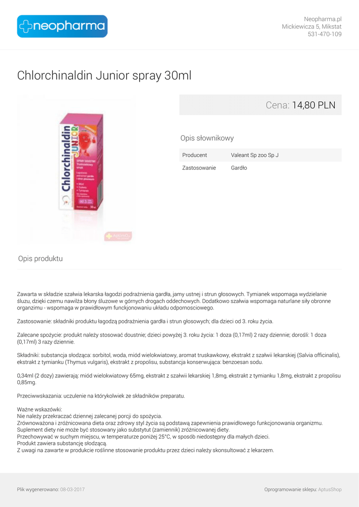 Neopharma.pl Mickiewicza 5, Mikstat 531-470-109 Chlorchinaldin Junior spray 30ml Cena: 14,80 PLN Opis słownikowy Producent Valeant Sp zoo Sp J Zastosowanie Gardło Opis produktu Zawarta w składzie szałwia lekarska łagodzi podrażnienia gardła, jamy ustnej i strun głosowych. Tymianek wspomaga wydzielanie śluzu, dzięki czemu nawilża błony śluzowe w górnych drogach oddechowych. Dodatkowo szałwia wspomaga naturlane siły obronne organzimu - wspomaga w prawidłowym funckjonowaniu układu odpornosciowego. Zastosowanie: składniki produktu łagodzą podrażnienia gardła i strun głosowych; dla dzieci od 3. roku życia. Zalecane spożycie: produkt należy stosować doustnie; dzieci powyżej 3. roku życia: 1 doza (0,17ml) 2 razy dziennie; dorośli: 1 doza (0,17ml) 3 razy dziennie. Składniki: substancja słodząca: sorbitol, woda, miód wielokwiatowy, aromat truskawkowy, ekstrakt z szałwii lekarskiej (Salvia officinalis), ekstrakt z tymianku (Thymus vulgaris), ekstrakt z propolisu, substancja konserwująca: benzoesan sodu. 0,34ml (2 dozy) zawierają: miód wielokwiatowy 65mg, ekstrakt z szałwii lekarskiej 1,8mg, ekstrakt z tymianku 1,8mg, ekstrakt z propolisu 0,85mg. Przeciwwskazania: uczulenie na którykolwiek ze składników preparatu. Ważne wskazówki: Nie należy przekraczać dziennej zalecanej porcji do spożycia. Zrównoważona i zróżnicowana dieta oraz zdrowy styl życia są podstawą zapewnienia prawidłowego funkcjonowania organizmu. Suplement diety nie może być stosowany jako substytut (zamiennik) zróżnicowanej diety. Przechowywać w suchym miejscu, w temperaturze poniżej 25°C, w sposób niedostępny dla małych dzieci. Produkt zawiera substancję słodzącą. Z uwagi na zawarte w produkcie roślinne stosowanie produktu przez dzieci należy skonsultować z lekarzem. Plik wygenerowano: 08-03-2017 Oprogramowanie sklepu: AptusShop Neopharma.pl Mickiewicza 5, Mikstat 531-470-109 Spożycie w nadmiernych ilościach może mieć efekt przeczyszczający. Produkt zawiera miód i propolis. Plik wygenerowano: 08-03-2017 Powered by TCPDF (www.tcpdf.org) Oprogramowanie sklepu: AptusShop