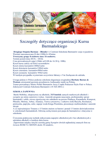 Szczegóły dotyczące organizacji Kursu Barmańskiego Drugiego Stopnia Barman – Blender w Centrum Szkolenia Barmanów sesja wyjazdowa Wariant zaawansowany10 dni (100h) h=45minu Tworzymy grupy 8 osobowe max 16 osobowe. Termin jesień/zima 2015r. / 2016r. Czas prowadzonych zajęć (10dni od 8.00 do 16.30 tj. 100h). Koszt kursu zależy od ilości uczestników: Koszt ośmiu kursantów1400zł netto Koszt dziesięciu kursantów1200zł netto Koszt czternastu kursantów990zł netto Koszt szesnastu kursantów 950zł netto W każdym przypadku wystawiam oczywiście faktury z Vat Zachęcam do udziału. Uwaga jedyna w Polsce podczas szkolenia degustacja oryginalnej Herbaty Barnes & Watson ceremoniał parzenia przedstawia Ambasador marki na Polskę. Trener prowadzący Mistrz Polski Barmanów Jerzy Czapla Prekursor Stylu Flair w Polsce. Założyciel Centrum Szkolenia Barmanów (18 XII 2001r.) SZKOŁA ZAPEWNIA Barek Mobilny, ekspozytory na alkohole, 315 butelek samych markowych alkoholi i syropów po niżej częściowy wykaz. Autorski program nauczania, profesjonalny sprzęt barmański i szkło, owoce egzotyczne nie zabraknie na pewno Pitahaya, Karambola, Kunqwat, Phisalis, Melony, Arbuz, Ananasy, Trawa cytrynowa, i ciekawe zioła Bazylia, Rozmaryn, pietruszka, papryka, seler, napoje woda Kinga Pienińska, prezentacje multimedialne i autorski skrypt. A co najważniejsze Trenera z 15 letnim stażem za barem i ponad 13 letnim doświadczeniem w szkoleniach barmańskich. Główną cechą trenera jest pasja do barmaństwa i charyzma w szkoleniu. Ćwiczenia praktyczne technik miksowania napojów alkoholowych i bez alkoholowych z udziałem alkoholi w każdym dniu kursu. Zapewniam między innymi szeroką gamę Syropów dwóch najbardziej znanych firm na świecie ROSE’S i MONIN około 30 smaków, 1 Likierów De Kupera 15 rodzajów i duży wybór likierów cytrusowych Gran Marnier, Curacao Orange, Aurum, Mandarin Napoleon,Cointrau, Limonchello, win południowe Sherry, Porto, Malaga, Madera i Wermouthy Noli Pratt, Martini, Cinzano, Istra, Wódek czystych i gatunkowych miedzy innymi Maximus, Stolichnaya, Finlandia wszystkie rodzaje, Żołądkowa, Giny Hendrisk, Bombay, Sigrams, Finsberry, Gordons, . Oraz takich rarytasów jak Arak z Sri Lanki, Tajlandii, Indonezji, Armaniak 3,6 i 8 lat, Calvados VS i VSOP, Grapy Pour i Rezerve, Koniaki Hennessy, Martel, Otard, oryginalne Tequile El Jimador, Huradduro Blanco, Repasado i Anejo, Whisky Macollan 10,12, 15, 18 lat, Blantons, Woodford, Grants ’Jeam Beam, Famous Grous, Bushmills i Jameson, czy oryginalnej Japońskiej whisky Yamazaki 12’ Pisco z Peru, Rum Redboull z Australi rumy z Jamajki, Kuby, Porto Rico, Dominicana, Cachasa z Brazyli i wiele, wiele innych znakomitych alkoholi łącznie ponad 310 butelek. DOŚWIADCZENIE WYKŁADOWCY Wykładowcą jest Jerzy Czapla z wieloletnim stażem pracy w gastronomii (Absolwent Zespołu Szkól Gastronomicznych w Tarnowskich Górach) Udokumentowane Piętnaście lat pracy za barem, jako barman i manager barów Kursy prowadzi od 15 lat, z czego od 13 lat w Centrum Szkolenia Barmanów z własnym programem autorskim. Laureat wielu konkursów barmańskich w kraju i zagranicą kilkukrotny Mistrz Polski. Firma Centrum Szkolenia Barmanów jest wpisana w Krajowy Rejestr Firm Szkolących pod numerem 2.14/00157/2008 Mamy również duże doświadczenie w prowadzeniu kursów unijnych w ramach EFS. Ćwiczenia praktyczne technik miksowania napojów alkoholowych i bez alkoholowych z udziałem alkoholi w każdym dniu kursu. Zapewniam między innymi szeroką gamę Syropów dwóch najbardziej znanych firm na świecie ROSE’S i MONIN około 30 smaków, Likierów De Kupera 15 rodzajów i duży wybór likierów cytrusowych [ Gran Marnier, Curacao Orange, Aurum, Mandarin Napoleon,Cointrau, Limonchello] , win południowe Sherry, Porto, Malaga, Madera i Wermouthy Noli Pratt, Martini, Cinzano, Istra, Wódek czystych i gatunkowych miedzy innymi Maximus, Stolichnaya, Finlandia wszystkie rodzaje, Żołądkowa, Giny Hendrisk, Bombay, Sigrams, Finsberry, Gordons, . Oraz takich rarytasów jak Arak z Sri Lanki, Tajlandii, Indonezji, Armaniak 3,6 i 8 lat, Calvados VS i VSOP, Grapy Pour i Rezerve, Koniaki Hennessy, Martel, Otard, oryginalne Tequile El Jimador, Huradduro Blanco, Repasado i Anejo, Whisky Macollan 10,12, 15, 18 lat, Blantons, Woodford, Grants ’Jeam Beam, Famous Grous, Bushmills i Jameson, czy oryginalnej Japońskiej whisky Yamazaki 12’ Pisco z Peru, Rum Redboull z Australi rumy z Jamajki, Kuby, Porto Rico, Dominicana, Cachasa z Brazyli i wiele, wiele innych znakomitych alkoholi łącznie ponad 315 butelek. Barek Mobilny, Autorski program nauczania, profesjonalny sprzęt barmański i szkło, owoce egzotyczne nie zabraknie na pewno Pitahaya, Karambola, Kunqwat, Phisalis, Melony, Arbuz, Ananas, Trawa cytrynowa, i ciekawe zioła Bazylia, Rozmaryn, pietruszka, papryka, seler, napoje woda Kinga Pienińska, prezentacje multimedialne i autorski skrypt. 2 A co najważniejsze Trenera z 15 letnim stażem za barem i ponad 13 letnim doświadczeniem w szkoleniach barmańskich. Główną cechą trenera jest pasja do barmaństwa i charyzma w szkoleniu. PROGRAM 100 godzin Z PODZIAŁEM NA DNI. Pierwszy dzień Przypomnienie technik mieszania, Ogólne charakterystyka alkoholi wykorzystywanych w czasie kursu Profesjonalne Szkło i Sprzęt barowy Technika układania tęczówek Drugi dzień Psychologiczne uwarunkowania pracy w barze Towaroznawstwo Likiery metody produkcji i opisanie gatunków. Grupa Short podział i sposoby ich przyrządzania (Cocktaile, Pousse Cafe, Old Fashioned, Crusta i Daisy. Trzeci dzień Towaroznawstwo Aperitify z podziałem na rodzaje i gatunki Grupa Soft podział i sposoby ich przyrządzania (Ade, Milk Shake, Milk Soda) Czwarty dzień Metody sprzedażowe wykorzystywane w barze Sztuka prowadzenia baru. Towaroznawstwo Wódka Naturalna Brandy (Armaniak, Koniak, Grappa, Calvados, Pisco) Grupa Soft kontynuacja (Ice Tea, Ice Coffe, Granita i Vi