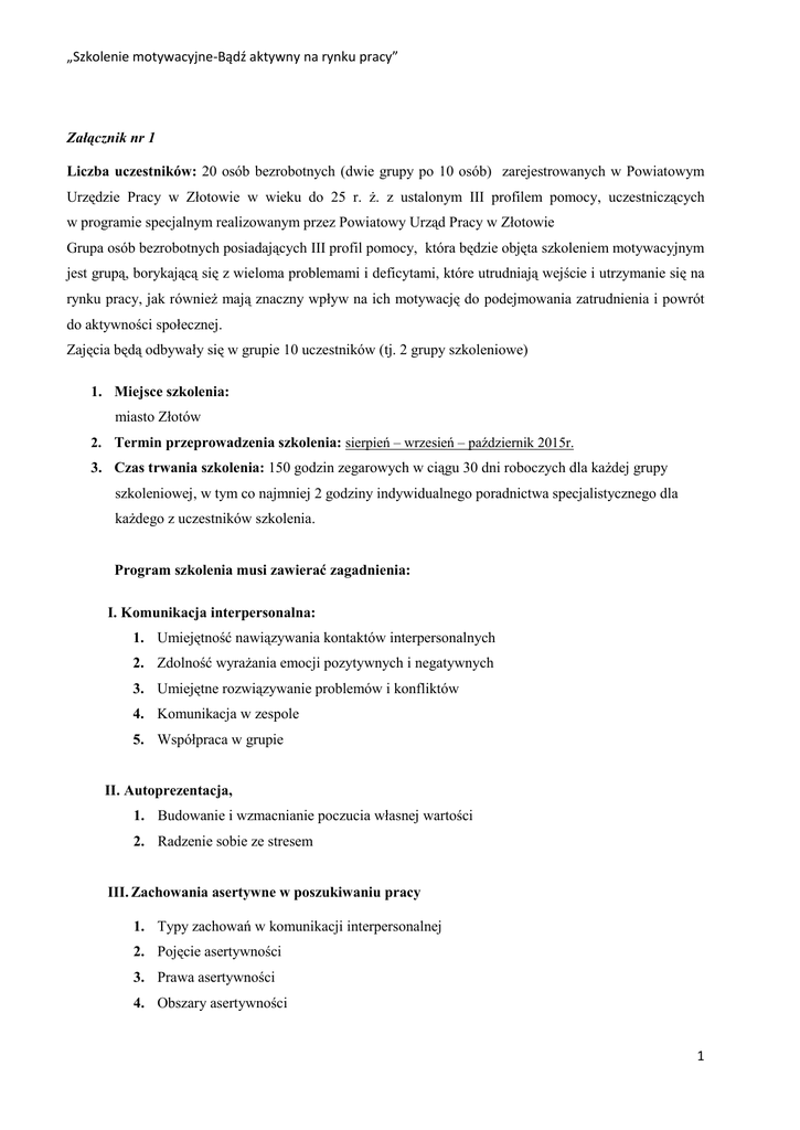 „Szkolenie motywacyjne-Bądź aktywny na rynku pracy” Załącznik nr 1 Liczba uczestników: 20 osób bezrobotnych (dwie grupy po 10 osób) zarejestrowanych w Powiatowym Urzędzie Pracy w Złotowie w wieku do 25 r. ż. z ustalonym III profilem pomocy, uczestniczących w programie specjalnym realizowanym przez Powiatowy Urząd Pracy w Złotowie Grupa osób bezrobotnych posiadających III profil pomocy, która będzie objęta szkoleniem motywacyjnym jest grupą, borykającą się z wieloma problemami i deficytami, które utrudniają wejście i utrzymanie się na rynku pracy, jak również mają znaczny wpływ na ich motywację do podejmowania zatrudnienia i powrót do aktywności społecznej. Zajęcia będą odbywały się w grupie 10 uczestników (tj. 2 grupy szkoleniowe) 1. Miejsce szkolenia: miasto Złotów 2. Termin przeprowadzenia szkolenia: sierpień – wrzesień – październik 2015r. 3. Czas trwania szkolenia: 150 godzin zegarowych w ciągu 30 dni roboczych dla każdej grupy szkoleniowej, w tym co najmniej 2 godziny indywidualnego poradnictwa specjalistycznego dla każdego z uczestników szkolenia. Program szkolenia musi zawierać zagadnienia: 1. T I.r Komunikacja interpersonalna: e 1. Umiejętność nawiązywania kontaktów interpersonalnych 2. Zdolność wyrażania emocji pozytywnych i negatywnych 3. Umiejętne rozwiązywanie problemów i konfliktów 4. Komunikacja w zespole 5. Współpraca w grupie II. Autoprezentacja, 1. Budowanie i wzmacnianie poczucia własnej wartości 2. Radzenie sobie ze stresem III. Zachowania asertywne w poszukiwaniu pracy 1. Typy zachowań w komunikacji interpersonalnej 2. Pojęcie asertywności 3. Prawa asertywności 4. Obszary asertywności 1 „Szkolenie motywacyjne-Bądź aktywny na rynku pracy” 5. Zachowania asertywne IV. Trening umiejętności społecznych: 1. Wyznaczanie i osiąganie celów społecznych 2. Sposoby planowania własnej ścieżki rozwoju zawodowego 3. Dobra organizacja czasu pracy 4. Motywacja do pracy i do zmiany istniejącej sytuacji społeczno – ekonomicznej V. Bariery na drodze do zatrudnienia 1. Poszukiwanie pracy 2. Bariery na drodze do zatrudnienia 3. Motywacja do pokonywania barier 4. Twórcze rozwiązywanie problemów 5. Gotowość do podjęcia pracy VI. Przygotowanie do rozmowy z pracodawcą 1. Przygotowanie do rozmowy kwalifikacyjnej 2. Rozmowa kwalifikacyjna w procesie rekrutacji 3. Rozmowa kwalifikacyjna VII. Plan poszukiwania pracy 1. Planowanie działań 2. Plan poszukiwania pracy 3. Strategie poszukiwania barier w realizacji planów VIII. Jak poruszać się po rynku pracy: 1. Tworzenie profesjonalnych dokumentów aplikacyjnych, 2. Metody rekrutacji, 3. Aktywne metody poszukiwania pracy. IX. Analiza rynku pracy 1. Rynek pracy 2. Analiza lokalnego rynku pracy 3. Źródła informacji o rynku pracy 2 „Szkolenie motywacyjne-Bądź aktywny na rynku pracy” X. Formy zatrudnienia 1. Świadczenia pracy 2. Elastyczne formy organizacji pracy 3. Wolontariat XI. Oferty na rynku pracy 1. Metody poszukiwania pracy 2. Pracodawca szuka pracownika Podjęcie zatrudnienia XII. 1. Wymagania pracodawcy 2. Nowa praca 3. Rozwój zawodowy 1. Organizacja zajęć: 1) warunki ogólne: a) zajęcia będą trwały nie mniej niż 5 godzin zegarowych dziennie w każdym dniu szkolenia, ponadto musi zostać przeprowadzona 1 godzina zajęć integracyjnych w pierwszym dniu szkolenia, b) zajęcia odbywać się będą według planu nauczania obejmującego przeciętnie nie mniej niż 25 godzin zegarowych w tygodniu, c) zajęcia nie mogą trwać dłużej niż do godziny 16:00. d) zastosowanie nowoczesnych metod edukacyjnych: - burza mózgów - śnieżna kula - analiza indywidualnego przypadku e) każdy uczestnik szkolenia musi zostać wyposażony w materiały szkoleniowe tj. brulion 16 kartkowy formatu A5, długopis, skrypty tematyczne zgodne z zakresem szkolenia, z możliwością notatek przy materiałach piśmiennych, przekazane uczestnikom szkolenia za potwierdzeniem odbioru, z wyszczególnieniem przekazanych materiałów szkoleniowych na własność. 2) organizacja zajęć: a) miejsce: miasto Złotów, b) warsztaty muszą odbywać się w sali szkoleniowej o powierzchni minimum 25m2, 3 „Szkolenie motywacyjne-Bądź aktywny na rynku pracy” spełniającej wymagania ergonomiczne i bhp, wyposażone w odpowiednią ilość miejsc i stolików, dla każdego uczestnika odrębne miejsce tj. 10 stanowisk szkoleniowych oraz Warsztaty szkoleniowe muszą być również prowadzone na świeżym powietrzu. c) uczestnicy szkolenia muszą mieć możliwość skorzystania z pomieszczeń sanitarnych i socjalnych, d) pomieszczenie musi być wyposażone w narzędzia i sprzęt umożliwiający przeprowadzenie szkolenia tj. tablice, projektor multimedialny, ekran. Używane materiały, sprzęt, urządzenia itp. wykorzystywane przy realizacji szkolenia muszą być zgodne z normami polskimi, posiadać stosowne atesty, aprobaty techniczne, certyfikaty i dopuszczenia do użytkowania. 2. Wymagania kwalifikacyjne stawiane wykładowcom: 1) do zajęć z zakresu poradnictwa specjalistycznego i w zakresie komunikacji werbalnej i niewerbalnej oraz komunikacji społecznej w grupie w miejscu pracy wymagane jest posiadanie wykształcenia wyższego mgr psycholog z co najmniej dwuletnim doświadczeniem zawodowym na stanowisku psycholog społeczny. 2) do realizacji warsztatów szkoleniowych jednostka szkoleniowa musi wskazać: przynajmniej czterech wykładowców do realizacji warsztatów z wykształceniem wyższym pedagogicznym lub psychologicznym lub andragogiki lub poradnictwo zawodowe posiadających co najmniej trzyletnie doświadczenie zawodowe w okresie ostatnich pięciu lat przed dniem złożenia oferty na stanowisku doradcy zawodowego, psychologa, pedagoga, andragoga. W tym w zakresie przeprowadzenia co najmniej 10 warsztatów wraz z grupowym i indywidualnym poradnictwem dla grupy co najmniej dziesięcioosobowej w okresie ostatnich dwóch lat przed dniem złożenia oferty. W 