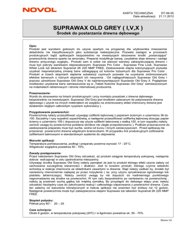 KARTA TECHNICZNA DT-06-05 Data aktualizacji: 21.11.2012 SUPRAWAX OLD GREY ( I,V,X ) Środek do postarzania drewna dębowego Opis: Produkt jest wyrobem gotowym do uŜycia opartym na przyjaznej dla uŜytkownika mieszaninie składników nie klasyfikowanych jako substancje niebezpieczne. Pozwala zastąpić w procesach produkcyjnych bądź aplikacjach bezpośrednio na inwestycjach stosowane środki „postarzające” powierzchnie drewna oparte na amoniaku. Preparat modyfikuje barwę, uwydatnia słoje drewna i nadaje drewnu antycznego wyglądu.. Produkt sam w sobie nie stanowi warstwy zabezpieczającej drewno i musi być pokryty warstwami olejowoskowymi: Suprawax Pro Color , Suprawax Fine Look, Suprawax White Look lub lakierem Supramal 2K 220 NMP FREE. Zastosowanie olejów koloryzujących pozwala uzyskać niepowtarzalną zmianę barw odbiegającą od kolorów toŜsamych dla Suprawax Pro Color . Produkt w trzech stopniach stęŜenia substancji czynnych pozwala na uzyskanie zróŜnicowanych efektów barwnych o róŜnych stopniach ich nasycenia . Od najłagodniejszych Suprawax Old Grey I poprzez uśrednione Suprawax Old Grey V do najintensywniejszych Suprawax Old Grey X. Poglądowe moŜliwości uzyskania barw zamieszczone są w „Tabeli Kolorów Suprawax Old Grey” zamieszczonych na materiałach reklamowych i stronie internetowej producenta. Przeznaczenie: Wyrób do stosowania na liniach produkcyjnych i przy montaŜu posadzek z drewna dębowego bezpośrednio na inwestycjach. Suprawax Old Grey jest środkiem zalecanym do patynowania drewna dębowego ( uŜycie na innych materiałach ze względu na zróŜnicowany skład chemiczny drewna jest działaniem objętym całkowitym ryzykiem wykonawcy ). Przygotowanie powierzchni: Powierzchnię naleŜy przeszlifować uŜywając szlifierki bębnowej z papierem ściernym o uziarnieniu 36 do 100. Szczeliny i rysy wypełnić szpachlówką, a następnie przeszlifować szlifierką bębnową stosując papier ścierny o uziarnieniu 100 ( dopuszcza się uŜycie szlifierki talerzowej z siatką 120, w tym wypadku naleŜy zwrócić uwagę by powierzchnia poddana obróbce nie uległa przepolerowaniu ). PodłoŜe przeznaczone do zastosowania preparatu musi być suche, wolne od kurzu i innych zanieczyszczeń. Przed aplikacją nie przecierać powierzchni drewna wilgotnymi ściereczkami. W przypadku linii produkcyjnych szlifowanie szlifierkami taśmowymi w standardowym systemie do olejowania. Warunki aplikacji: Temperatura pomieszczenia, podłogi i preparatu powinna wynosić 17 - 25° C. Wilgotność względna powietrza 50 - 70%. Zasady postępowania: Przed nałoŜeniem Suprawax Old Grey odczekać, aŜ produkt osiągnie temperaturę pokojową, następnie dobrze wstrząsnąć w celu ujednolicenia mieszaniny. UŜywając środka Suprawax Old Grey naleŜy pamiętać Ŝe jest to produkt którego efekt uŜycia zaleŜy od zachowania szczególnej staranności i dbałości. Jest to bowiem produkt, którego czynne składniki wchodzą w reakcje chemiczne ze składnikami zawartymi w drewnie. Stąd naleŜy zadbać by, środek był naniesiony równomiernie najlepiej po przez rozpylenie ( np. przy uŜyciu opryskiwacza ogrodowego lub pistoletu lakierniczego). NaleŜy zwrócić uwagę by nie dopuścić do nadmiernego punktowego nagromadzenia się środka na powierzchni. W tym celu bezpośrednio po naniesieniu na powierzchnię , naleŜy ją przetrzeć suchą gąbką lub miękką szmatką. By przystąpić do dalszego etapu prac naleŜy odczekać niezbędny czas do zakończenia reakcji i całkowitego odparowania z powierzchni drewna. Czas ten zaleŜny od warunków klimatycznych w trakcie aplikacji nie powinien być krótszy niŜ 12 godzin, Następnie powierzchnia moŜe być zabezpieczona olejami Suprawax lub lakierem Supramal 2K 220 NMP FREE . Stopień połysku: Półmat przy 60° : 20 – 25 Czas schnięcia: Około 6 godzin, w temperaturze pokojowej (20°C) i w ilgotności powietrza ok. 50 - 70% Strona 1/2 KARTA TECHNICZNA DT-06-05 Data aktualizacji: 21.11.2012 Kolor: po aplikacji: w zaleŜności od stęŜenia od Ŝółtego do brązowego Zapach: Delikatny, słabo wyczuwalny. Wydajność: 2 - w zaleŜności od sposobu nanoszenia od 10 do 20g/m Zawartość lotnych związków organicznych: VOC II/A/f limit* = 130 g/l VOC 0g/l *dla mieszaniny gotowej do aplikacji zgodnie z Dyrektywą UE 2004/42/CE Sposoby aplikacji: Ciśnieniowe urządzenia do rozpylania Czyszczenie narzędzi: Czyścić wodą bezpośrednio po uŜyciu. Okres i warunki przechowywania: 24 miesięcy od daty produkcji w temperaturze powyŜej 5°C.w szczelnie zamkni ętych opakowaniach Przepisy BHP: Podane w Karcie Charakterystyki dla danego wyrobu. Opakowanie: Pojemnik z tworzywa 5L Inne informacje: Efektywność naszych systemów jest wynikiem badań laboratoryjnych oraz wieloletniego doświadczenia. Dane zawarte w niniejszym materiale są zgodne z aktualnym stanem wiedzy o naszych produktach i moŜliwościach ich stosowania. Gwarantujemy wysoką jakość pod warunkiem, Ŝe są spełnione nasze instrukcje i Ŝe praca jest wykonana zgodnie z zasadami dobrego rzemiosła. Konieczne jest wykonanie próbnego zastosowania produktu ze względu na potencjalnie róŜne zachowanie się wyrobu z róŜnymi materiałami. Nie ponosimy odpowiedzialności jeŜeli na końcowy rezultat pracy miały wpływ czynniki znajdujące się poza naszą kontrolą. Strona 2/2