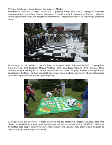 I Turniej Szachowy w Domu Pomocy Społecznej w Mirsku Mieszkańcy DPS- ów z Mirska, Nielestna i Zgorzelca wzięli udział w I Turnieju Szachowym zorganizowanym przez Dom Pomocy Społecznej z Mirska w dniu 21 czerwca br. Oprócz rywalizacji turniej był również okazją dla wszystkich mieszkańców i zaproszonych gości do wspólnego spędzenia czasu. W turnieju udział wzięło 5 zawodników: Dominik Kojder, Edmund Pichlak, Przemysław Grzegorzewski - DPS Zgorzelec; Marian Wichłacz - DPS Mirsk; Jerzy Różański - DPS Nielestno. Mecz finałowy rozegrali: D. Kojder i E. Pichlak - wynik końcowy: remis. Wszyscy uczestnicy turnieju dostali pamiątkowe dyplomy i drobne upominki. Za sprawowanie nadzoru nad rozgrywkami dziękujemy panu Andrzejowi Dwilewiczowi z Jeleniej Góry. W trakcie zawodów na terenie ogrodu odbywały się gry plenerowe: kręgle, chińczyk, lotki oraz okręgi, a zawodników w przerwach dopingowali swoimi występami grupa "SKAUCI" z DPS-u w Nielestnie oraz zespół folklorystyczny „Podgórzanie”. Dziękujemy panu Ireneuszowi Kudybie za organizację oprawy muzycznej turnieju. Szczególne podziękowania kierujemy do Darczyńców, dzięki którym turniej został zorganizowany. Są to: Urząd Miasta i Gminy Mirsk; "WITAMINA" Sp.j. Trzęsowscy- Lubań; "PEKROL" Kazimierz Zemankiewicz, Marek Ciechocki -Siedlęcin; Karolina i Bogdan Morzeccy "Hurtownia warzyw i owoców"- Mirsk; Piekarnia - Cukiernia S.C. Barbara i Jacek Sroka- Lwówek Śląski, PPHU "Runo Leśne" Zbigniew Kucharzyk -Zielona Góra; pan Krzysztof Hnydyszyn; Maria i Wojciech Klimkowscy Sklep "Fraszka" - Mirsk; D.T. Dolny Śląsk -Kąty Wrocławskie, Toruńskie Zakłady Materiałów Opatrunkowych; Firma Hartmann oraz ks. dr Zbigniew Radziwołek. Gośćmi specjalnymi rozgrywek byli przedstawiciele władz samorządowych, instytucji pomocy społecznej z powiatu lwóweckiego oraz powiatów sąsiednich, dzieci z Towarzystwa Przyjaciół Dzieci w Mirsku oraz wolontariusze z Ośrodka Elim w Lwówku Śląskim. Załoga DPS Mirsk