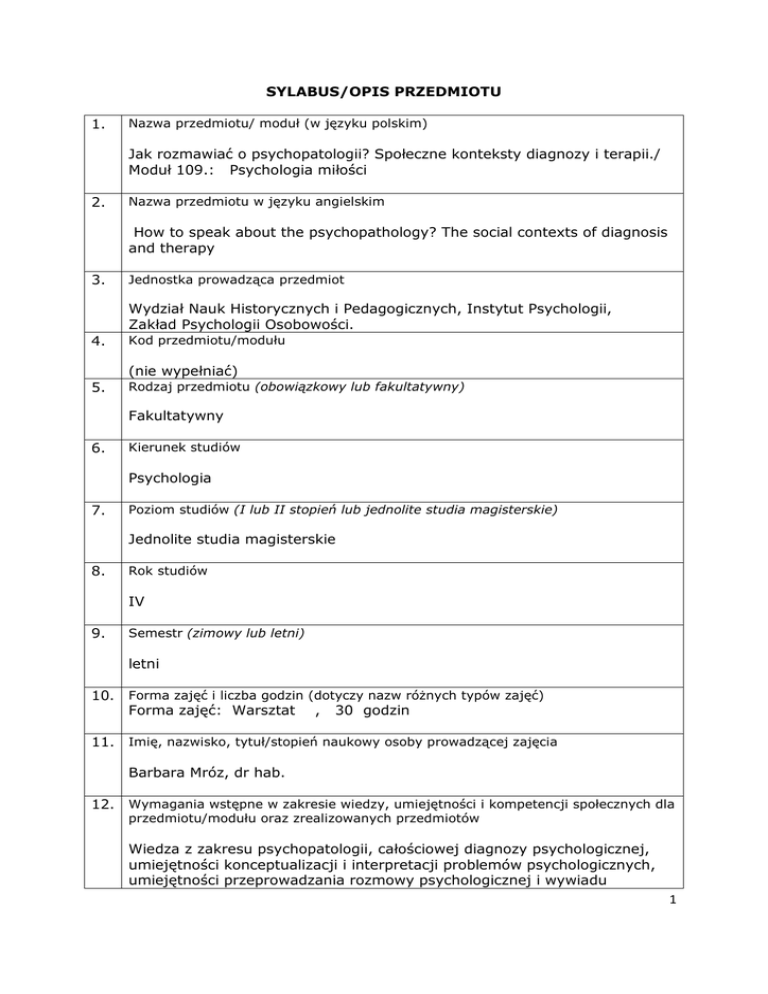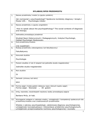 SYLABUS/OPIS PRZEDMIOTU 1. Nazwa przedmiotu/ moduł (w języku polskim) Jak rozmawiać o psychopatologii? Społeczne konteksty diagnozy i terapii./ Moduł 109.: Psychologia miłości 2. Nazwa przedmiotu w języku angielskim How to speak about the psychopathology? The social contexts of diagnosis and therapy 3. Jednostka prowadząca przedmiot Wydział Nauk Historycznych i Pedagogicznych, Instytut Psychologii, Zakład Psychologii Osobowości. 4. Kod przedmiotu/modułu (nie wypełniać) 5. Rodzaj przedmiotu (obowiązkowy lub fakultatywny) Fakultatywny 6. Kierunek studiów Psychologia 7. Poziom studiów (I lub II stopień lub jednolite studia magisterskie) Jednolite studia magisterskie 8. Rok studiów IV 9. Semestr (zimowy lub letni) letni 10. Forma zajęć i liczba godzin (dotyczy nazw różnych typów zajęć) Forma zajęć: Warsztat , 30 godzin 11. Imię, nazwisko, tytuł/stopień naukowy osoby prowadzącej zajęcia Barbara Mróz, dr hab. 12. Wymagania wstępne w zakresie wiedzy, umiejętności i kompetencji społecznych dla przedmiotu/modułu oraz zrealizowanych przedmiotów Wiedza z zakresu psychopatologii, całościowej diagnozy psychologicznej, umiejętności konceptualizacji i interpretacji problemów psychologicznych, umiejętności przeprowadzania rozmowy psychologicznej i wywiadu 1 13. Cele przedmiotu C1 Zapoznanie z podstawowymi podejściami teoretycznymi w psychologii relacji intymnych. C2 Zapoznanie z uwarunkowaniami kulturowymi i środowiskowymi funkcjonowania w relacjach intymnych CP. C3 Dostarczenie wiedzy z zakresu zaburzeń seksualnych (wybrane zagadnienia) C4 Dostarczenie podstawowej wiedzy dotyczącej rozpoznawania i procesu diagnozy zaburzeń seksualnych. C5 Kształtowanie umiejętności związanych z pełnieniem roli psychologa pomagającego ludziom w radzeniu sobie z problemami w relacjach intymnych (kontrakt, nawiązanie kontaktu, rozpoznawanie problemu, rozpoznawanie zasobów, wybór sposobów wsparcia, podstawowa wiedza dotycząca diagnozy i działań terapeutycznych) CP. C6 Pogłębienie wiedzy na temat złożoności procesów zachodzących miedzy ludźmi w relacjach intymnych, rozpoznawanie różnorodnych stanowisk tłumaczących tę złożoność CP. C7 Uświadomienie wpływu własnych postaw i doświadczeń na postępowanie diagnostyczne i pomaganie. Poszerzanie wglądu we własne psychologiczne uwarunkowania. Rozpoznawanie znaczenia kontekstu społecznego i kulturowego w relacji z pacjentem (klientem) CP. C8 Uwrażliwienie na etyczne aspekty pracy z ludźmi dotyczącej ich relacji intymnych CP. 14. Zakładane efekty kształcenia (dla przedmiotu) Symbole kierunkowych efektów kształcenia, np.: K_W01*, K_U05, K_K03 (symbole dla kierunku) EK_W_02 Rozpoznaje uwarunkowania kulturowe funkcjonowania w relacjach społecznych K_W01, K_W02 EK_U_01 Wykorzystuje wiedzę przygotowującą do pracy z ludźmi – ma świadomość konieczności dalszego uczenia się procesów zachodzących w relacji psycholog – pacjent (klient) K_U01, K_U02, K_U04, K_U05 2 EK_U_02 Rozpoznaje złożoność problemów w relacjach społecznych, poszerza wgląd we własne ustosunkowanie do kontrowersyjnych tematów, jest otwarty na rozumienie innych poglądów EK_K_01 Dba o to, by rozpoznawać i dystansować się wobec własnych przekonań i doświadczeń w pracy z ludźmi nad ich problemami w relacjach społecznych EK_K_02 Dostrzega problemy etyczne w pracy psychologa dotyczące pracy z problemami i zaburzeniami w relacjach społecznych K_K01, K_K02, K_K03, K_K05, K_K06 15. Treści programowe 1. Zaburzenia psychiczne w świadomości społecznej. 2. Społeczne spostrzeganie osoby zaburzonej lub chorej psychicznie. 3. Definicje zdrowia psychicznego w oparciu o normy społeczne, społeczna percepcja pomocy psychologicznej i osoby psychologa i terapeuty. 4. Proces przekazywania wyników badań psychologicznych jako wstęp do pracy terapeutycznej 5. Komunikacja między psychologiem z pacjentem, klientem, rodziną. 6. Zapobieganie błędom w komunikacji werbalnej i pozawerbalnej. 7. Przekaz wartościujący i niewartościujący. 8. Zagadnienie manipulacji w terapii, nadużywanie pozycji terapeuty. 9. Skłonności makiaweliczne terapeuty, manipulowanie terapeutą, manipulowanie wiedzą psychologiczną. 10. Problemy wypalenia zawodowego w zawodach społecznych, w tym w pracy psychologa. 11. Społeczny i kulturowy wymiar depresji, nerwicy, psychozy, psychopatii. 12. Problemy etyczne pojawiające się w związku z kontaktem z pacjentem, klientem, rodziną. 13. Znaczenie samorozwoju i kompetencji zawodowych psychologa. 1. 16. Zalecana literatura Obowiązkowa: 1. Bąk O. (2011) Informacje zwrotne przekazywane przez nauczycieli w percepcji uczniów szkół ponadgimnazjalnych. Psychologia Rozwojowa, 16, 2, 67-82. 2. Brodniak W. A. (2000). Choroba psychiczna w świadomości społecznej. Warszawa: Oficyna Naukowa. 3. Kostrubiec B., Mirucka B. (red.) (2004). Rysunek projekcyjny w badaniach obrazu siebie. Lublin: Towarzystwo Naukowe KUL. 4. Mróz B. (2007). Postrzeganie własnej roli zawodowej a obraz siebie. 3 Annales Universitatis Mariae Curie- Skłodowska. Sectio D, Medicina. – Vol. 62, suppl. 18, (5), 152 - 155. 5. Mróz B., Turkiewicz A., Mordarski S. (2010). Wypalenie zawodowe wśród personelu intensywnej opieki medycznej. Polskie Forum Psychologiczne, T 15, (2), 212-226. Uzupełniająca: 1. Brzeziński J. (1984) (red.) – Wybrane zagadnienia z psychometrii i diagnostyki psychologicznej, Poznań: Wydawnictwo UAM. 2. Carson R. C., Butcher J. N., Mineka S. (2003). Psychologia zaburzeń. Człowiek we współczesnym świecie. Gdańsk: GWP. 3. Frank L.K. (1987). Metody projekcyjne w badaniu osobowości w: Szustrowa T. (red), Swobodne techniki diagnostyczne, Warszawa: Wydawnictwa Uniwersytetu Warszawskiego. 4. Hornowska E. (2001). Testy psychologiczne. Teoria i praktyka. Warszawa: Wydawnictwo Naukowe Scholar. 5. Kodeks etyczno-zawodowy psychologa. W: J. Strelau (red.) (2000). Psychologia. Podręcznik Akademi