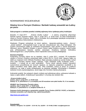 NOWINARSKE WOZJEWJENJE Hóstna hra w Čornym Chołmcu: Serbski ludowy ansambl we Łužicy po puću Gala-program a serbska powěsć slubitej zajimawy kónc tydźenja połny tradicijow Budyšin, 11. meja 2011 „Krasna družka Łužica“ - k tutemu programej přeprošuje Serbski ludowy ansambl sobotu, dnja 4. junija 2011, w 19.00 hodź. na dwór Krabatoweho młyna w Čornym Chołmcu. Balet, chór a orchester SLA předstajeja njezabyte kompozicije z pjeć lětdźesatkow folkloristiskich chłóšćenkow. Klasikarjo: Program wobsahuje na tutym wječoru rejwansko-spěwne sceny „Zwony“, „Jański swěźeń“, „Dolnoserbski kwas“ a reje kaž „Dwuskokowa“ abo „Reja čołmarjow“. We wuskim zhromadnym dźěle ze serbskimi komponistami, mjez druhim z Janom Bulankom, Alfonsom Jancu, Detlefom Kobjelu a Janom Cyžom nasta hudźbny program, kotryž budźe pola přihladowarjow hłuboke zaćišće zawostajić. Kreatiwny tworićel: Dołholětny šefchoreograf SLA, Juraj Kubánka, stwori rejwanske sceny za tute předstajenje. Domizna Krabata Potajnstwo Čorneho młyna ma so njedźelu, dnja 5. junija 2011, rozrisać. Při kuzłarskim młynje w Čornym Chołmcu prezentuja balet a band SLA w 16.00 hodź. rejwanu bajku za dźěći po motiwach knihi Otfrieda Preußlera: Rjek ludoweje powěsće je syrota Krabat, kotryž chce pola Čorneho młynka wučbu nastupić. Tutón wobsedźi wulku kuzłansku knihu – koraktor – z kotrejž da so swět wobknježić. Čorny młynk zakuzła swojich młynskich wučomnikow prawidłownje do čornych rapakow, zo njebychu potajnstwo wuslědźili a da kóžde nowolětne ranje něšto złeho stać. Přez kubołćika, kotryž je jenož za publikum widźomny, so małe a wulke přihladowarjo do jednanja zapřijeja. Zhromadnje z Krabatom dožiwiće mnoho dyrdomdejstwow, doniž njeje móc Čorneho młynka přewinjena. Kulinariski poskitk: Na wobejoch dnjach móžeće sej butřankowe plincy, grilowane kołbaski a mjaso a wjele dalšich „Krabatowych specialitow“ w burskej stwi słodźeć dać. „Krasna družka Łužica“ sobotu, dnja 4. junija 2011, w 19.00 hodź. Zastup 12,- €, potuńšene 8,- €, za skupiny wot 20 wosobow sem płaći kartka 10,- € na wosobu. KRABAT abo Potajnstwo Čorneho młyna njedźelu, dnja 5. junija 2011, w 16.00 hodź. Zastup 8,- €, potuńšene 6,- €, swójbna kartka 25,- €. Zastupne lisćiki dóstanjeće w gmejnskim zarjedźe Čorny Chołmc (035722 / 91257), w Serbskim ludowym ansamblu a při dnjowej resp. wječornej pokładni. http://www.sne-gmbh.com Pressekontakt: Thomas J. Durgeloh, Tel: (0)3591 – 35 81 08, Fax: (0)3591 – 53 19 686, E-Mail: [email protected]