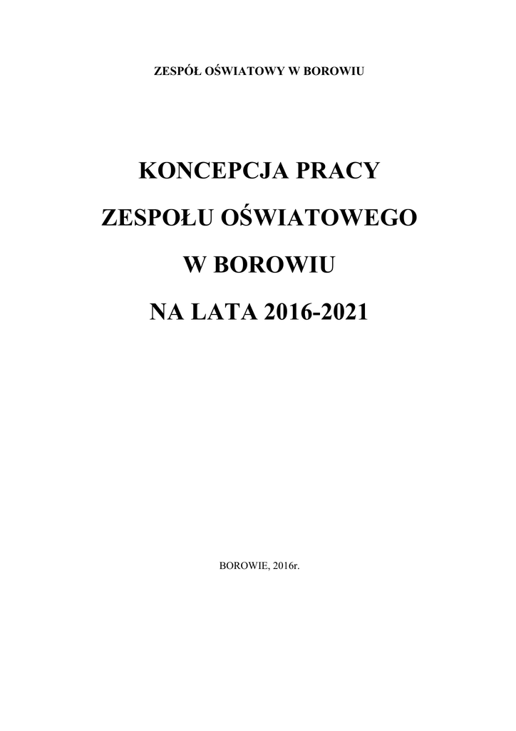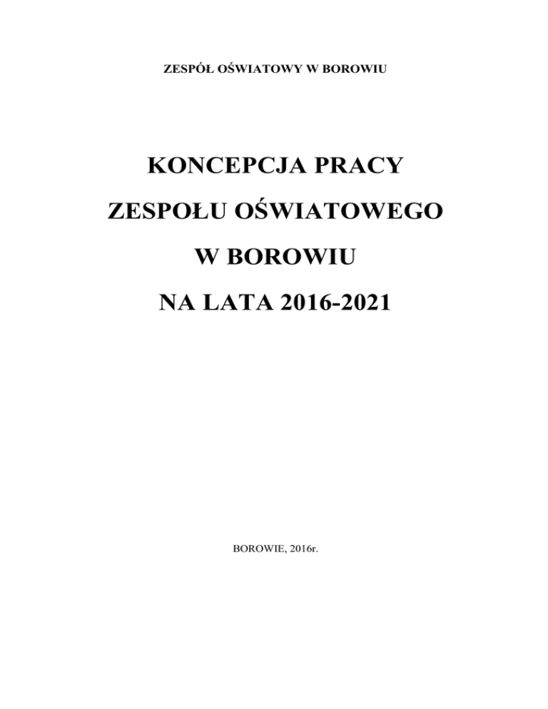 ZESPÓŁ OŚWIATOWY W BOROWIU KONCEPCJA PRACY ZESPOŁU OŚWIATOWEGO W BOROWIU NA LATA 2016-2021 BOROWIE, 2016r. 1. Nadrzędny cel Zespołu Oświatowego: Zapewnienie każdemu uczniowi warunków niezbędnych do jego rozwoju umysłowego, emocjonalnego i fizycznego, przygotowanie do wypełniania obowiązków rodzinnych i obywatelskich w oparciu o zasady solidarności, demokracji, tolerancji, sprawiedliwości i wolności. 2. Cele szczegółowe: • • • • • • • • • • • • • • • • • • • • • • • • • • Stwarzanie warunków do zdobywania wiedzy i umiejętności wystarczających do ukończenia szkoły podstawowej i gimnazjum; Zapewnienie warunków do rozwoju intelektualnego; Umożliwienie uczniom rozwoju talentów i zainteresowań poznawczych, artystycznych oraz sportowych; Przygotowanie do świadomego wyboru dalszego kształcenia; Przygotowanie uczniów do uczestniczenia w życiu kulturalnym; Upowszechnianie wiedzy o prawach dziecka i ucznia; Indywidualizacja procesu nauczania; Zapewnienie pomocy uczniom o obniżonych możliwościach intelektualnych, zaburzeniach emocjonalnych i zdrowotnych; Podnoszenie efektywności nauczania poprzez gromadzenie opinii o szkolnym programie nauczania; Wykorzystanie technik multimedialnych w procesie dydaktycznym; Tworzenie bezpiecznego środowiska szkolnego; Kształtowanie właściwych postaw kulturowych, etycznych i moralnych; Kształtowanie właściwych postaw wobec zdrowia fizycznego i psychicznego; Zapewnienie uczniom pełnego bezpieczeństwa w czasie zajęć; Organizowanie opieki nad uczniami rozpoczynającymi naukę w Zespole oraz uczniami niepełnosprawnymi; Kształtowanie umiejętności rozpoznawania wartości moralnych; Profilaktyka i zapobieganie współczesnym patologiom; Organizowanie pomocy psychologiczno- pedagogicznej i materialnej rodzinom niewydolnym wychowawczo lub znajdującym się w trudnej sytuacji materialnej; Wnioskowanie o przyznawanie stypendiów dla uczniów wybitnie 0zdolnych; Integrowanie zespołów klasowych poprzez samorządność uczniowską; Wyrabianie nawyków współdziałania i współtworzenia w grupie; Integrowanie procesu wychowawczego w relacjach szkoła-dom; Integracja środowiska nauczycieli i uczniów; Edukacja rodziców w związku z problemami współczesnej młodzieży; Wzbogacanie bazy dydaktycznej szkoły; Kształtowanie pozytywnego wizerunku szkoły w środowisku; Miarą naszego szkolnego sukcesu wychowawczego i dydaktycznego będą uczniowie, którzy po latach jako dorośli ludzie będą mogli stanowczo stwierdzić, że wszechstronnie rozwinęli swoją osobowość dzięki dobremu fundamentowi edukacji, który stworzył Zespół Oświatowy w Borowiu –Publiczne Przedszkole w Borowiu, Publiczna Szkoła Podstawowa im. 2 Aleksandra Sasimowskiego i Publiczne Gimnazjum im. Aleksandra Sasimowskiego w Borowiu. 3. SYLWETKA ABSOLWENTA Absolwent gimnazjum: 1. Jest przygotowany do dalszej edukacji: • planuje, analizuje i ocenia efekty własnego procesu uczenia się • potrafi sprawnie i krytycznie czytać teksty źródłowe • sprawnie wypowiada się dostosowując język do intencji wypowiedzi • potrafi redagować różnorodne formy wypowiedzi pisemnych • umie powiązać dzieje państwa polskiego zarówno z historią powszechną, jak i historią lokalnej „małej ojczyzny” • wyjaśnia przyczyny zróżnicowania warunków życia oraz działalności człowieka w środowisku geograficznym • rozumie mechanizmy anatomiczne, fizjologiczne i ekologiczne rządzące życiem organizmów • rozumie zjawiska i prawa fizyczne w przyrodzie i technice • rozumie zjawiska zachodzące w przyrodzie w wyniku procesów chemicznych • ma rozwiniętą sprawność rachunkową i umiejętność matematyzowania problemów praktycznych, dotyczących sytuacji z życia • ma rozwiniętą wrażliwość muzyczną i plastyczną 2. Umie zdobywać informacje z różnych źródeł: • korzysta ze zbiorów bibliotecznych • wykorzystuje prasę i inne media • korzysta z Internetu 3. Zna przynajmniej jeden język obcy na poziomie komunikacji podstawowej 3 4. Umie korzystać z komputera 5. Dba o własne bezpieczeństwo, zdrowie i środowisko 6. Jest kreatywny i twórczy • potrafi wykorzystać swoją wiedzę i umiejętności w nowych sytuacjach poznawczych 7. Umie pracować samodzielnie i w zespole 8. Jest wrażliwy i tolerancyjny • przestrzega przyjętych przez środowisko norm moralnych i etycznych 9. Jest asertywny 10. Umie podejmować decyzje i ponosić za nie odpowiedzialność 11. Charakteryzuje się pozytywną postawą wobec swojego ciała i zdrowia • zna zagrożenia wynikające z niedostatku ruchu i umie temu zaradzić • zna zagrożenia związane z uzależnieniami i potrafi im zaradzić 12. Umie budować swój wizerunek : • potrafi się zaprezentować i wskazać swoje mocne strony • zna życie i twórczość patrona szkoły-Aleksandra Sasimowskiego Absolwent szkoły podstawowej: 1. Jest komunikatywny ( łatwość i zwięzłość formułowania myśli także na piśmie). 2. Posiada umiejętność współpracy w grupie. 3. Jest otwarty na nowe doświadczenia. 4. Jest tolerancyjny i obiektywny. 5. Jest wrażliwy (sztuka, piękno otaczającego świata, dobro, zło). 6. Jest pomysłowy i twórczy. 7. Opanował jeden język obcy w sposób komunikatywny. 8. Jest samodzielny. 9. Umiejętnie wykorzystuje wiedzę w życiu. 10. Przestrzega zasad kultury osobistej. 11. Umie swobodnie poruszać się we współczesnym świecie. 4 12. Jest odpowiedzialny, samodzielny, twórczy. 13. Ma poczucie własnej godności i wartości. 14. Rozumie innych, potrafi z nimi współpracować. 15. Ma odpowiedni zasób wiedzy umożliwiający kontynuowanie nauki. 16. Zna życie i twórczość patrona szkoły - Aleksandra Sasimowskiego. 17. Szanuje wielowiekowe dziedzictwo kulturowe. 18. Zna zasady zdrowego stylu życia, dba o swoje zdrowie i bezpieczeństwo, jest przyjazny środowisku. Absolwent przedszkola 1. D
