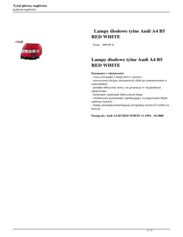 Tytuł główny nagłówka podtytuł nagłówka Lampy diodowe tylne Audi A4 B5 RED WHITE Cena: 469.99 zł Lampy diodowe tylne Audi A4 B5 RED WHITE Parametry i właściwości: - cena za komplet 2 lamp (lewa + prawa) - nowoczesny design, niesamowity efekt po zamontowaniu w samochodzie - produkt fabrycznie nowy, na gwarancji w oryginalnym opakowaniu - doskonały zamiennik fabrycznych lamp - wbudowane przekaźniki zapobiegające występowaniu błędu spalonej żarówki - lampy posiadają homologację europejską (norma E wybita na kloszu) Pasują do: Audi A4 B5 RED WHITE 11.1994 - 10.2000 1/1 Powered by TCPDF (www.tcpdf.org)