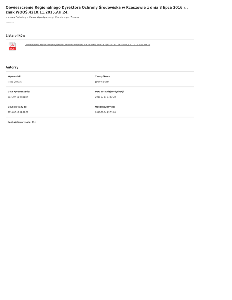 Obwieszczenie Regionalnego Dyrektora Ochrony Środowiska w Rzeszowie z dnia 8 lipca 2016 r., znak WOOŚ.4210.11.2015.AH.24, w sprawie Scalenie gruntów wsi Wyszatyce, obręb Wyszatyce, gm. Żurawica 2016-07-13 Lista plików Obwieszczenie Regionalnego Dyrektora Ochrony Środowiska w Rzeszowie z dnia 8 lipca 2016 r., znak WOOŚ.4210.11.2015.AH.24 Autorzy Wprowadził: Zmodyfikował: Jakub Gerczak Jakub Gerczak Data wprowadzenia: Data ostatniej modyfikacji: 2016-07-11 07:01:24 2016-07-11 07:02:28 Opublikowany od: Opublikowany do: 2016-07-13 01:02:00 2016-08-04 23:59:00 Ilość odsłon artykułu: 114