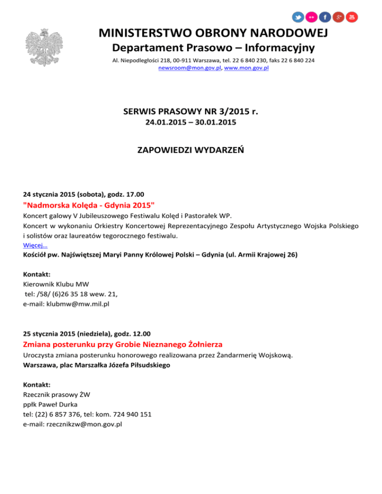 MINISTERSTWO OBRONY NARODOWEJ Departament Prasowo – Informacyjny Al. Niepodległości 218, 00-911 Warszawa, tel. 22 6 840 230, faks 22 6 840 224 [email protected], www.mon.gov.pl SERWIS PRASOWY NR 3/2015 r. 24.01.2015 – 30.01.2015 ZAPOWIEDZI WYDARZEŃ 24 stycznia 2015 (sobota), godz. 17.00 "Nadmorska Kolęda - Gdynia 2015" Koncert galowy V Jubileuszowego Festiwalu Kolęd i Pastorałek WP. Koncert w wykonaniu Orkiestry Koncertowej Reprezentacyjnego Zespołu Artystycznego Wojska Polskiego i solistów oraz laureatów tegorocznego festiwalu. Więcej… Kościół pw. Najświętszej Maryi Panny Królowej Polski – Gdynia (ul. Armii Krajowej 26) Kontakt: Kierownik Klubu MW tel: /58/ (6)26 35 18 wew. 21, e-mail: [email protected] 25 stycznia 2015 (niedziela), godz. 12.00 Zmiana posterunku przy Grobie Nieznanego Żołnierza Uroczysta zmiana posterunku honorowego realizowana przez Żandarmerię Wojskową. Warszawa, plac Marszałka Józefa Piłsudskiego Kontakt: Rzecznik prasowy ŻW ppłk Paweł Durka tel: (22) 6 857 376, tel: kom. 724 940 151 e-mail: [email protected] 26-30 stycznia 2015 (poniedziałek-piątek) Skruszą lody Szkolenie z niszczenia zatorów lodowych na rzekach z wykorzystaniem śmigłowców. Inowrocław Kontakt: Oficer prasowy 2pinż kpt. Sylwester Ludwiczak tel. 885 210 262 e-mail: [email protected] Do 30 stycznia 2015 ( do piątku) Konkurs na najlepszą pracę naukową Po raz trzeci wiceprezes Rady Ministrów, minister obrony narodowej ogłasza Konkurs na najlepszą pracę naukową i wdrożenie z obszaru obronności. Konkurs odbywa się pod Honorowym Patronatem Prezydenta Rzeczypospolitej Polskiej Bronisława Komorowskiego. Więcej… Warszawa Kontakt: Departament Prasowo-Informacyjny MON tel. (22) 6 840 230 e-mail: [email protected] KRONIKA 16 stycznia 2015 (piątek) Modernizacja armii i bezpieczeństwo państwa „Pieniądze na modernizację armii muszą służyć obronności, ale także rozwojowi gospodarczemu kraju. Chcemy, by modernizacja sprzyjała pobudzaniu koniunktury w całej gospodarce, tworzeniu nowych miejsc pracy oraz realizacji prac badawczo-rozwojowych” – powiedział podsekretarz stanu Maciej Jankowski do uczestników XL Sympozjum „Współczesna Gospodarka i Administracja Publiczna”. Więcej… 19 stycznia 2015 (poniedziałek) Pół tysiąca mieszkań dla żołnierzy Wojskowa Agencja Mieszkaniowa przekaże w tym roku żołnierzom ponad pół tysiąca służbowych mieszkań. Na lokum mogą liczyć na przykład ci, którzy służą w Warszawie, Sulechowie, Żaganiu i Kołobrzegu. W kolejce po wojskowe „M” czeka w sumie ponad 2,2 tysiąca wojskowych. Więcej… 19 stycznia 2015 (poniedziałek) Wiceminister Robert Kupiecki w Kijowie Podsekretarz stanu w MON Robert Kupiecki przebywał w poniedziałek z wizytą w Kijowie w składzie delegacji prezes Rady Ministrów Ewy Kopacz. Więcej… 21 stycznia 2015 (środa) Nominacje do Komitetu Sterującego NCBiR Pułkownik Robert Kurowski, zastępca dyrektora Departamentu Nauki i Szkolnictwa Wojskowego, został po raz drugi przedstawicielem Ministerstwa Obrony Narodowej w Komitecie Sterującym Narodowego Centrum Badań i Rozwoju do spraw badań naukowych i prac rozwojowych w obszarze bezpieczeństwa i obronności państwa. Więcej… 22 stycznia 2015 (czwartek) Rewolucyjne pomysły na współpracę Podporządkowanie polskiego batalionu niemieckiej brygadzie, a niemieckiego batalionu polskiej brygadzie, wspólne ćwiczenia oraz wymiana oficerów sztabowych – o takich projektach współpracy rozmawiali inspektorzy Wojsk Lądowych Polski i Niemiec. Więcej… 22 stycznia 2015 (czwartek) Logistycy Grupy Bojowej na poligonie Żołnierze kompanii logistycznej Grupy Bojowej Unii Europejskiej V4 szkolili się na poligonie w Winowie. Więcej…