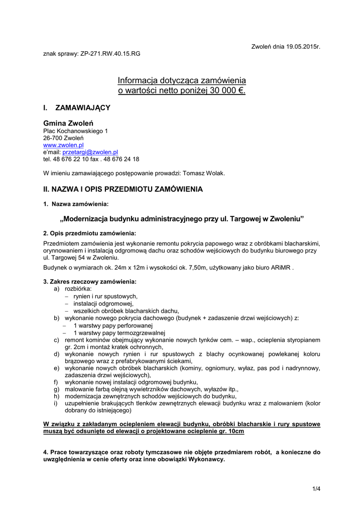 Zwoleń dnia 19.05.2015r. znak sprawy: ZP-271.RW.40.15.RG Informacja dotycząca zamówienia o wartości netto poniżej 30 000 €. I. ZAMAWIAJĄCY Gmina Zwoleń Plac Kochanowskiego 1 26-700 Zwoleń www.zwolen.pl e’mail: [email protected] tel. 48 676 22 10 fax . 48 676 24 18 W imieniu zamawiającego postępowanie prowadzi: Tomasz Wolak. II. NAZWA I OPIS PRZEDMIOTU ZAMÓWIENIA 1. Nazwa zamówienia: „Modernizacja budynku administracyjnego przy ul. Targowej w Zwoleniu” 2. Opis przedmiotu zamówienia: Przedmiotem zamówienia jest wykonanie remontu pokrycia papowego wraz z obróbkami blacharskimi, orynnowaniem i instalacją odgromową dachu oraz schodów wejściowych do budynku biurowego przy ul. Targowej 54 w Zwoleniu. Budynek o wymiarach ok. 24m x 12m i wysokości ok. 7,50m, użytkowany jako biuro ARiMR . 3. Zakres rzeczowy zamówienia: a) rozbiórka: rynien i rur spustowych, instalacji odgromowej, wszelkich obróbek blacharskich dachu, b) wykonanie nowego pokrycia dachowego (budynek + zadaszenie drzwi wejściowych) z: 1 warstwy papy perforowanej 1 warstwy papy termozgrzewalnej c) remont kominów obejmujący wykonanie nowych tynków cem. – wap., ocieplenia styropianem gr. 2cm i montaż kratek ochronnych, d) wykonanie nowych rynien i rur spustowych z blachy ocynkowanej powlekanej koloru brązowego wraz z prefabrykowanymi ściekami, e) wykonanie nowych obróbek blacharskich (kominy, ogniomury, wyłaz, pas pod i nadrynnowy, zadaszenia drzwi wejściowych), f) wykonanie nowej instalacji odgromowej budynku, g) malowanie farbą olejną wywietrzników dachowych, wyłazów itp., h) modernizacja zewnętrznych schodów wejściowych do budynku, i) uzupełnienie brakujących tlenków zewnętrznych elewacji budynku wraz z malowaniem (kolor dobrany do istniejącego) W związku z zakładanym ociepleniem elewacji budynku, obróbki blacharskie i rury spustowe muszą być odsunięte od elewacji o projektowane ocieplenie gr. 10cm 4. Prace towarzyszące oraz roboty tymczasowe nie objęte przedmiarem robót, a konieczne do uwzględnienia w cenie oferty oraz inne obowiązki Wykonawcy. 1/4 zapewnienie osoby pełniącej funkcję kierownika budowy na zasadach określonych w ustawie Prawo budowlane i posiadającą odpowiednie kwalifikacje zawodowe, organizacja i zabezpieczenie placu budowy, udział uprawnionego przedstawiciela Wykonawcy i kierownika budowy na każde żądanie Zamawiającego w naradach techniczno - koordynacyjnych na budowie udział uprawnionego przedstawiciela Wykonawcy wraz z kierownikiem budowy w przeglądach gwarancyjnych na każde żądanie Zamawiającego, zapewnienie utylizacji materiałów pochodzących z rozbiórki, zgodnie z odrębnymi przepisami, ponoszenie pełnej odpowiedzialności za materiały, sprzęt i urządzenia na terenie prac budowlanych, doprowadzenie nieruchomości do należytego stanu i porządku po wykonaniu robót budowlanych, przygotowanie dokumentacji do odbioru końcowego – m.in. wykonania badań instalacji odgromowej, zgromadzenie dokumentów potwierdzających dopuszczenie zastosowanych materiałów i wyrobów do obrotu i stosowania w budownictwie, oświadczenie kierownika budowy o jej zakończeniu itp., roboty tymczasowe oraz wszelkie inne prace nie ujęte w przedmiarze a konieczne do wykonania ze względu na sztukę budowlaną, zasady wiedzy technicznej i obowiązujące przepisy prawa, 5. Przed złożeniem oferty Wykonawca powinien dokonać wizji lokalnej terenu budowy i przedmiotowego budynku celem dokładnego rozpoznania, co do ryzyka, trudności i wszelkich innych okoliczności (w tym uwzględnienia prac nie ujętych w przedmiarach i niniejszym opisie), które należy wykonać a mogą wpłynąć na cenę oferty i termin wykonanie zamówienia. 6. Wykonawca zapewnia wszelkie materiały niezbędne do realizacji zamówienia, które winny być fabrycznie nowe i dopuszczone do obrotu i stosowania w budownictwie na podstawie odrębnych przepisów. 7. Wykonawca udzieli rękojmi i gwarancji na wykonany przedmiot zamówienia na okres 3 lat licząc od daty protokolarnego, bezusterkowego odbioru końcowego zadania przez Zamawiającego. III. TERMIN WYKONANIA ZAMÓWIENIA Termin wykonania przedmiotu zamówienia: 6 tygodni od dnia udzielenia zamówienia. IV. OPIS SPOSOBU PRZYGOTOWANIA OFERTY 1. Oferent powinien opracować ofertę na formularzu załączonym do niniejszego zapytania, która powinna: posiadać nazwę i dokładny adres Wykonawcy wraz z niezbędnymi danymi teleadresowymi oraz datę sporządzenia, być podpisana czytelnie przez wykonawcę - osobę / osoby upoważnioną do reprezentowania wykonawcy, posiadać załączone wszystkie wymagane przez Zamawiającego dokumenty, 2. Cena ofertowa brutto (wraz z podatkiem VAT) winna być obliczona na podstawie opisu przedmiotu zamówienia umieszczonego w pkt. II niniejszej „informacji …” i załączonych przedmiarów robót oraz zakresu robót nie ujętych w w/w dokumentacji a wynikających z własnej kalkulacji przeprowadzonej w oparciu o wizję lokalną terenu robót budowlanych i budynku, koniecznych do wykonania ze względu na sztukę budowlaną, zasady wiedzy technicznej i obowiązujące przepisy prawa oraz uwzględnić wszelkie inne koszty, jakie wykonawca zobowiązany będzie ponieść w związku z realizacją zamówienia i przygotowaniem oferty. UWAGA: Załączony przedmiar robót jest jedynie materiałem pomocniczym do dokonania wyceny przedmiotu zamówienia. 2/4 3. Kosztorys ofertowy (uwzględniający również pozycje z własnej kalkulacji robót które nie zostały ujęte w przedmiarze robót i niniejszej „informacji”) należy wypełnić z dokładnością do dwóch miejsc po przecinku. Wykonawca ponosi odpowiedzialność za właściwe określenie stawki podatku VAT zgodnie z obowiązującymi przepisami. 4. Cena oferty brutto (wraz z podatkiem VAT) jest ceną ryczałtową zamówienia. V. MIEJSCE ORAZ TERMIN SKŁADANIA OFERT 1. Ofertę należy złożyć do dnia 05.06.2015 roku do godz. 10.00. Adres: Urząd