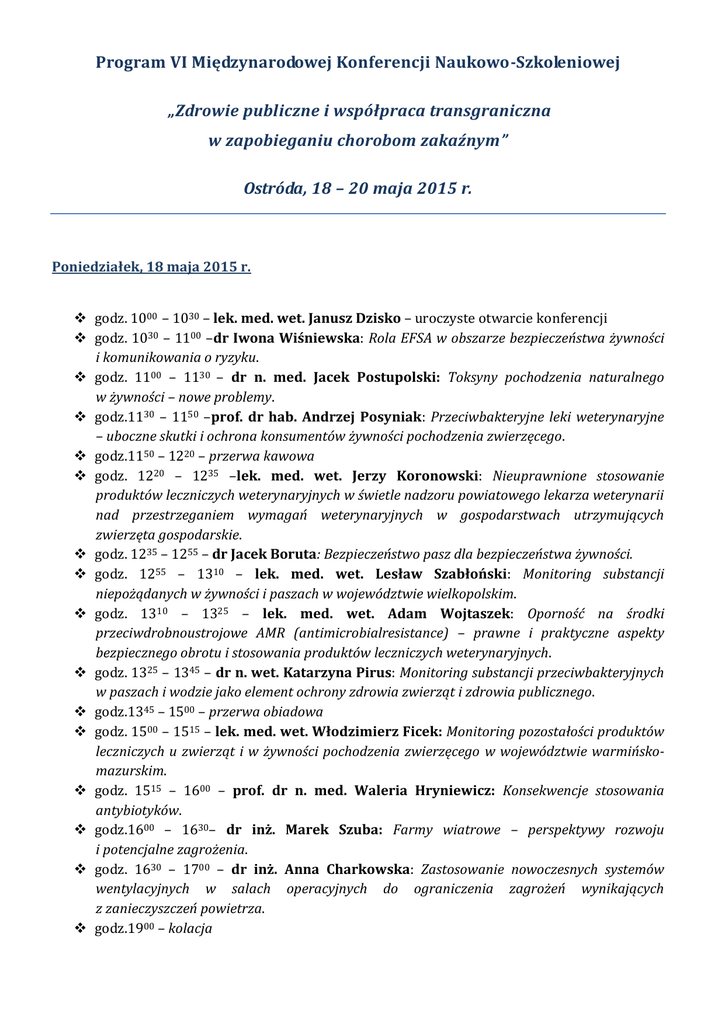 Program VI Międzynarodowej Konferencji Naukowo-Szkoleniowej „Zdrowie publiczne i współpraca transgraniczna w zapobieganiu chorobom zakaźnym” Ostróda, 18 – 20 maja 2015 r. Poniedziałek, 18 maja 2015 r. godz. 1000 – 1030 – lek. med. wet. Janusz Dzisko – uroczyste otwarcie konferencji godz. 1030 – 1100 –dr Iwona Wiśniewska: Rola EFSA w obszarze bezpieczeństwa żywności i komunikowania o ryzyku. godz. 1100 – 1130 – dr n. med. Jacek Postupolski: Toksyny pochodzenia naturalnego w żywności – nowe problemy. godz.1130 – 1150 –prof. dr hab. Andrzej Posyniak: Przeciwbakteryjne leki weterynaryjne – uboczne skutki i ochrona konsumentów żywności pochodzenia zwierzęcego. godz.1150 – 1220 – przerwa kawowa godz. 1220 – 1235 –lek. med. wet. Jerzy Koronowski: Nieuprawnione stosowanie produktów leczniczych weterynaryjnych w świetle nadzoru powiatowego lekarza weterynarii nad przestrzeganiem wymagań weterynaryjnych w gospodarstwach utrzymujących zwierzęta gospodarskie. godz. 1235 – 1255 – dr Jacek Boruta: Bezpieczeństwo pasz dla bezpieczeństwa żywności. godz. 1255 – 1310 – lek. med. wet. Lesław Szabłoński: Monitoring substancji niepożądanych w żywności i paszach w województwie wielkopolskim. godz. 1310 – 1325 – lek. med. wet. Adam Wojtaszek: Oporność na środki przeciwdrobnoustrojowe AMR (antimicrobialresistance) – prawne i praktyczne aspekty bezpiecznego obrotu i stosowania produktów leczniczych weterynaryjnych. godz. 1325 – 1345 – dr n. wet. Katarzyna Pirus: Monitoring substancji przeciwbakteryjnych w paszach i wodzie jako element ochrony zdrowia zwierząt i zdrowia publicznego. godz.1345 – 1500 – przerwa obiadowa godz. 1500 – 1515 – lek. med. wet. Włodzimierz Ficek: Monitoring pozostałości produktów leczniczych u zwierząt i w żywności pochodzenia zwierzęcego w województwie warmińskomazurskim. godz. 1515 – 1600 – prof. dr n. med. Waleria Hryniewicz: Konsekwencje stosowania antybiotyków. godz.1600 – 1630– dr inż. Marek Szuba: Farmy wiatrowe – perspektywy rozwoju i potencjalne zagrożenia. godz. 1630 – 1700 – dr inż. Anna Charkowska: Zastosowanie nowoczesnych systemów wentylacyjnych w salach operacyjnych do ograniczenia zagrożeń wynikających z zanieczyszczeń powietrza. godz.1900 – kolacja Wtorek, 19 maja 2015 r. godz. 800 – śniadanie godz. 930 – 1000 –prof. dr hab. Józef Knap: Polio – powrót do Europy. godz.1000 – 1030 –dr Wacław Nahorski: Malaria nadal jedną z najważniejszych choróbna świecie. godz.1030 – 1100 – lek. med. Andrzej Zakrzewski: Realizacja pakietu onkologicznego w Polsce– doświadczenia pierwszych miesięcy. godz.1100 – 1200– prof. dr hab. Cezary Szczylik: Najczęściej występujące choroby nowotworowe: jelito grube, płuca, jajniki, nerki, prostata. godz.1200 – 1230 – przerwa kawowa godz. 1230 – 1430 – prof. dr hab. Cezary Szczylik– cd. Wykładu. godz.1430 – 1530 – przerwa obiadowa godz.1530 – 1630– prof. dr hab. Edward Towpik, dr n. med. Sławomir Mazur: Rozpoznanie i leczenie raka piersi. godz.1630 – 1700 – przerwa kawowa godz.1700 – 1730 – prof. dr n. farm. Maria H. Borawska: Wpływ produktów pszczelarskich na rozwój glejaków mózgu i ich interakcje z temozolomidem . godz.1730 – 1800– dr hab. Katarzyna Socha: Żywność a działanie przeciwnowotworowe. godz. 2000 – kolacja Środa, 20 maja 2015 r. godz. 800 – śniadanie 30 00 godz.9 – 10 –prof. dr hab. Sławomir Pancewicz: „Koinfekcje patogenów przenoszonych przez kleszcze. godz. 1000 – 1030 – dr n. med. Iwona Paradowska-Stankiewicz: Czy istnieje zagrożenie epidemiologiczne z powodu zwiększonej zachorowalności na odrę? godz.1030 – 1100 – dr n. med. Helena Šebáková : Nowe i znowu pojawiające się infekcje w województwie Morawskośląskim – aktualności. godz.1100 – 1130 – dr n. med. Irena Martinková: Legionelozy : stary – nowy problem. Kazuistyka. godz. 1130 – 1200 – mgr Marcin Milkowski: Jak oszukują środki psychoaktywne, czyli czego szukamy a co znajdujemy. godz.1200 – 1230 – podins. Anna Fic: Środki psychoaktywne a przestępczość. godz. 1230 - obiad