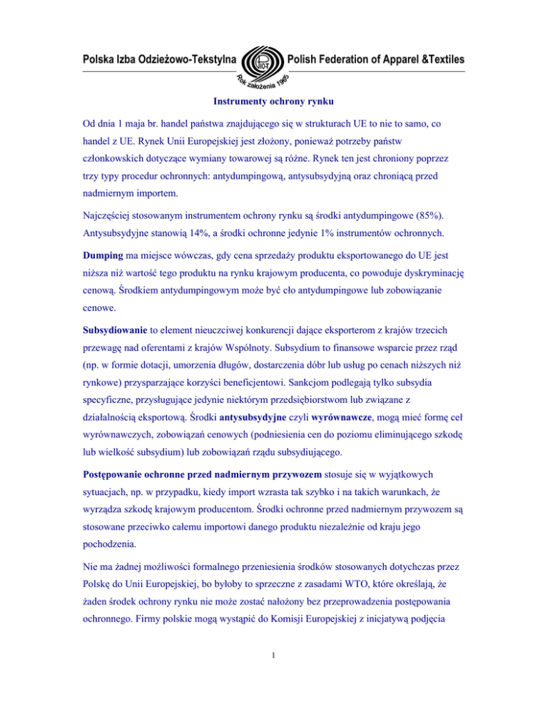 Polska Izba Odzieżowo-Tekstylna Polish Federation of Apparel &Textiles Instrumenty ochrony rynku Od dnia 1 maja br. handel państwa znajdującego się w strukturach UE to nie to samo, co handel z UE. Rynek Unii Europejskiej jest złożony, ponieważ potrzeby państw członkowskich dotyczące wymiany towarowej są różne. Rynek ten jest chroniony poprzez trzy typy procedur ochronnych: antydumpingową, antysubsydyjną oraz chroniącą przed nadmiernym importem. Najczęściej stosowanym instrumentem ochrony rynku są środki antydumpingowe (85%). Antysubsydyjne stanowią 14%, a środki ochronne jedynie 1% instrumentów ochronnych. Dumping ma miejsce wówczas, gdy cena sprzedaży produktu eksportowanego do UE jest niższa niż wartość tego produktu na rynku krajowym producenta, co powoduje dyskryminację cenową. Środkiem antydumpingowym może być cło antydumpingowe lub zobowiązanie cenowe. Subsydiowanie to element nieuczciwej konkurencji dające eksporterom z krajów trzecich przewagę nad oferentami z krajów Wspólnoty. Subsydium to finansowe wsparcie przez rząd (np. w formie dotacji, umorzenia długów, dostarczenia dóbr lub usług po cenach niższych niż rynkowe) przysparzające korzyści beneficjentowi. Sankcjom podlegają tylko subsydia specyficzne, przysługujące jedynie niektórym przedsiębiorstwom lub związane z działalnością eksportową. Środki antysubsydyjne czyli wyrównawcze, mogą mieć formę ceł wyrównawczych, zobowiązań cenowych (podniesienia cen do poziomu eliminującego szkodę lub wielkość subsydium) lub zobowiązań rządu subsydiującego. Postępowanie ochronne przed nadmiernym przywozem stosuje się w wyjątkowych sytuacjach, np. w przypadku, kiedy import wzrasta tak szybko i na takich warunkach, że wyrządza szkodę krajowym producentom. Środki ochronne przed nadmiernym przywozem są stosowane przeciwko całemu importowi danego produktu niezależnie od kraju jego pochodzenia. Nie ma żadnej możliwości formalnego przeniesienia środków stosowanych dotychczas przez Polskę do Unii Europejskiej, bo byłoby to sprzeczne z zasadami WTO, które określają, że żaden środek ochrony rynku nie może zostać nałożony bez przeprowadzenia postępowania ochronnego. Firmy polskie mogą wystąpić do Komisji Europejskiej z inicjatywą podjęcia 1 Polska Izba Odzieżowo-Tekstylna Polish Federation of Apparel &Textiles postępowania ochronnego na dany towar, ale do poparcia takiego wniosku nie wystarczy poparcie odpowiedniej gałęzi przemysłu polskiego. Dla takiego wniosku trzeba zapewnić poparcie przemysłu UE. W przypadku procedury antydumpingowej / antysubsydyjnej wniosek trzeba złożyć bezpośrednio do Komisji Europejskiej i musi on być złożony w imieniu dostarczających 25% całkowitej produkcji danego towaru w całej UE. W przypadku procedury ochronnej przed nadmiernym przywozem wniosek składa się wprawdzie tylko w imieniu przemysłu polskiego do polskiej administracji, jednak do wszczęcia postępowania potrzeba zgody pozostałych krajów członkowskich. W Polsce z pewnością znajdą się również firmy, dla których dodatkowa ochrona rynku będzie miała negatywne skutki. Mogą one zainicjować postępowanie weryfikacyjne w celu uchylenia zmiany stosowanego środka ochronnego. Bezpośrednim źródłem informacji na temat obecnie stosowanych przez UE środków ochronnych jest unijna taryfa celna TARIC, ale dodatkowe informacje można również zaleźć na stronach internetowych: http://clo.mg.gov.pl, http://europa.eu.int/comm/trade/policy/index_en.htm OPRACOWAŁA: ANNA RAULlN POLSKA IZBA ODZIEŻOWO-TEKSTYLNA Na podstawie prezentacji Wojciecha Sudola pt. "Ogólna charakterystyka instrumentów ochrony rynku" oraz Informatora MGiP pt. "Zmiany w systemie instrumentów ochrony rynku w związku z akcesją Palski do Unii Europejskiej". Projekt Perfect Link jest realizowany przy wsparciu finansowym Unii Europejskiej. Opinie wygłaszane w materiałach są opiniami Polskiej Izby Odzieżowo-Tekstylnej i nie odzwierciedlają oficjalnego stanowiska Komisji Europejskiej na prezentowane tematy. 2