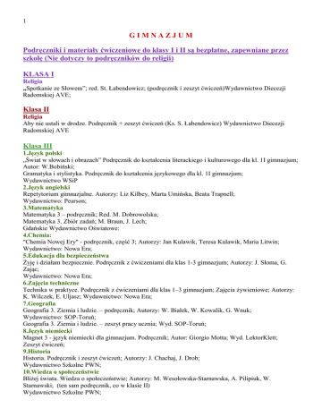 1 GIMNAZJUM Podręczniki i materiały ćwiczeniowe do klasy I i II są bezpłatne, zapewniane przez szkołę (Nie dotyczy to podręczników do religii) KLASA I Religia „Spotkanie ze Słowem”; red. St. Łabendowicz; (podręcznik i zeszyt ćwiczeń)Wydawnictwo Diecezji Radomskiej AVE; Klasa II Religia Aby nie ustali w drodze. Podręcznik + zeszyt ćwiczeń (Ks. S. Łabendowicz) Wydawnictwo Diecezji Radomskiej AVE Klasa III 1.Język polski „Świat w słowach i obrazach” Podręcznik do kształcenia literackiego i kulturowego dla kl. 1I gimnazjum; Autor: W.Bobiński; Gramatyka i stylistyka. Podręcznik do kształcenia językowego dla kl. 1I gimnazjum; Wydawnictwo WSiP 2.Język angielski Repetytorium gimnazjalne. Autorzy: Liz Kilbey, Marta Umińska, Beata Trapnell; Wydawnictwo: Pearson; 3.Matematyka Matematyka 3 – podręcznik; Red. M. Dobrowolska; Matematyka 3. Zbiór zadań; M. Braun, J. Lech; Gdańskie Wydawnictwo Oświatowe: 4.Chemia: "Chemia Nowej Ery" - podręcznik, część 3; Autorzy: Jan Kulawik, Teresa Kulawik, Maria Litwin; Wydawnictwo: Nowa Era; 5.Edukacja dla bezpieczeństwa Żyję i działam bezpiecznie. Podręcznik z ćwiczeniami dla klas 1-3 gimnazjum; Autorzy: J. Słoma, G. Zając; Wydawnictwo: Nowa Era; 6.Zajęcia techniczne Technika w praktyce. Podręcznik z ćwiczeniami dla klas 1–3 gimnazjum; Zajęcia żywieniowe; Autorzy: K. Wilczek, E. Uljasz; Wydawnictwo: Nowa Era; 7.Geografia Geografia 3. Ziemia i ludzie. – podręcznik; Autorzy: W. Białek, W. Kowalik, G. Wnuk; Wydawnictwo: SOP-Toruń; Geografia 3. Ziemia i ludzie. – zeszyt pracy ucznia; Wyd. SOP-Toruń; 8.Język niemiecki Magnet 3 - język niemiecki dla gimnazjum. Podręcznik; Autor: Giorgio Motta; Wyd. LektorKlett; Zeszyt ćwiczeń; 9.Historia Historia. Podręcznik i zeszyt ćwiczeń; Autorzy: J. Chachaj, J. Drob; Wydawnictwo Szkolne PWN; 10.Wiedza o społeczeństwie Bliżej świata. Wiedza o społeczeństwie; Autorzy: M. Wesołowska-Starnawska, A. Pilipiuk, W. Starnawski; (ten sam podręcznik, co w klasie II) Wydawnictwo Szkolne PWN; 2 11.Fizyka Świat fizyki cz. III; Autor: B. Saganowska; Wydawnictwo: ZamKor; 12.Biologia Biologia 3 – podręcznik; Autorzy: J. Loritz-Dobrowolska, Z. Sendecka; Wyd. Operon; Zeszyt ćwiczeń 3; Wydawnictwo: Operon; 13.Religia Żyć w miłości Boga; red. S.Łabendowicz, Wydawnictwo Diecezji Radomskiej AVE; 14.Zajęcia artystyczne Świat muzyki; Autor: W.Panek; Wydawnictwo: WSiP – podręcznik z kl. II;