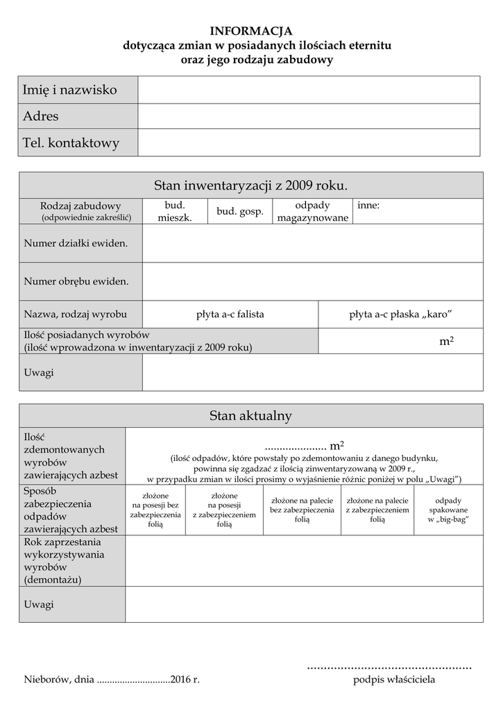 INFORMACJA dotycząca zmian w posiadanych ilościach eternitu oraz jego rodzaju zabudowy Imię i nazwisko Adres Tel. kontaktowy Stan inwentaryzacji z 2009 roku. Rodzaj zabudowy (odpowiednie zakreślić) bud. mieszk. bud. gosp. odpady inne: magazynowane Numer działki ewiden. Numer obrębu ewiden. Nazwa, rodzaj wyrobu płyta a-c falista płyta a-c płaska „karo” Ilość posiadanych wyrobów (ilość wprowadzona w inwentaryzacji z 2009 roku) m2 Uwagi Stan aktualny Ilość zdemontowanych wyrobów zawierających azbest Sposób zabezpieczenia odpadów zawierających azbest Rok zaprzestania wykorzystywania wyrobów (demontażu) ..................... m2 (ilość odpadów, które powstały po zdemontowaniu z danego budynku, powinna się zgadzać z ilością zinwentaryzowaną w 2009 r., w przypadku zmian w ilości prosimy o wyjaśnienie różnic poniżej w polu „Uwagi”) złożone na posesji bez zabezpieczenia folią złożone na posesji z zabezpieczeniem folią złożone na palecie bez zabezpieczenia folią złożone na palecie z zabezpieczeniem folią odpady spakowane w „big-bag” Uwagi ................................................. Nieborów, dnia .............................2016 r. podpis właściciela