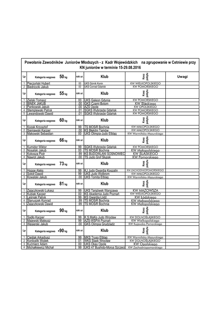 1 2 3 Lp 1 2 3 4 Lp 1 2 3 Lp 1 2 3 4 5 Lp 1 2 3 Lp 1 2 3 4 Zielski Tomasz BINEK JAKUB Pankowski Jakub Stemplewski Patryk Lewandowski Dawid Kategoria wagowa 00 .00 .00 .01 .01 60 kg Kozak Krzysztof Sieniawski Kacper Makowski Sebastian Kategoria wagowa 66 kg 73 kg Hoppe Aleks Sokół Dawid Kowalski Jakub Kategoria wagowa 81 kg Cieślak Arkadiusz Kordyalik Wojtek Kućmierz Adam Michałkiewicz Michał Klub rok ur. Klub 99 00 .99 .00 SGKS Wybrzeże Gdańsk TS MOSiR Bochnia KS BUDOWLANI SOSNOWIEC TS Judo Gryf Słupsk rok ur. Klub rok ur. 99 00 99 .99 .99 90 kg Sadło Kacper Majewski Mateusz Węsierski Jakub Kategoria wagowa UKS Galeon Gdynia GKS Czarni Bytom AZS Opole SGKS Wybrzeże Gdańsk SGKS Wybrzeże Gdańsk 99 KJ Judo Gwardia Koszalin 99 UKS Judo Wolbrom .00 UKS Tomita Elblag Zajączkowski Łukasz Kubiak Kacper Leśniak Patryk Stanuszek Konrad Zajączkowski Dawid Kategoria wagowa rok ur. rok ur. Klub UKS Targówek Warszawa KS Akademia Judo Poznań KS Gwardia Łódź TS MOSiR Bochnia TS MOSiR Bochnia Klub 99 K.S.MaKo Judo Wrocław 99 AZS-WSPiA Poznań .00 GKS Olimpia Grudziądz +90 kg rok ur. 99 01 00 99 Klub Kosz pobytu Klub 99 TS MOSiR Bochnia .00 KS Błękitni Tarnów 00 UKS Olimpia-Judo Elbląg Kumidor Wiktor Nosalski Jakub Kokosza Piotr Nawrot Jakub Kategoria wagowa rok ur. KW WIELKOPOLSKIEGO KW POMORSKIEGO KW POMORSKIEGO KW Śląskiego KW OPOLSKIEGO KW POMORSKIEGO KW POMORSKIEGO Kosz pobytu 55 kg UKS Górnik Konin UKS Conrad Gdańsk KW MAŁOPOLSKIEGO KW MAŁOPOLSKIEGO KW Warmińsko-Mazurskiego Kosz pobytu Lp Kategoria wagowa 00 00 Klub KW POMORSKIEGO KW Małopolskiego KW ŚLĄSKIEGO KW Pomorskiego Kosz pobytu 1 2 3 4 5 Pieczyński Hubert Biedrzycki Jakub rok ur. KW ZACHODNIOPOMORSKIEGO KW MAŁOPOLSKIEGO KW Warmińsko-Mazurskiego Kosz pobytu Lp 50 kg KW MAZOWSZA KW WIELKOPOLSKIEGO KW Łódzkiego KW Małopolskiego KW Małopolskiego Kosz pobytu 1 2 Kategoria wagowa KW DOLNOŚLĄSKIEGO KW Wielkopolskiego KW Kujawsko-Pomorskiego Kosz pobytu Lp Kosz pobytu Powołanie Zawodników Juniorów Młodszych - z Kadr Wojewódzkich na zgrupowanie w Cetniewie przy KN juniorów w terminie 15-29.08.2016 KW Warmińsko-Mazurskiego MKS Truso Elbląg KW DOLNOŚLĄSKIEGO WKS Śląsk Wrocław UKS Okay Opole KW Opolskiego UKS 47 Bushido-Morus Szczecin KW Zachodniopomorskiego Uwagi