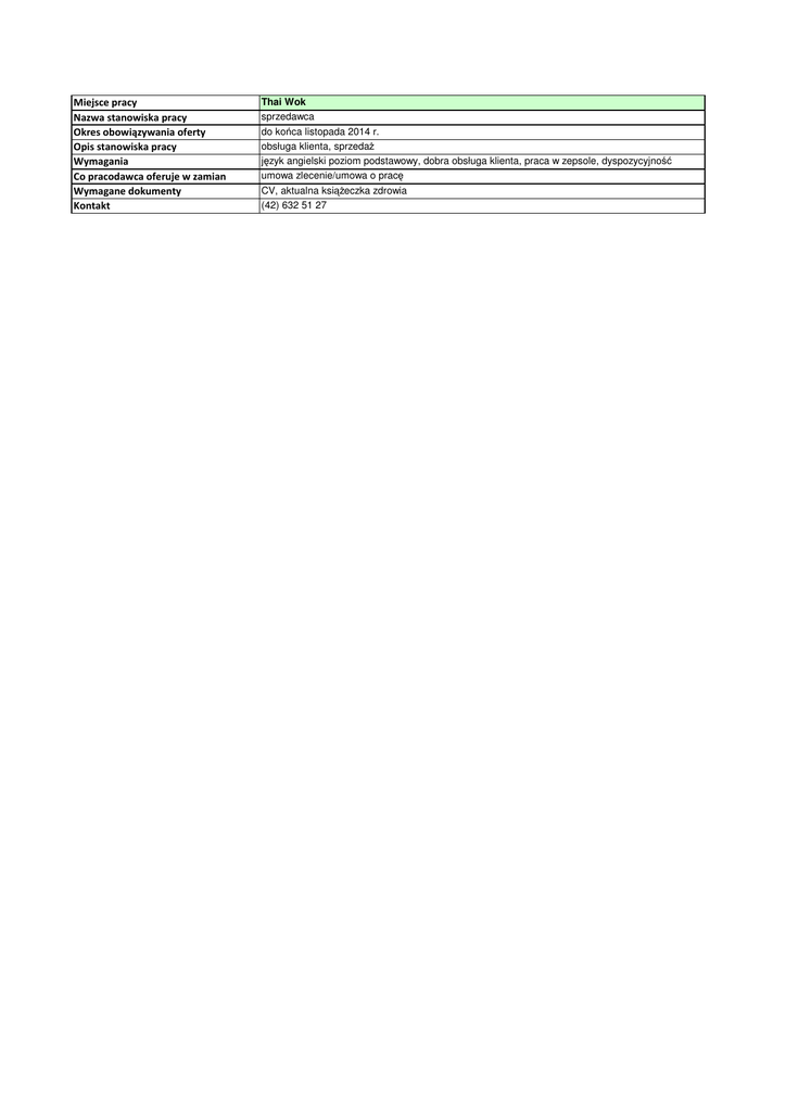 Miejsce pracy Nazwa stanowiska pracy Okres obowiązywania oferty Opis stanowiska pracy Wymagania Co pracodawca oferuje w zamian Wymagane dokumenty Kontakt Thai Wok sprzedawca do końca listopada 2014 r. obsługa klienta, sprzedaż język angielski poziom podstawowy, dobra obsługa klienta, praca w zepsole, dyspozycyjność umowa zlecenie/umowa o pracę CV, aktualna książeczka zdrowia (42) 632 51 27