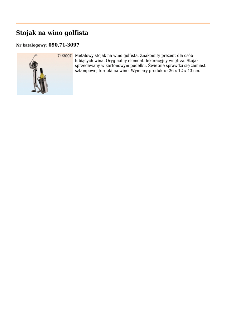 Stojak na wino golfista Nr katalogowy: 090,71-3097 Metalowy stojak na wino golfista. Znakomity prezent dla osób lubiących wina. Oryginalny element dekoracyjny wnętrza. Stojak sprzedawany w kartonowym pudełku. Świetnie sprawdzi się zamiast sztampowej torebki na wino. Wymiary produktu: 26 x 12 x 43 cm.