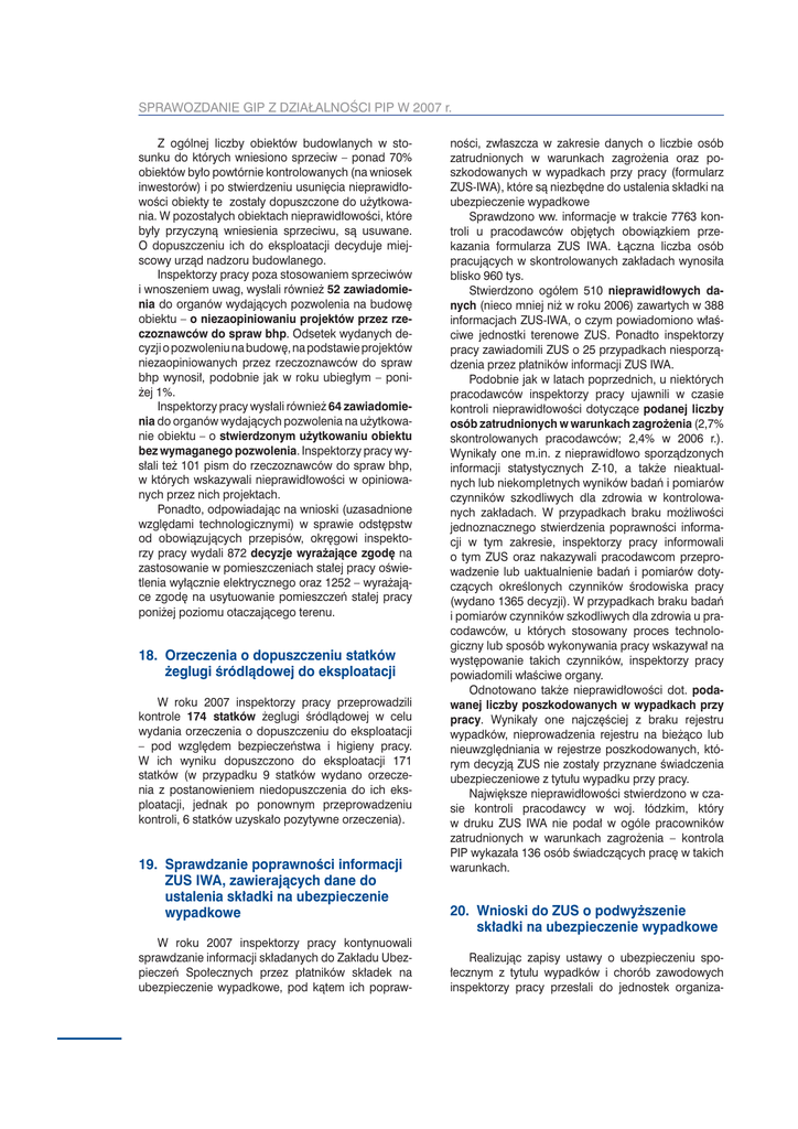 SPRAWOZDANIE GIP Z DZIAŁALNOŚCI PIP W 2007 r. Z ogólnej liczby obiektów budowlanych w stosunku do których wniesiono sprzeciw – ponad 70% obiektów było powtórnie kontrolowanych (na wniosek inwestorów) i po stwierdzeniu usunięcia nieprawidłowości obiekty te zostały dopuszczone do użytkowania. W pozostałych obiektach nieprawidłowości, które były przyczyną wniesienia sprzeciwu, są usuwane. O dopuszczeniu ich do eksploatacji decyduje miejscowy urząd nadzoru budowlanego. Inspektorzy pracy poza stosowaniem sprzeciwów i wnoszeniem uwag, wysłali również 52 zawiadomienia do organów wydających pozwolenia na budowę obiektu – o niezaopiniowaniu projektów przez rzeczoznawców do spraw bhp. Odsetek wydanych decyzji o pozwoleniu na budowę, na podstawie projektów niezaopiniowanych przez rzeczoznawców do spraw bhp wynosił, podobnie jak w roku ubiegłym – poniżej 1%. Inspektorzy pracy wysłali również 64 zawiadomienia do organów wydających pozwolenia na użytkowanie obiektu – o stwierdzonym użytkowaniu obiektu bez wymaganego pozwolenia. Inspektorzy pracy wysłali też 101 pism do rzeczoznawców do spraw bhp, w których wskazywali nieprawidłowości w opiniowanych przez nich projektach. Ponadto, odpowiadając na wnioski (uzasadnione względami technologicznymi) w sprawie odstępstw od obowiązujących przepisów, okręgowi inspektorzy pracy wydali 872 decyzje wyrażające zgodę na zastosowanie w pomieszczeniach stałej pracy oświetlenia wyłącznie elektrycznego oraz 1252 – wyrażające zgodę na usytuowanie pomieszczeń stałej pracy poniżej poziomu otaczającego terenu. 18. Orzeczenia o dopuszczeniu statków żeglugi śródlądowej do eksploatacji W roku 2007 inspektorzy pracy przeprowadzili kontrole 174 statków żeglugi śródlądowej w celu wydania orzeczenia o dopuszczeniu do eksploatacji – pod względem bezpieczeństwa i higieny pracy. W ich wyniku dopuszczono do eksploatacji 171 statków (w przypadku 9 statków wydano orzeczenia z postanowieniem niedopuszczenia do ich eksploatacji, jednak po ponownym przeprowadzeniu kontroli, 6 statków uzyskało pozytywne orzeczenia). 19. Sprawdzanie poprawności informacji ZUS IWA, zawierających dane do ustalenia składki na ubezpieczenie wypadkowe W roku 2007 inspektorzy pracy kontynuowali sprawdzanie informacji składanych do Zakładu Ubezpieczeń Społecznych przez płatników składek na ubezpieczenie wypadkowe, pod kątem ich popraw- ności, zwłaszcza w zakresie danych o liczbie osób zatrudnionych w warunkach zagrożenia oraz poszkodowanych w wypadkach przy pracy (formularz ZUS-IWA), które są niezbędne do ustalenia składki na ubezpieczenie wypadkowe Sprawdzono ww. informacje w trakcie 7763 kontroli u pracodawców objętych obowiązkiem przekazania formularza ZUS IWA. Łączna liczba osób pracujących w skontrolowanych zakładach wynosiła blisko 960 tys. Stwierdzono ogółem 510 nieprawidłowych danych (nieco mniej niż w roku 2006) zawartych w 388 informacjach ZUS-IWA, o czym powiadomiono właściwe jednostki terenowe ZUS. Ponadto inspektorzy pracy zawiadomili ZUS o 25 przypadkach niesporządzenia przez płatników informacji ZUS IWA. Podobnie jak w latach poprzednich, u niektórych pracodawców inspektorzy pracy ujawnili w czasie kontroli nieprawidłowości dotyczące podanej liczby osób zatrudnionych w warunkach zagrożenia (2,7% skontrolowanych pracodawców; 2,4% w 2006 r.). Wynikały one m.in. z nieprawidłowo sporządzonych informacji statystycznych Z-10, a także nieaktualnych lub niekompletnych wyników badań i pomiarów czynników szkodliwych dla zdrowia w kontrolowanych zakładach. W przypadkach braku możliwości jednoznacznego stwierdzenia poprawności informacji w tym zakresie, inspektorzy pracy informowali o tym ZUS oraz nakazywali pracodawcom przeprowadzenie lub uaktualnienie badań i pomiarów dotyczących określonych czynników środowiska pracy (wydano 1365 decyzji). W przypadkach braku badań i pomiarów czynników szkodliwych dla zdrowia u pracodawców, u których stosowany proces technologiczny lub sposób wykonywania pracy wskazywał na występowanie takich czynników, inspektorzy pracy powiadomili właściwe organy. Odnotowano także nieprawidłowości dot. podawanej liczby poszkodowanych w wypadkach przy pracy. Wynikały one najczęściej z braku rejestru wypadków, nieprowadzenia rejestru na bieżąco lub nieuwzględniania w rejestrze poszkodowanych, którym decyzją ZUS nie zostały przyznane świadczenia ubezpieczeniowe z tytułu wypadku przy pracy. Największe nieprawidłowości stwierdzono w czasie kontroli pracodawcy w woj. łódzkim, który w druku ZUS IWA nie podał w ogóle pracowników zatrudnionych w warunkach zagrożenia – kontrola PIP wykazała 136 osób świadczących pracę w takich warunkach. 20. Wnioski do ZUS o podwyższenie składki na ubezpieczenie wypadkowe Realizując zapisy ustawy o ubezpieczeniu społecznym z tytułu wypadków i chorób zawodowych inspektorzy pracy przesłali do jednostek organiza- DZIAŁALNOŚĆ KONTROLNA I PREWENCYJNA – INFORMACJE OGÓLNE cyjnych Zakładu Ubezpieczeń Społecznych wnioski o podwyższenie o 100% składki na ubezpieczenie wypadkowe dla 57 pracodawców. Wnioski te wynikały z rażących naruszeń przepisów o bezpieczeństwie i higienie pracy, stwierdzonych w czasie dwóch kolejnych kontroli. Wnioski kierowane do ZUS najczęściej dotyczyły pracodawców, którzy nie zapewniali swoim pracownikom bezpiecznej pracy na stanowiskach pracy na wysokości lub użytkowali maszyny i inne urządzenia techniczne bez urządzeń ochronnych, zabezpieczających przed ciężkimi uszkodzeniami ciała. Z informacji przekazanych przez ZUS na dzień 31.03.2008 r. wynika, że we wszystkich 57 przypadkach wydano stosowne decyzje o podwyższeniu płatnikom o 100% składki na ubezpieczenie wypadkowe, ustalanej na najbliższy rok składkowy. 21. Pisma o charakterze informacyjno-prewencyjnym Inspektorzy pracy w roku sprawozdawczym wysto