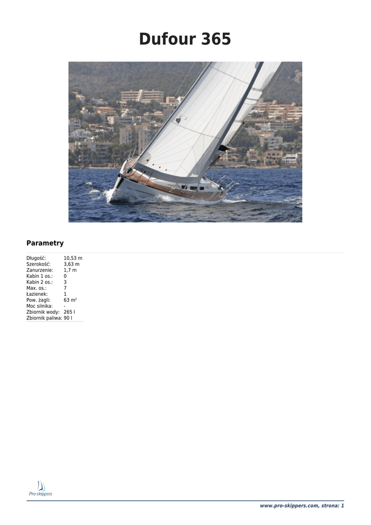 Dufour 365 Parametry Długość: 10,53 m Szerokość: 3,63 m Zanurzenie: 1,7 m Kabin 1 os.: 0 Kabin 2 os.: 3 Max. os.: 7 Łazienek: 1 Pow. żagli: 63 m2 Moc silnika: Zbiornik wody: 265 l Zbiornik paliwa: 90 l www.pro-skippers.com, strona: 1 www.pro-skippers.com, strona: 2 www.pro-skippers.com, strona: 3