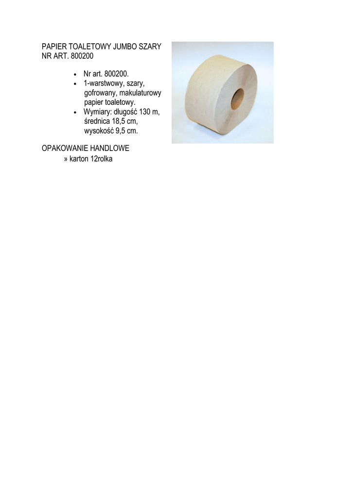 PAPIER TOALETOWY JUMBO SZARY NR ART. 800200 • • • Nr art. 800200. 1-warstwowy, szary, gofrowany, makulaturowy papier toaletowy. Wymiary: długość 130 m, średnica 18,5 cm, wysokość 9,5 cm. OPAKOWANIE HANDLOWE » karton 12rolka