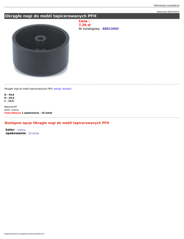 Informacje o produkcie Utworzono 08-03-2017 Okrągłe nogi do mebli tapicerowanych PFH Cena : 7,26 zł Nr katalogowy : 88813002 Okrągłe nogi do mebli tapicerowanych PFH, wersja "wysoka" D - 49,8 H - 29,6 L - 13,0 Materiał PP kolor: czarny Cena dotyczy 1 opakowania - 10 sztuk Dostępne opcje Okrągłe nogi do mebli tapicerowanych PFH kolor: czarny. opakowanie: 10 sztuk. Wygenerowano w programie www.oscGold.com