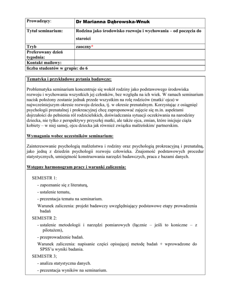 Prowadzący: Dr Marianna Dąbrowska-Wnuk Tytuł seminarium: Rodzina jako środowisko rozwoju i wychowania – od poczęcia do starości Tryb zaoczny* Preferowany dzień tygodnia: Kontakt mailowy: liczba studentów w grupie: do 6 Tematyka i przykładowe pytania badawcze: Problematyka seminarium koncentruje się wokół rodziny jako podstawowego środowiska rozwoju i wychowania wszystkich jej członków, bez względu na ich wiek. W ramach seminarium nacisk położony zostanie jednak przede wszystkim na rolę rodziców (matki/ ojca) w najwcześniejszym okresie rozwoju dziecka, tj. w okresie prenatalnym. Korzystając z osiągnięć psychologii prenatalnej i prokreacyjnej chcę zaproponować zajęcie się m.in. aspektami dojrzałości do pełnienia ról rodzicielskich, doświadczania sytuacji oczekiwania na narodziny dziecka, nie tylko z perspektywy przyszłej matki, ale także ojca, zmian, które inicjuje ciąża kobiety – w niej samej, ojcu dziecka jak również związku małżeńskim/ partnerskim. Wymagania wobec uczestników seminarium: Zainteresowanie psychologią małżeństwa i rodziny oraz psychologią prokreacyjną i prenatalną, jako jedną z dziedzin psychologii rozwoju człowieka. Znajomość podstawowych procedur statystycznych, umiejętność konstruowania narzędzi badawczych, praca z bazami danych. Wstępny harmonogram pracy i warunki zaliczenia: SEMESTR 1: - zapoznanie się z literaturą, - ustalenie tematu, - prezentacja tematu na seminarium. Warunek zaliczenia: projekt badawczy uwzględniający podstawowe etapy prowadzenia badań SEMESTR 2: - ustalenie metodologii i narzędzi pomiarowych (łącznie – jeśli to koniczne – z pilotażem), - przeprowadzenie badań. Warunek zaliczenia: napisanie części opisującej metodę badań + wprowadzone do SPSS’u wyniki badania. SEMESTR 3; - analiza statystyczna danych. - prezentacja wyników na seminarium. Warunek zaliczenia: napisanie część prezentującej wyniki badań. SEMESTR 4: - pisanie pracy, - prezentowanie kolejnych analiz i interpretacji. Warunek zaliczenia: gotowa praca magisterska. Podstawowa literatura do zajęć: 1. Bielawska-Batorowicz E.: Psychologiczne aspekty prokreacji, Katowice, 2006 2. Bielawska-Batorowicz E., Kornas-Biela D. (red.): Z zagadnień psychologii prokreacyjnej. Lublin, 1992 3. Bullinger H. Mężczyzna czy ojciec? Warszawa, 1997 4. Chołuj I. Urodzić razem i naturalnie. Mszczonów, 2008 5. Kornas-Biela D.: Wokół początku życia ludzkiego. Warszawa, 2002 6. Kornas-Biela D. Pedagogika prenatalna nowy obszar nauk o wychowaniu. Lublin, 2009 7. Plopa M. Psychologia rodziny. Teoria i badania. Kraków, 2005 8. Plopa M. Więzi w małżeństwie i rodzinie. metody badań. Kraków, 2008 Literatura uzupełniająca 1. Buss D.M. Ewolucja pożądania. Jak ludzie dobierają się w pary? Gdańsk 2003Lichtenberg-Kokoszka E. (2008). Ciąża zagadnieniem biomedycznym i psychopedagogicznym. Kraków, 2008 2. Maciarz A. (2004). Macierzyństwo w kontekście zmian społecznych. Warszawa, 2004 3. Relier J. P. Pokochać je nim się narodzi. O więzi matka-dziecko przed urodzeniem. Warszawa, 1994 4. Szczawińska M. Razem czy osobno? Poród rodzinny. Kraków, 2000 Biogram Promotora: Marianna Dąbrowska-Wnuk, psycholog, absolwentka położnictwa, wykładowca na Wydziale Pedagogiki i Psychologii Uniwersytetu Śląskiego w Katowicach. Zainteresowania naukowe koncentrują się wokół problemów mieszczących się w obszarze psychologii rozwoju człowieka (głównie psychologii prenatalnej), psychologii prokreacyjnej, ze szczególnym uwzględnieniem mężczyzny stającego się ojcem; psychologii małżeństwa i rodziny ze zwróceniem szczególnej uwagi na rolę i miejsce ojca w procesie wychowania. * niepotrzebne skreślić