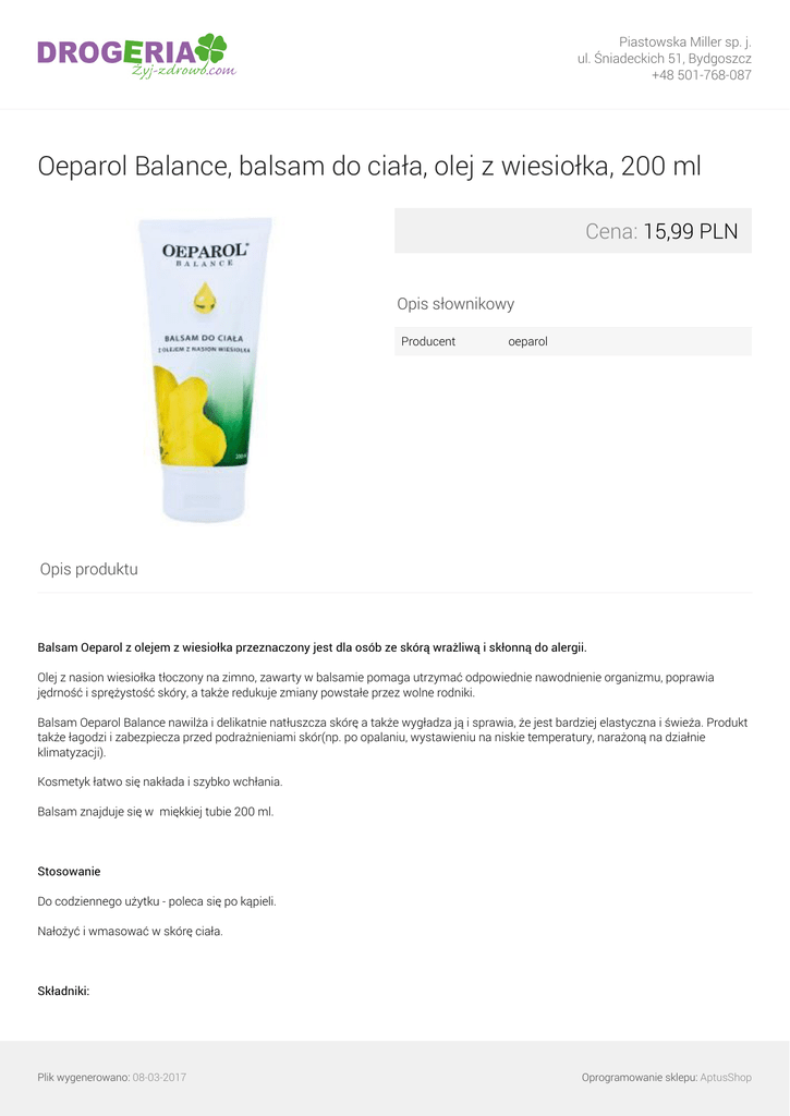 Piastowska Miller sp. j. ul. Śniadeckich 51, Bydgoszcz +48 501-768-087 Oeparol Balance, balsam do ciała, olej z wiesiołka, 200 ml Cena: 15,99 PLN Opis słownikowy Producent oeparol Opis produktu Balsam Oeparol z olejem z wiesiołka przeznaczony jest dla osób ze skórą wrażliwą i skłonną do alergii. Olej z nasion wiesiołka tłoczony na zimno, zawarty w balsamie pomaga utrzymać odpowiednie nawodnienie organizmu, poprawia jędrność i sprężystość skóry, a także redukuje zmiany powstałe przez wolne rodniki. Balsam Oeparol Balance nawilża i delikatnie natłuszcza skórę a także wygładza ją i sprawia, że jest bardziej elastyczna i świeża. Produkt także łagodzi i zabezpiecza przed podrażnieniami skór(np. po opalaniu, wystawieniu na niskie temperatury, narażoną na działnie klimatyzacji). Kosmetyk łatwo się nakłada i szybko wchłania. Balsam znajduje się w miękkiej tubie 200 ml. Stosowanie Do codziennego użytku - poleca się po kąpieli. Nałożyć i wmasować w skórę ciała. Składniki: Plik wygenerowano: 08-03-2017 Oprogramowanie sklepu: AptusShop Piastowska Miller sp. j. ul. Śniadeckich 51, Bydgoszcz +48 501-768-087 Aqua, Paraffinum Liquidum, Isopropyl Myristate, Oenothera Paradoxa Oil, Sorbitol, Cetearyl Alcohol, Propylene Glycol, Dimethicone, Cetyl Alcohol, Ceteareth-20, Glyceryl Stearate, Tocopheryl Acetate, Allantoin, Calendula Officinalis Extract, Parfum, Methylparaben, Chlorhexidine Digluconate, Propylparaben, Disodium EDTA, Sodium Citrate, BHA, PEG-8, Tocopherol, Ascorbyl Palmitate, Ascorbic Acid, Citric Acid, BEnzyl Salicylate, Hydroxyisohexyl 3-cyclohexane Carboxaldehyde, Linalool, Coumarin, Hydroxycitronellal. Plik wygenerowano: 08-03-2017 Powered by TCPDF (www.tcpdf.org) Oprogramowanie sklepu: AptusShop