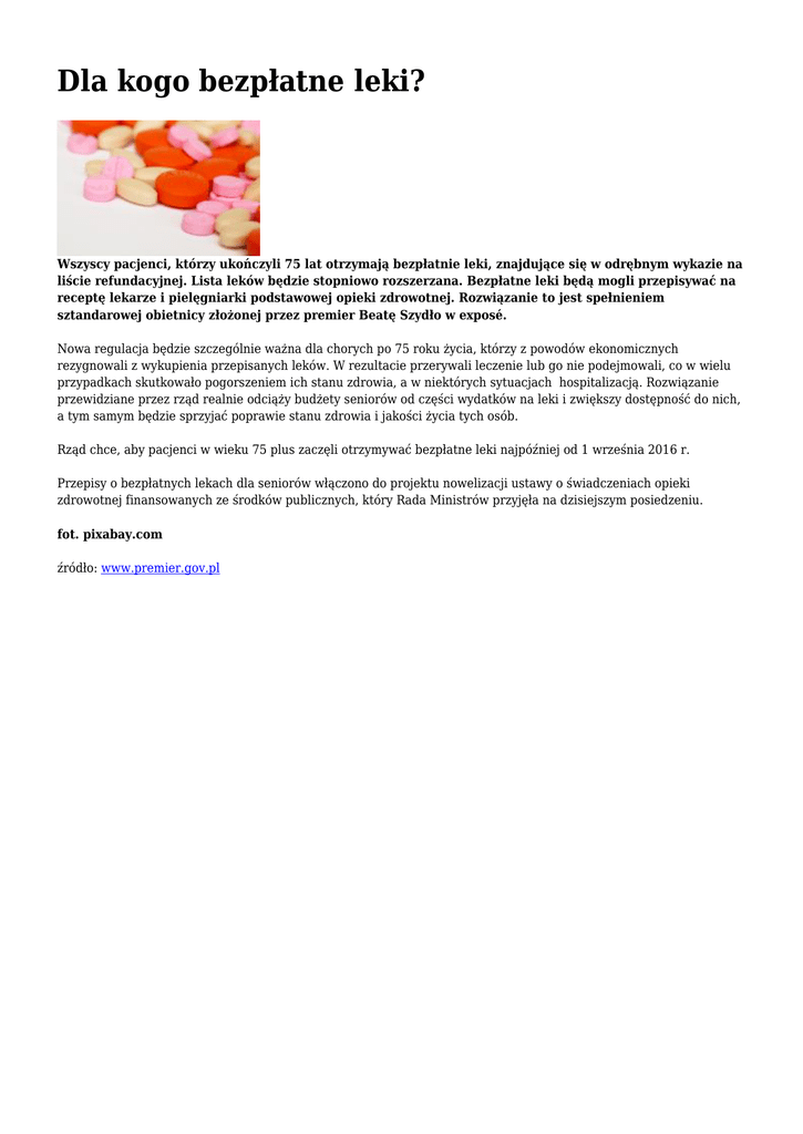 Dla kogo bezpłatne leki? Wszyscy pacjenci, którzy ukończyli 75 lat otrzymają bezpłatnie leki, znajdujące się w odrębnym wykazie na liście refundacyjnej. Lista leków będzie stopniowo rozszerzana. Bezpłatne leki będą mogli przepisywać na receptę lekarze i pielęgniarki podstawowej opieki zdrowotnej. Rozwiązanie to jest spełnieniem sztandarowej obietnicy złożonej przez premier Beatę Szydło w exposé. Nowa regulacja będzie szczególnie ważna dla chorych po 75 roku życia, którzy z powodów ekonomicznych rezygnowali z wykupienia przepisanych leków. W rezultacie przerywali leczenie lub go nie podejmowali, co w wielu przypadkach skutkowało pogorszeniem ich stanu zdrowia, a w niektórych sytuacjach hospitalizacją. Rozwiązanie przewidziane przez rząd realnie odciąży budżety seniorów od części wydatków na leki i zwiększy dostępność do nich, a tym samym będzie sprzyjać poprawie stanu zdrowia i jakości życia tych osób. Rząd chce, aby pacjenci w wieku 75 plus zaczęli otrzymywać bezpłatne leki najpóźniej od 1 września 2016 r. Przepisy o bezpłatnych lekach dla seniorów włączono do projektu nowelizacji ustawy o świadczeniach opieki zdrowotnej finansowanych ze środków publicznych, który Rada Ministrów przyjęła na dzisiejszym posiedzeniu. fot. pixabay.com źródło: www.premier.gov.pl