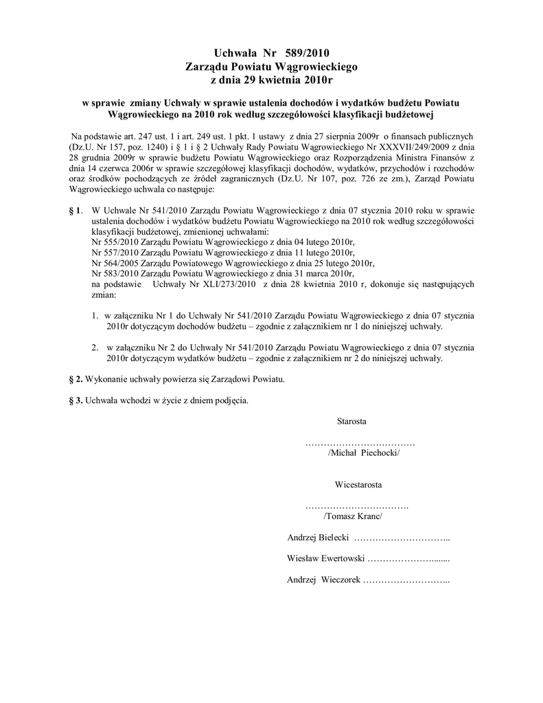 Uchwała Nr 589/2010 Zarządu Powiatu Wągrowieckiego z dnia 29
