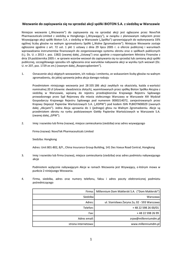 Wezwanie do zapisywania się na sprzedaż akcji spółki BIOTON S.A. z siedzibą w Warszawie Niniejsze wezwanie („Wezwanie”) do zapisywania się na sprzedaż akcji jest ogłaszane przez NovoTek Pharmaceuticals Limited z siedzibą w Hongkongu („Wzywający”), w związku z planowanym nabyciem przez Wzywającego akcji spółki Bioton S.A. z siedzibą w Warszawie („Spółka”) uprawniających do wykonywania 33% ogólnej liczby głosów na walnym zgromadzeniu Spółki („Walne Zgromadzenie”). Niniejsze Wezwanie zostaje ogłoszone zgodnie z art. 72 ust. 1 pkt 1 ustawy z dnia 29 lipca 2005 r. o ofercie publicznej i warunkach wprowadzania instrumentów finansowych do zorganizowanego systemu obrotu oraz o spółkach publicznych (t.j. Dz. U. z 2013 r. poz. 1382) (zwanej dalej „Ustawą”) oraz zgodnie z rozporządzeniem Ministra Finansów z dnia 19 października 2005 r. w sprawie wzorów wezwań do zapisywania się na sprzedaż lub zamianę akcji spółki publicznej, szczegółowego sposobu ich ogłaszania oraz warunków nabywania akcji w wyniku tych wezwań (Dz. U. nr 207, poz. 1729 ze zm.) (zwanym dalej „Rozporządzeniem”). 1. Oznaczenie akcji objętych wezwaniem, ich rodzaju i emitenta, ze wskazaniem liczby głosów na walnym zgromadzeniu, do jakiej uprawnia jedna akcja danego rodzaju Przedmiotem niniejszego wezwania jest 28 335 186 akcji zwykłych na okaziciela, każda o wartości nominalnej 20 zł (słownie: dwadzieścia złotych), wyemitowanych przez spółkę Bioton Spółka Akcyjna z siedzibą w Warszawie, wpisaną do rejestru przedsiębiorców Krajowego Rejestru Sądowego prowadzonego przez Sąd Rejonowy dla miasta stołecznego Warszawy w Warszawie XIII Wydział Gospodarczy Krajowego Rejestru Sądowego pod numerem 0000214072, zarejestrowanych przez Krajowy Depozyt Papierów Wartościowych S.A. („KDPW”) pod kodem ISIN PLBIOTN00029 (zwanych dalej „Akcjami”). Jedna Akcja uprawnia do 1 (jednego) głosu na Walnym Zgromadzeniu. Akcje są przedmiotem obrotu na rynku podstawowym Giełdy Papierów Wartościowych w Warszawie S.A. (zwanej dalej „GPW”). 2. Imię i nazwisko lub firma (nazwa), miejsce zamieszkania (siedziba) oraz adres wzywającego Firma (nazwa): NovoTek Pharmaceuticals Limited Siedziba: Hongkong Adres: Unit 801-802, 8/F., China Insurance Group Building, 141 Des Voeux Road Central, Hongkong 3. Imię i nazwisko lub firma (nazwa), miejsce zamieszkania (siedziba) oraz adres podmiotu nabywającego akcje Podmiotem wyłącznie nabywającym Akcje w ramach Wezwania jest Wzywający, o którym mowa w punkcie 2 niniejszego Wezwania. 4. Firma, siedziba, adres oraz numery telefonu, faksu i adres poczty elektronicznej podmiotu pośredniczącego Firma: Millennium Dom Maklerski S.A. (“Dom Maklerski”) Siedziba Warszawa Adres: ul. Stanisława Żaryna 2a, 02 - 593 Warszawa Telefon: + 48 22 598 26 00/01 Fax: + 48 22 598 26 99 Adres email: [email protected] strona internetowa: www.millenniumdm.pl 1 Informacja o warunkach Wezwania i zasadach przyjmowania zapisów jest dostępna w Punktach Obsługi Klienta, o których mowa w pkt 19 oraz na stronie internetowej: www.millenniumdm.pl 5. Liczba głosów, jaką podmiot nabywający akcje zamierza uzyskać w wyniku wezwania i odpowiadająca jej liczba akcji, jaką zamierza nabyć Zamiarem Wzywającego jest nieprzekraczanie progu 33% ogólnej liczby głosów na Walnym Zgromadzeniu, w związku z czym Wzywający ogłosił niniejsze Wezwanie do zapisywania się na sprzedaż 28 335 186 Akcji, co odpowiada 33% kapitału zakładowego Spółki, dających łącznie prawo do wykonywania 28 335 186 głosów na Walnym Zgromadzeniu, stanowiących 33% ogólnej liczby głosów na Walnym Zgromadzeniu. 6. Wskazanie minimalnej liczby akcji objętej zapisami, po której osiągnięciu podmiot nabywający akcje zobowiązuje się nabyć te akcje, i odpowiadającej jej liczby głosów - jeżeli została określona Wzywający, jako podmiot nabywający Akcje, zamierza nabyć Akcje wyłącznie, jeżeli na koniec okresu przyjmowania zapisów, złożone zapisy obejmować będą na nie mniej niż 25 759 260 Akcji, uprawniających do 25 759 260 głosów na Walnym Zgromadzeniu, co stanowi 30% ogólnej liczby głosów na Walnym Zgromadzeniu. Wzywający, jako podmiot nabywający Akcje, może odstąpić od wyżej wymienionego wymogu nabycia minimalnej liczby Akcji objętych zapisami i może nabyć Akcje, nawet jeżeli na koniec okresu przyjmowania zapisów liczba Akcji objętych zapisami będzie mniejsza niż 25 759 260. Zgodnie z postanowieniami § 9 ust. 2 pkt 1 Rozporządzenia, Wzywający, jako podmiot nabywający Akcje, zastrzega sobie prawo do zmiany minimalnej liczby Akcji objętych zapisami, po osiągnięciu której Wzywający zobowiązuje się nabyć te Akcje. Informacja o ziszczeniu się lub nieziszczeniu powyższego warunku zostanie przekazana agencji informacyjnej niezwłocznie oraz opublikowana w co najmniej jednym dzienniku o zasięgu ogólnopolskim, nie później niż w terminie dwóch dni roboczych po dniu, w którym warunek ten powinien się ziścić. 7. Procentowa liczba głosów, jaką podmiot nabywający akcje zamierza osiągnąć w wyniku wezwania, i odpowiadająca jej liczba akcji Informacje na temat procentowej liczby głosów, jaką Wzywający, jako podmiot nabywający Akcje, zamierza osiągnąć w wyniku Wezwania, i odpowiadającej jej liczbie Akcji, znajdują się w pkt. 5 niniejszego Wezwania. 8. Określenie proporcji, w jakich nastąpi nabycie akcji przez każdy z podmiotów nabywających akcje jeżeli akcje zamierza nabywać więcej niż jeden podmiot Nie dotyczy, Wzywający jest jedynym podmiotem, który zamierza nabyć Akcje na podstawie niniejszego Wezwania. 9. Cena, po której nabywane będą akcje objęte wezwaniem Cena, po której nabywane będą Akcje wynosi 7,00 zł (słownie: siedem złotych 0/100) za jedną Akcję („Cena Akcji”). 10. Cena, od której, zgodnie z art. 79 ust. 1 i 2 ustawy, nie może być niższa cena określ